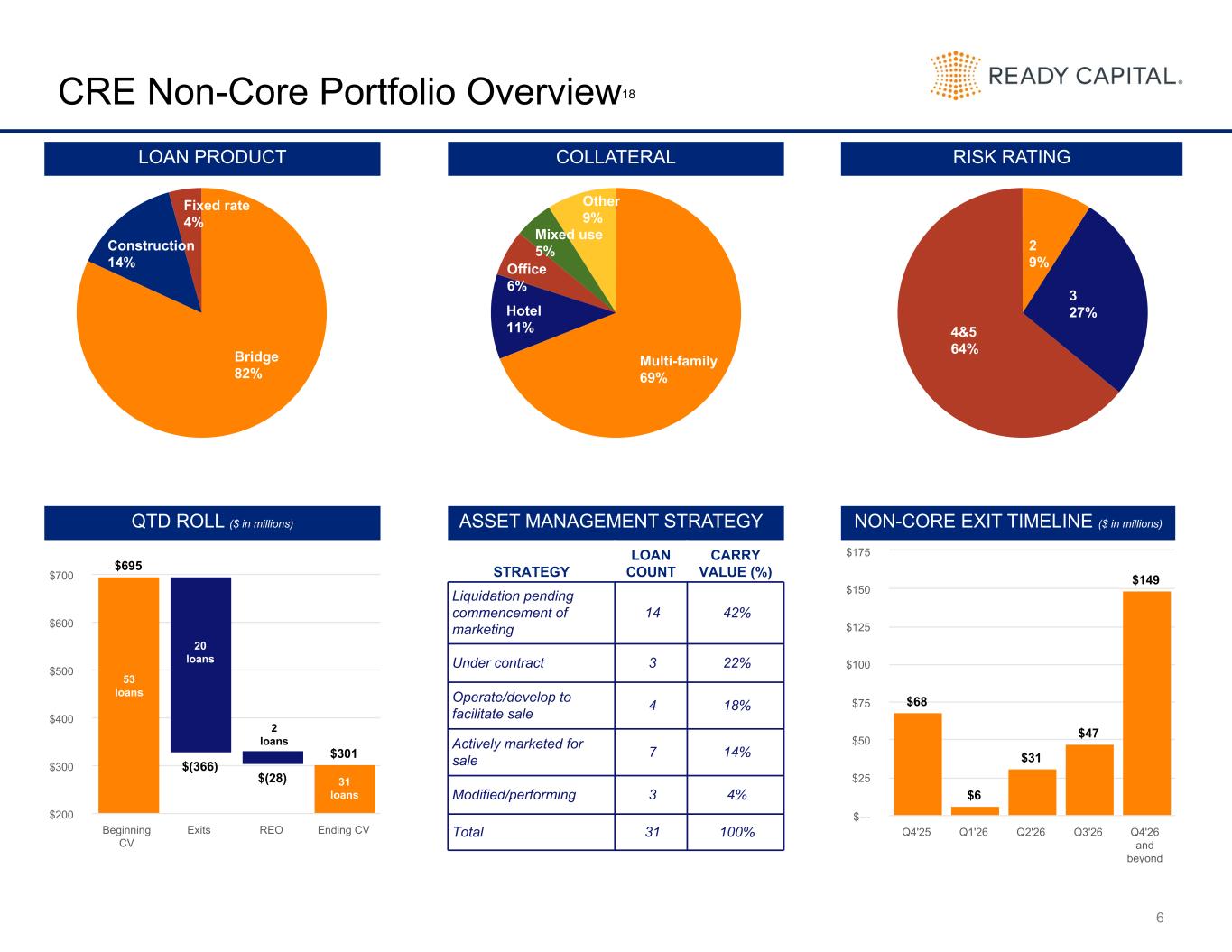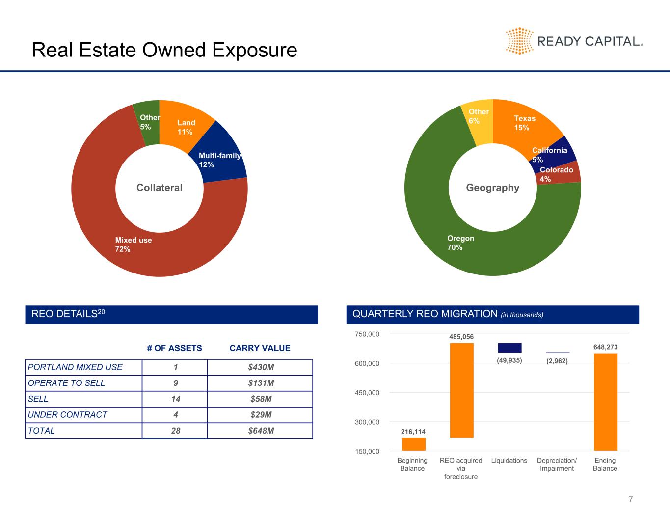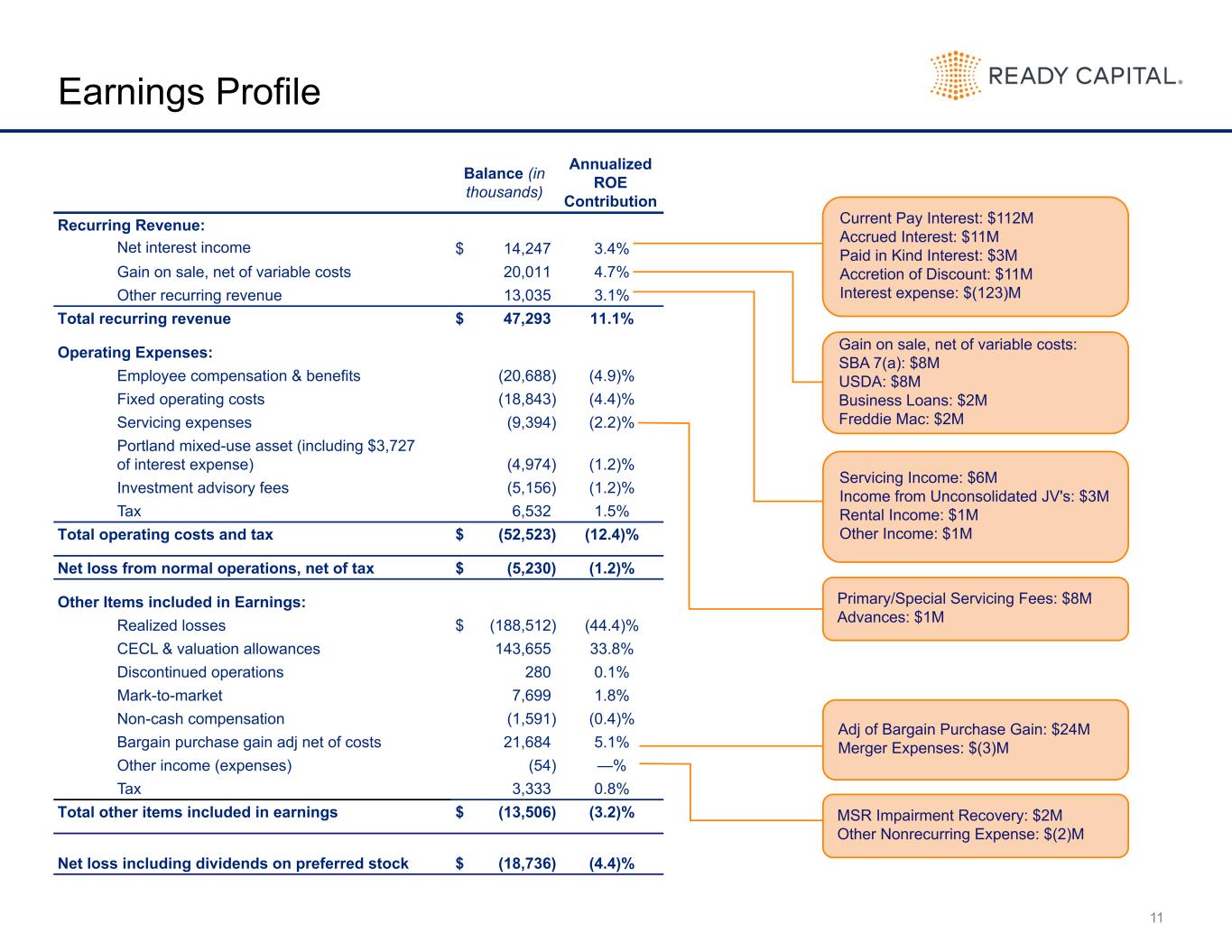 20 Distributable Earnings Reconciliation by Quarter The Company believes that this non-U.S. GAAP financial information, in addition to the related U.S. GAAP measures, provides investors greater transparency into the information used by management in its financial and operational decision- making, including the determination of dividends. However, because Distributable Earnings is an incomplete measure of the Company's financial performance and involves differences from net income computed in accordance with U.S. GAAP, it should be considered along with, but not as an alternative to, the Company's net income computed in accordance with U.S. GAAP as a measure of the Company's financial performance. In addition, because not all companies use identical calculations, the Company's presentation of Distributable Earnings may not be comparable to other similarly-titled measures of other companies. We calculate Distributable earnings as GAAP net income (loss) excluding the following: i) any unrealized gains or losses on certain MBS not retained by us as part of our loan origination businesses ii) any realized gains or losses on sales of certain MBS iii) any unrealized gains or losses on Residential MSRs from discontinued operations iv) any unrealized change in current expected credit loss reserve and valuation allowances v) any unrealized gains or losses on de-designated cash flow hedges vi) any unrealized gains or losses on foreign exchange hedges vii) any unrealized gains or losses on certain unconsolidated joint ventures viii) any non-cash compensation expense related to stock-based incentive plan ix) any unrealized gains or losses on preferred equity, at fair value x) any unrealized gain or losses or other non-cash items related to real estate owned xi) one-time non-recurring gains or losses, such as gains or losses on discontinued operations, bargain purchase gains, or merger related expenses In calculating Distributable Earnings, Net Income (in accordance with U.S. GAAP) is adjusted to exclude unrealized gains and losses on MBS acquired by the Company in the secondary market but is not adjusted to exclude unrealized gains and losses on MBS retained by Ready Capital as part of its loan origination businesses, where the Company transfers originated loans into an MBS securitization and the Company retains an interest in the securitization. In calculating Distributable Earnings, the Company does not adjust Net Income (in accordance with U.S. GAAP) to take into account unrealized gains and losses on MBS retained by us as part of the loan origination businesses because the unrealized gains and losses that are generated in the loan origination and securitization process are considered to be a fundamental part of this business and an indicator of the ongoing performance and credit quality of the Company’s historical loan originations. In calculating Distributable Earnings, Net Income (in accordance with U.S. GAAP) is adjusted to exclude realized gains and losses on certain MBS securities considered to be non-distributable. Certain MBS positions are considered to be non-distributable due to a variety of reasons which may include collateral type, duration, and size. In addition, in calculating Distributable Earnings, Net Income (in accordance with U.S. GAAP) is adjusted to exclude unrealized gains or losses on residential MSRs, held at fair value from discontinued operations. In calculating Distributable Earnings, the Company does not exclude realized gains or losses on either commercial MSRs as servicing income is a fundamental part of Ready Capital’s business and is an indicator of the ongoing performance. To qualify as a REIT, the Company must distribute to its stockholders each calendar year at least 90% of its REIT taxable income (including certain items of non-cash income), determined without regard to the deduction for dividends paid and excluding net capital gain. There are certain items, including net income generated from the creation of MSRs, that are included in distributable earnings but are not included in the calculation of the current year’s taxable income. These differences may result in certain items that are recognized in the current period’s calculation of distributable earnings not being included in taxable income, and thus not subject to the REIT dividend distribution requirement until future years. (In thousands, except share data) Q3 2024 Q4 2024 Q1 2025 Q2 2025 Q3 2025 Net Income (loss) $ (7,279) $ (314,751) $ 81,965 $ (53,677) $ (16,737) Reconciling items: Unrealized (gain) loss on MSR - discontinued operations $ — $ 33,175 $ 8,952 $ — $ — Unrealized (gain) loss on joint ventures 2,173 (5,015) 5,639 1,019 (4,336) Increase (decrease) in CECL reserve 52,442 277,277 (112,127) 487 32,844 Increase (decrease) in valuation allowance (71,060) (31,229) 99,718 39,746 (178,225) Non-recurring REO impairment 525 31,175 2,346 4,418 1,862 Non-cash compensation 1,916 2,826 1,785 1,634 1,591 Unrealized (gain) loss on preferred equity, at fair value — 15,613 — 4,227 (1,949) Merger transaction costs and other non-recurring expenses 4,070 6,579 2,993 3,661 2,220 Bargain purchase (gain) loss (32,165) — (102,471) 14,381 (24,472) Depreciation and amortization on real estate owned — — — — 1,100 Realized losses on sale of investments 109,675 51,688 20,084 8,896 188,512 Total reconciling items $ 67,576 $ 382,089 $ (73,081) $ 78,469 $ 19,147 Income tax adjustments (13,739) (22,825) (4,744) (37,496) (4,580) Distributable earnings (loss) before realized losses $ 46,558 $ 44,513 $ 4,140 $ (12,704) $ (2,170) Realized losses on sale of investments, net of tax (89,072) (44,246) (15,524) (7,088) (147,422) Distributable earnings (loss) $ (42,514) $ 267 $ (11,384) $ (19,792) $ (149,592) Less: Distributable earnings attributable to non-controlling interests 1,766 3,113 1,985 1,990 1,473 Less: Income attributable to participating shares 242 249 229 215 211 Less: Dividends on preferred