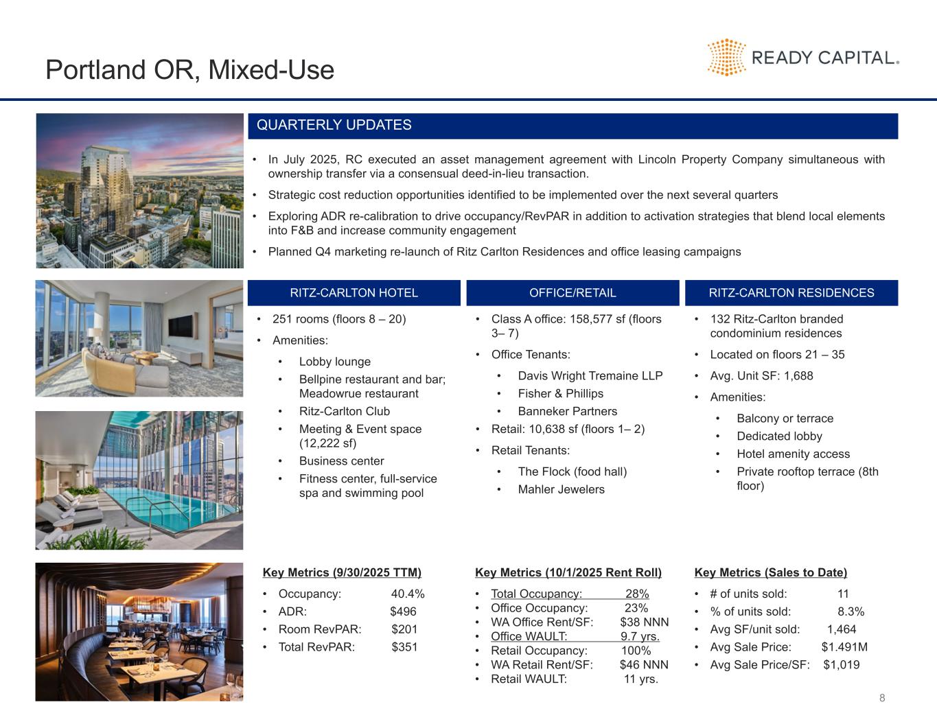 8 Portland OR, Mixed-Use • In July 2025, RC executed an asset management agreement with Lincoln Property Company simultaneous with ownership transfer via a consensual deed-in-lieu transaction. • Strategic cost reduction opportunities identified to be implemented over the next several quarters • Exploring ADR re-calibration to drive occupancy/RevPAR in addition to activation strategies that blend local elements into F&B and increase community engagement • Planned Q4 marketing re-launch of Ritz Carlton Residences and office leasing campaigns QUARTERLY UPDATES RITZ-CARLTON HOTEL OFFICE/RETAIL RITZ-CARLTON RESIDENCES • 251 rooms (floors 8 – 20) • Amenities: • Lobby lounge • Bellpine restaurant and bar; Meadowrue restaurant • Ritz-Carlton Club • Meeting & Event space (12,222 sf) • Business center • Fitness center, full-service spa and swimming pool • Class A office: 158,577 sf (floors 3– 7) • Office Tenants: • Davis Wright Tremaine LLP • Fisher & Phillips • Banneker Partners • Retail: 10,638 sf (floors 1– 2) • Retail Tenants: • The Flock (food hall) • Mahler Jewelers • 132 Ritz-Carlton branded condominium residences • Located on floors 21 – 35 • Avg. Unit SF: 1,688 • Amenities: • Balcony or terrace • Dedicated lobby • Hotel amenity access • Private rooftop terrace (8th floor) Key Metrics (9/30/2025 TTM) • Occupancy: 40.4% • ADR: $496 • Room RevPAR: $201 • Total RevPAR: $351 Key Metrics (10/1/2025 Rent Roll) • Total Occupancy: 28% • Office Occupancy: 23% • WA Office Rent/SF: $38 NNN • Office WAULT: 9.7 yrs. • Retail Occupancy: 100% • WA Retail Rent/SF: $46 NNN • Retail WAULT: 11 yrs. Key Metrics (Sales to Date) • # of units sold: 11 • % of units sold: 8.3% • Avg SF/unit sold: 1,464 • Avg Sale Price: $1.491M • Avg Sale Price/SF: $1,019