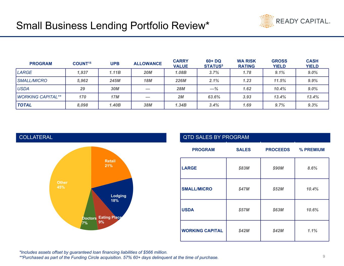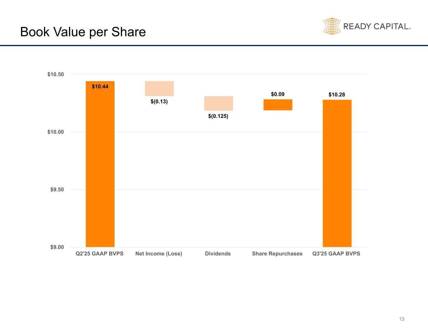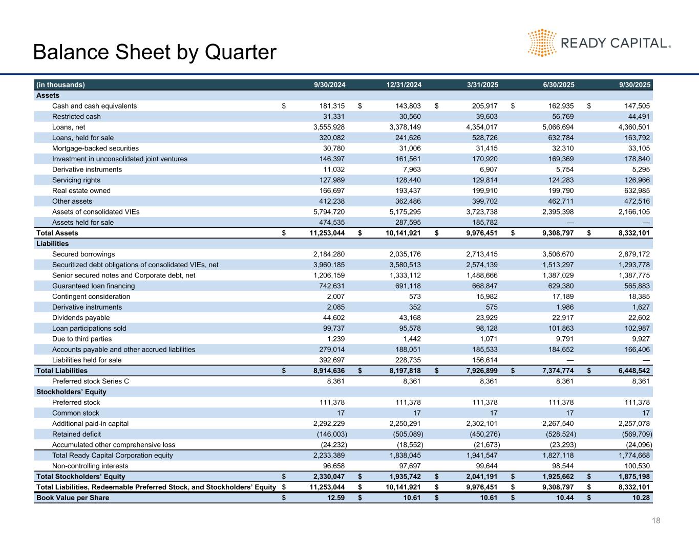 18 Balance Sheet by Quarter (in thousands) 9/30/2024 12/31/2024 3/31/2025 6/30/2025 9/30/2025 Assets Cash and cash equivalents $ 181,315 $ 143,803 $ 205,917 $ 162,935 $ 147,505 Restricted cash 31,331 30,560 39,603 56,769 44,491 Loans, net 3,555,928 3,378,149 4,354,017 5,066,694 4,360,501 Loans, held for sale 320,082 241,626 528,726 632,784 163,792 Mortgage-backed securities 30,780 31,006 31,415 32,310 33,105 Investment in unconsolidated joint ventures 146,397 161,561 170,920 169,369 178,840 Derivative instruments 11,032 7,963 6,907 5,754 5,295 Servicing rights 127,989 128,440 129,814 124,283 126,966 Real estate owned 166,697 193,437 199,910 199,790 632,985 Other assets 412,238 362,486 399,702 462,711 472,516 Assets of consolidated VIEs 5,794,720 5,175,295 3,723,738 2,395,398 2,166,105 Assets held for sale 474,535 287,595 185,782 — — Total Assets $ 11,253,044 $ 10,141,921 $ 9,976,451 $ 9,308,797 $ 8,332,101 Liabilities Secured borrowings 2,184,280 2,035,176 2,713,415 3,506,670 2,879,172 Securitized debt obligations of consolidated VIEs, net 3,960,185 3,580,513 2,574,139 1,513,297 1,293,778 Senior secured notes and Corporate debt, net 1,206,159 1,333,112 1,488,666 1,387,029 1,387,775 Guaranteed loan financing 742,631 691,118 668,847 629,380 565,883 Contingent consideration 2,007 573 15,982 17,189 18,385 Derivative instruments 2,085 352 575 1,986 1,627 Dividends payable 44,602 43,168 23,929 22,917 22,602 Loan participations sold 99,737 95,578 98,128 101,863 102,987 Due to third parties 1,239 1,442 1,071 9,791 9,927 Accounts payable and other accrued liabilities 279,014 188,051 185,533 184,652 166,406 Liabilities held for sale 392,697 228,735 156,614 — — Total Liabilities $ 8,914,636 $ 8,197,818 $ 7,926,899 $ 7,374,774 $ 6,448,542 Preferred stock Series C 8,361 8,361 8,361 8,361 8,361 Stockholders’ Equity Preferred stock 111,378 111,378 111,378 111,378 111,378 Common stock 17 17 17 17 17 Additional paid-in capital 2,292,229 2,250,291 2,302,101 2,267,540 2,257,078 Retained deficit (146,003) (505,089) (450,276) (528,524) (569,709) Accumulated other comprehensive loss (24,232) (18,552) (21,673) (23,293) (24,096) Total Ready Capital Corporation equity 2,233,389 1,838,045 1,941,547 1,827,118 1,774,668 Non-controlling interests 96,658 97,697 99,644 98,544 100,530 Total Stockholders’ Equity $ 2,330,047 $ 1,935,742 $ 2,041,191 $ 1,925,662 $ 1,875,198 Total Liabilities, Redeemable Preferred Stock, and Stockholders’ Equity $ 11,253,044 $ 10,141,921 $ 9,976,451 $ 9,308,797 $ 8,332,101 Book Value per Share $ 12.59 $ 10.61 $ 10.61 $ 10.44 $ 10.28