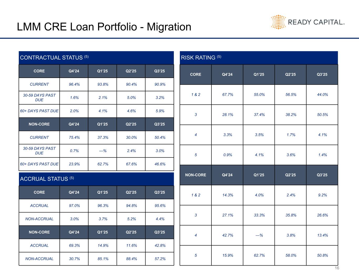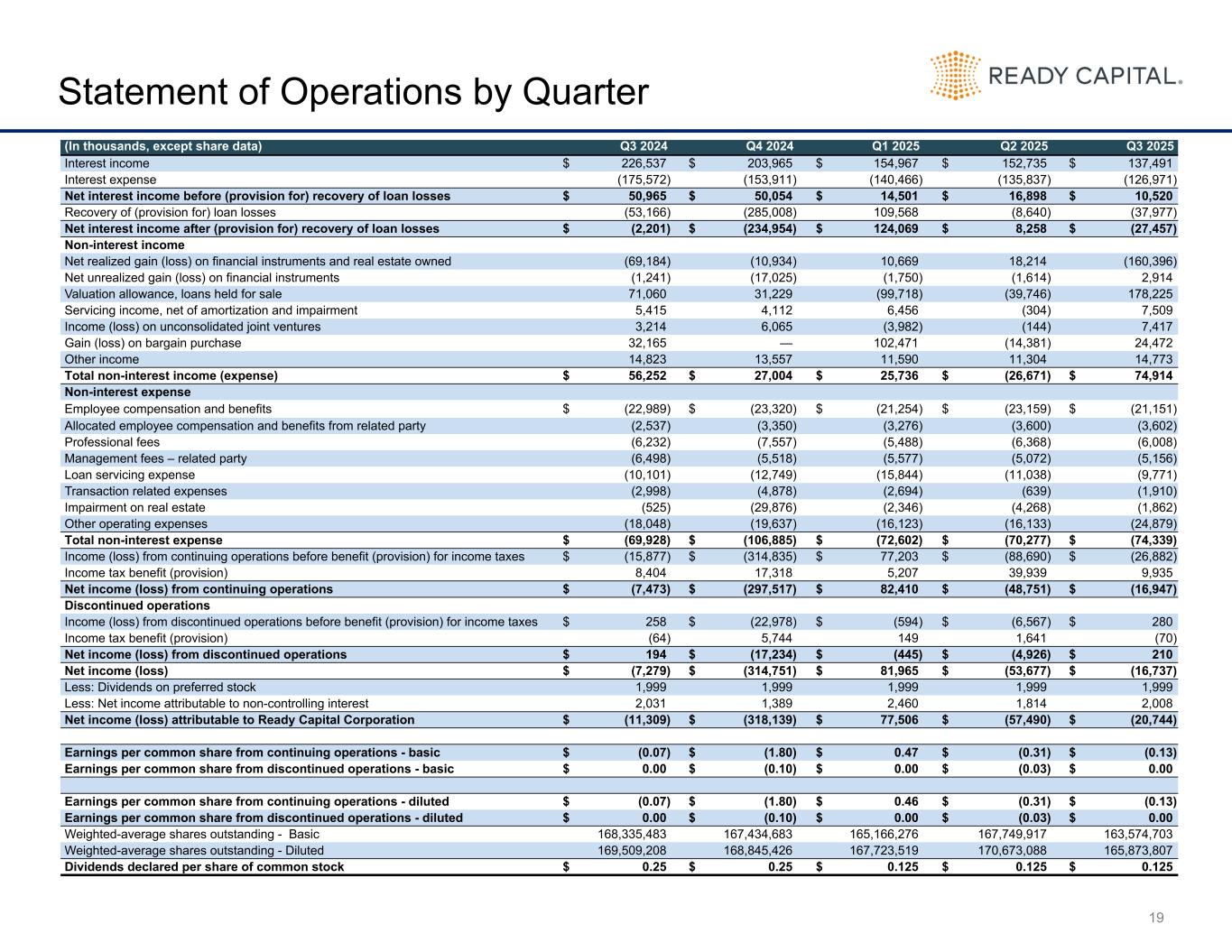 19 Statement of Operations by Quarter (In thousands, except share data) Q3 2024 Q4 2024 Q1 2025 Q2 2025 Q3 2025 Interest income $ 226,537 $ 203,965 $ 154,967 $ 152,735 $ 137,491 Interest expense (175,572) (153,911) (140,466) (135,837) (126,971) Net interest income before (provision for) recovery of loan losses $ 50,965 $ 50,054 $ 14,501 $ 16,898 $ 10,520 Recovery of (provision for) loan losses (53,166) (285,008) 109,568 (8,640) (37,977) Net interest income after (provision for) recovery of loan losses $ (2,201) $ (234,954) $ 124,069 $ 8,258 $ (27,457) Non-interest income Net realized gain (loss) on financial instruments and real estate owned (69,184) (10,934) 10,669 18,214 (160,396) Net unrealized gain (loss) on financial instruments (1,241) (17,025) (1,750) (1,614) 2,914 Valuation allowance, loans held for sale 71,060 31,229 (99,718) (39,746) 178,225 Servicing income, net of amortization and impairment 5,415 4,112 6,456 (304) 7,509 Income (loss) on unconsolidated joint ventures 3,214 6,065 (3,982) (144) 7,417 Gain (loss) on bargain purchase 32,165 — 102,471 (14,381) 24,472 Other income 14,823 13,557 11,590 11,304 14,773 Total non-interest income (expense) $ 56,252 $ 27,004 $ 25,736 $ (26,671) $ 74,914 Non-interest expense Employee compensation and benefits $ (22,989) $ (23,320) $ (21,254) $ (23,159) $ (21,151) Allocated employee compensation and benefits from related party (2,537) (3,350) (3,276) (3,600) (3,602) Professional fees (6,232) (7,557) (5,488) (6,368) (6,008) Management fees – related party (6,498) (5,518) (5,577) (5,072) (5,156) Loan servicing expense (10,101) (12,749) (15,844) (11,038) (9,771) Transaction related expenses (2,998) (4,878) (2,694) (639) (1,910) Impairment on real estate (525) (29,876) (2,346) (4,268) (1,862) Other operating expenses (18,048) (19,637) (16,123) (16,133) (24,879) Total non-interest expense $ (69,928) $ (106,885) $ (72,602) $ (70,277) $ (74,339) Income (loss) from continuing operations before benefit (provision) for income taxes $ (15,877) $ (314,835) $ 77,203 $ (88,690) $ (26,882) Income tax benefit (provision) 8,404 17,318 5,207 39,939 9,935 Net income (loss) from continuing operations $ (7,473) $ (297,517) $ 82,410 $ (48,751) $ (16,947) Discontinued operations Income (loss) from discontinued operations before benefit (provision) for income taxes $ 258 $ (22,978) $ (594) $ (6,567) $ 280 Income tax benefit (provision) (64) 5,744 149 1,641 (70) Net income (loss) from discontinued operations $ 194 $ (17,234) $ (445) $ (4,926) $ 210 Net income (loss) $ (7,279) $ (314,751) $ 81,965 $ (53,677) $ (16,737) Less: Dividends on preferred stock 1,999 1,999 1,999 1,999 1,999 Less: Net income attributable to non-controlling interest 2,031 1,389 2,460 1,814 2,008 Net income (loss) attributable to Ready Capital Corporation $ (11,309) $ (318,139) $ 77,506 $ (57,490) $ (20,744) Earnings per common share from continuing operations - basic $ (0.07) $ (1.80) $ 0.47 $ (0.31) $ (0.13) Earnings per common share from discontinued operations - basic $ 0.00 $ (0.10) $ 0.00 $ (0.03) $ 0.00 Earnings per common share from continuing operations - diluted $ (0.07) $ (1.80) $ 0.46 $ (0.31) $ (0.13) Earnings per common share from discontinued operations - diluted $ 0.00 $ (0.10) $ 0.00 $ (0.03) $ 0.00 Weighted-average shares outstanding - Basic 168,335,483 167,434,683 165,166,276 167,749,917 163,574,703 Weighted-average shares outstanding - Diluted 169,509,208 168,845,426 167,723,519 170,673,088 165,873,807 Dividends declared per share of common stock $ 0.25 $ 0.25 $ 0.125 $ 0.125 $ 0.125