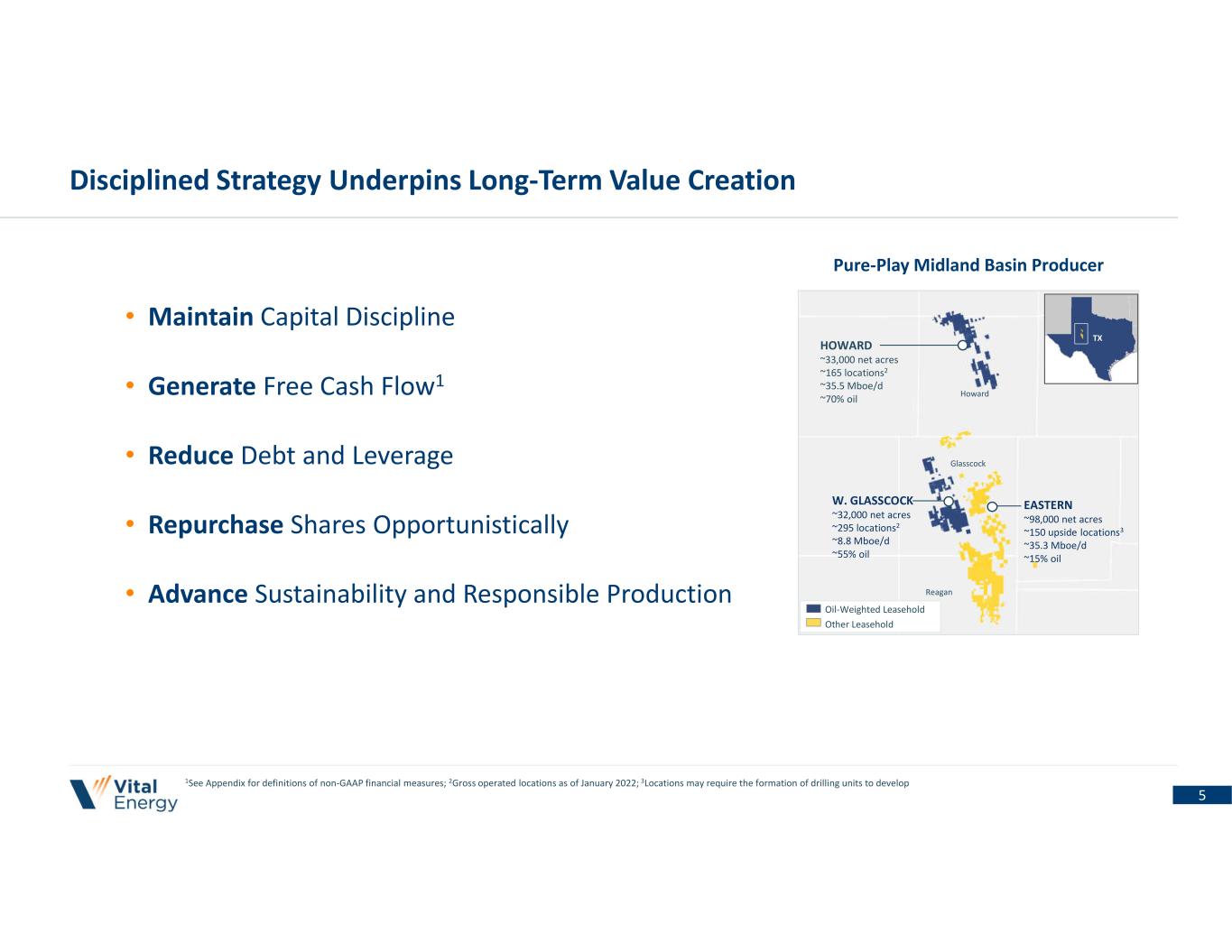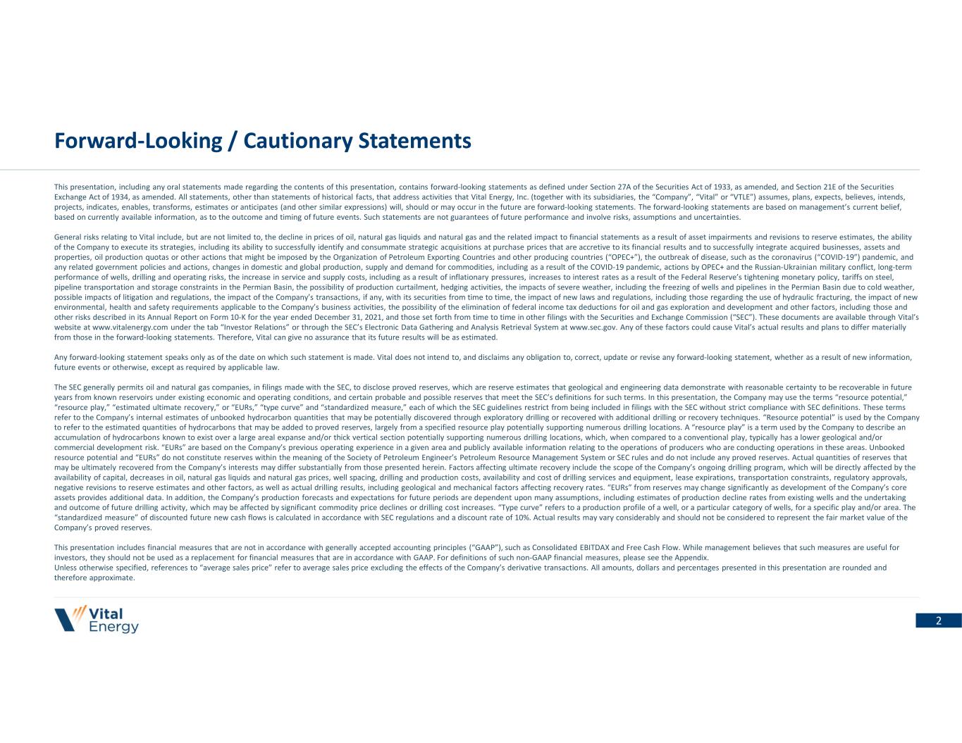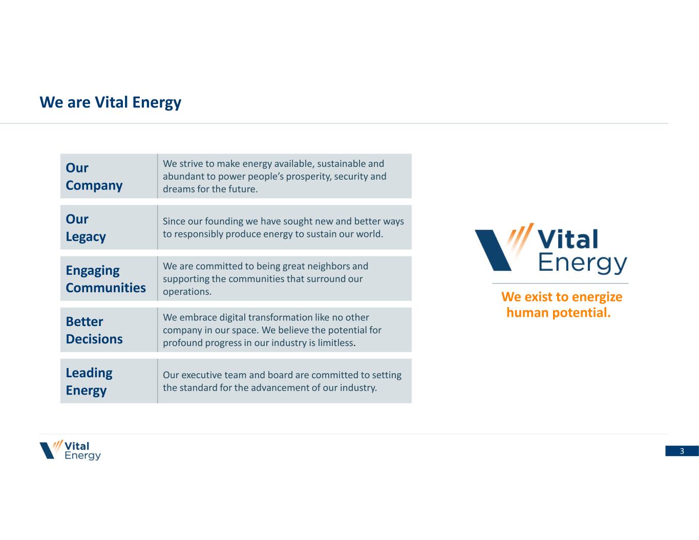 2 Forward-Looking / Cautionary Statements This presentation, including any oral statements made regarding the contents of this presentation, contains forward-looking statements as defined under Section 27A of the Securities Act of 1933, as amended, and Section 21E of the Securities Exchange Act of 1934, as amended. All statements, other than statements of historical facts, that address activities that Vital Energy, Inc. (together with its subsidiaries, the “Company”, “Vital” or “VTLE”) assumes, plans, expects, believes, intends, projects, indicates, enables, transforms, estimates or anticipates (and other similar expressions) will, should or may occur in the future are forward-looking statements. The forward-looking statements are based on management’s current belief, based on currently available information, as to the outcome and timing of future events. Such statements are not guarantees of future performance and involve risks, assumptions and uncertainties. General risks relating to Vital include, but are not limited to, the decline in prices of oil, natural gas liquids and natural gas and the related impact to financial statements as a result of asset impairments and revisions to reserve estimates, the ability of the Company to execute its strategies, including its ability to successfully identify and consummate strategic acquisitions at purchase prices that are accretive to its financial results and to successfully integrate acquired businesses, assets and properties, oil production quotas or other actions that might be imposed by the Organization of Petroleum Exporting Countries and other producing countries (“OPEC+”), the outbreak of disease, such as the coronavirus (“COVID-19”) pandemic, and any related government policies and actions, changes in domestic and global production, supply and demand for commodities, including as a result of the COVID-19 pandemic, actions by OPEC+ and the Russian-Ukrainian military conflict, long-term performance of wells, drilling and operating risks, the increase in service and supply costs, including as a result of inflationary pressures, increases to interest rates as a result of the Federal Reserve’s tightening monetary policy, tariffs on steel, pipeline transportation and storage constraints in the Permian Basin, the possibility of production curtailment, hedging activities, the impacts of severe weather, including the freezing of wells and pipelines in the Permian Basin due to cold weather, possible impacts of litigation and regulations, the impact of the Company’s transactions, if any, with its securities from time to time, the impact of new laws and regulations, including those regarding the use of hydraulic fracturing, the impact of new environmental, health and safety requirements applicable to the Company’s business activities, the possibility of the elimination of federal income tax deductions for oil and gas exploration and development and other factors, including those and other risks described in its Annual Report on Form 10-K for the year ended December 31, 2021, and those set forth from time to time in other filings with the Securities and Exchange Commission (“SEC”). These documents are available through Vital’s website at www.vitalenergy.com under the tab “Investor Relations” or through the SEC’s Electronic Data Gathering and Analysis Retrieval System at www.sec.gov. Any of these factors could cause Vital’s actual results and plans to differ materially from those in the forward-looking statements. Therefore, Vital can give no assurance that its future results will be as estimated. Any forward-looking statement speaks only as of the date on which such statement is made. Vital does not intend to, and disclaims any obligation to, correct, update or revise any forward-looking statement, whether as a result of new information, future events or otherwise, except as required by applicable law. The SEC generally permits oil and natural gas companies, in filings made with the SEC, to disclose proved reserves, which are reserve estimates that geological and engineering data demonstrate with reasonable certainty to be recoverable in future years from known reservoirs under existing economic and operating conditions, and certain probable and possible reserves that meet the SEC’s definitions for such terms. In this presentation, the Company may use the terms “resource potential,” “resource play,” “estimated ultimate recovery,” or “EURs,” “type curve” and “standardized measure,” each of which the SEC guidelines restrict from being included in filings with the SEC without strict compliance with SEC definitions. These terms refer to the Company’s internal estimates of unbooked hydrocarbon quantities that may be potentially discovered through exploratory drilling or recovered with additional drilling or recovery techniques. “Resource potential” is used by the Company to refer to the estimated quantities of hydrocarbons that may be added to proved reserves, largely from a specified resource play potentially supporting numerous drilling locations. A “resource play” is a term used by the Company to describe an accumulation of hydrocarbons known to exist over a large areal expanse and/or thick vertical section potentially supporting numerous drilling locations, which, when compared to a conventional play, typically has a lower geological and/or commercial development risk. “EURs” are based on the Company’s previous operating experience in a given area and publicly available information relating to the operations of producers who are conducting operations in these areas. Unbooked resource potential and “EURs” do not constitute reserves within the meaning of the Society of Petroleum Engineer’s Petroleum Resource Management System or SEC rules and do not include any proved reserves. Actual quantities of reserves that may be ultimately recovered from the Company’s i