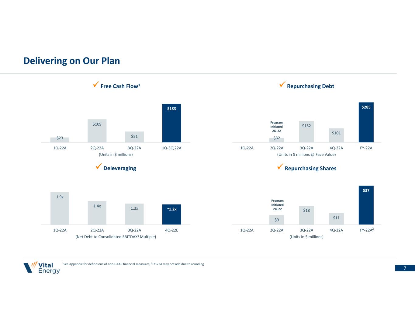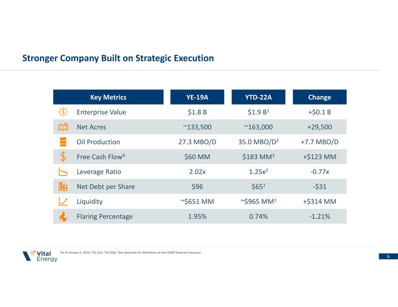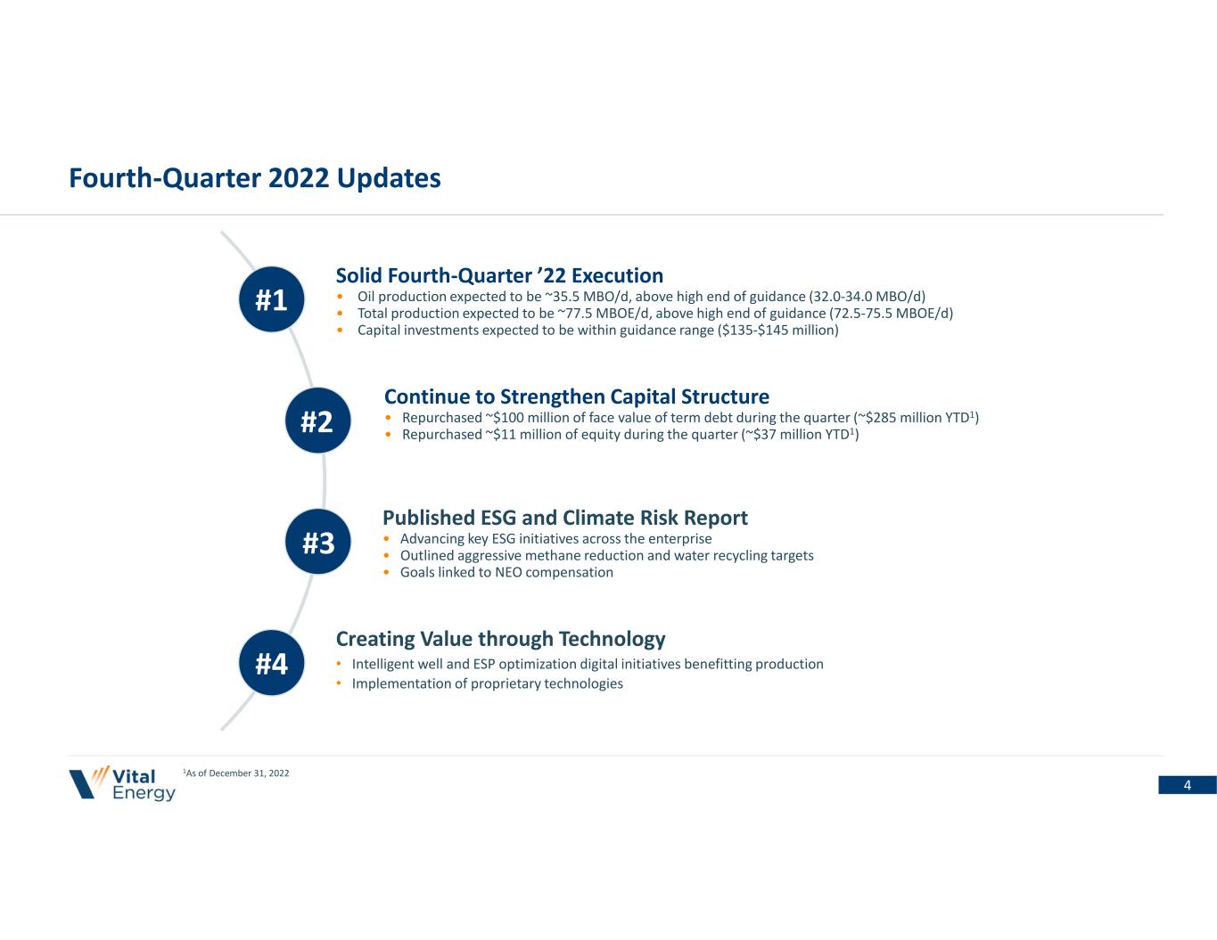 2 Forward-Looking / Cautionary Statements This presentation, including any oral statements made regarding the contents of this presentation, contains forward-looking statements as defined under Section 27A of the Securities Act of 1933, as amended, and Section 21E of the Securities Exchange Act of 1934, as amended. All statements, other than statements of historical facts, that address activities that Vital Energy, Inc. (together with its subsidiaries, the “Company”, “Vital” or “VTLE”) assumes, plans, expects, believes, intends, projects, indicates, enables, transforms, estimates or anticipates (and other similar expressions) will, should or may occur in the future are forward-looking statements. The forward-looking statements are based on management’s current belief, based on currently available information, as to the outcome and timing of future events. Such statements are not guarantees of future performance and involve risks, assumptions and uncertainties. General risks relating to Vital include, but are not limited to, the decline in prices of oil, natural gas liquids and natural gas and the related impact to financial statements as a result of asset impairments and revisions to reserve estimates, the ability of the Company to execute its strategies, including its ability to successfully identify and consummate strategic acquisitions at purchase prices that are accretive to its financial results and to successfully integrate acquired businesses, assets and properties, oil production quotas or other actions that might be imposed by the Organization of Petroleum Exporting Countries and other producing countries (“OPEC+”), the outbreak of disease, such as the coronavirus (“COVID-19”) pandemic, and any related government policies and actions, changes in domestic and global production, supply and demand for commodities, including as a result of the COVID-19 pandemic, actions by OPEC+ and the Russian-Ukrainian military conflict, long-term performance of wells, drilling and operating risks, the increase in service and supply costs, including as a result of inflationary pressures, increases to interest rates as a result of the Federal Reserve’s tightening monetary policy, tariffs on steel, pipeline transportation and storage constraints in the Permian Basin, the possibility of production curtailment, hedging activities, the impacts of severe weather, including the freezing of wells and pipelines in the Permian Basin due to cold weather, possible impacts of litigation and regulations, the impact of the Company’s transactions, if any, with its securities from time to time, the impact of new laws and regulations, including those regarding the use of hydraulic fracturing, the impact of new environmental, health and safety requirements applicable to the Company’s business activities, the possibility of the elimination of federal income tax deductions for oil and gas exploration and development and other factors, including those and other risks described in its Annual Report on Form 10-K for the year ended December 31, 2021, and those set forth from time to time in other filings with the Securities and Exchange Commission (“SEC”). These documents are available through Vital’s website at www.vitalenergy.com under the tab “Investor Relations” or through the SEC’s Electronic Data Gathering and Analysis Retrieval System at www.sec.gov. Any of these factors could cause Vital’s actual results and plans to differ materially from those in the forward-looking statements. Therefore, Vital can give no assurance that its future results will be as estimated. Any forward-looking statement speaks only as of the date on which such statement is made. Vital does not intend to, and disclaims any obligation to, correct, update or revise any forward-looking statement, whether as a result of new information, future events or otherwise, except as required by applicable law. The SEC generally permits oil and natural gas companies, in filings made with the SEC, to disclose proved reserves, which are reserve estimates that geological and engineering data demonstrate with reasonable certainty to be recoverable in future years from known reservoirs under existing economic and operating conditions, and certain probable and possible reserves that meet the SEC’s definitions for such terms. In this presentation, the Company may use the terms “resource potential,” “resource play,” “estimated ultimate recovery,” or “EURs,” “type curve” and “standardized measure,” each of which the SEC guidelines restrict from being included in filings with the SEC without strict compliance with SEC definitions. These terms refer to the Company’s internal estimates of unbooked hydrocarbon quantities that may be potentially discovered through exploratory drilling or recovered with additional drilling or recovery techniques. “Resource potential” is used by the Company to refer to the estimated quantities of hydrocarbons that may be added to proved reserves, largely from a specified resource play potentially supporting numerous drilling locations. A “resource play” is a term used by the Company to describe an accumulation of hydrocarbons known to exist over a large areal expanse and/or thick vertical section potentially supporting numerous drilling locations, which, when compared to a conventional play, typically has a lower geological and/or commercial development risk. “EURs” are based on the Company’s previous operating experience in a given area and publicly available information relating to the operations of producers who are conducting operations in these areas. Unbooked resource potential and “EURs” do not constitute reserves within the meaning of the Society of Petroleum Engineer’s Petroleum Resource Management System or SEC rules and do not include any proved reserves. Actual quantities of reserves that may be ultimately recovered from the Company’s i