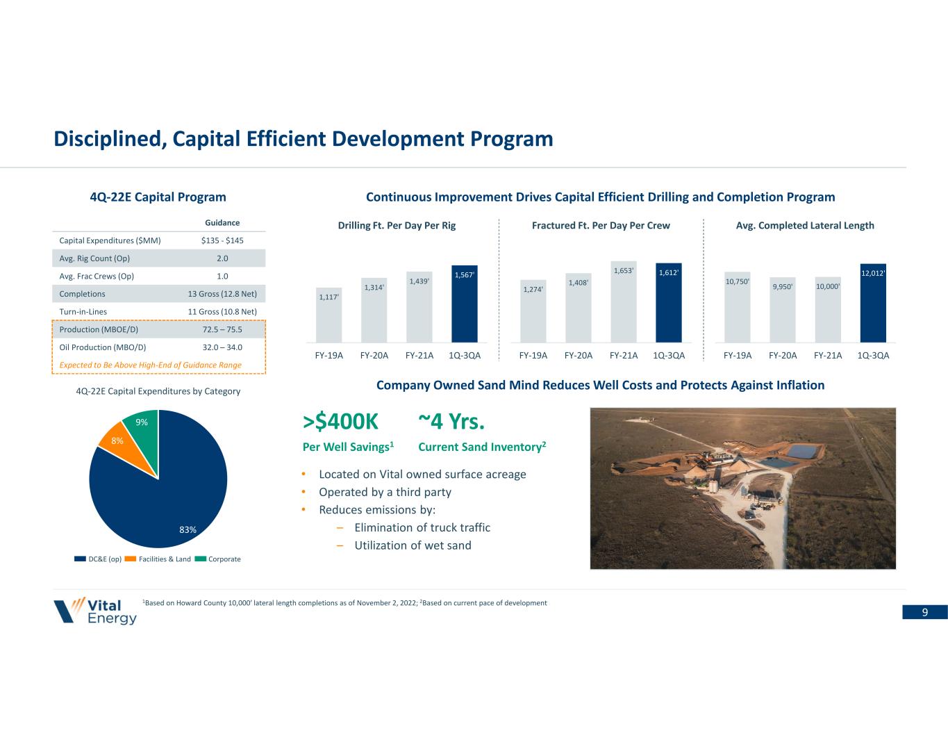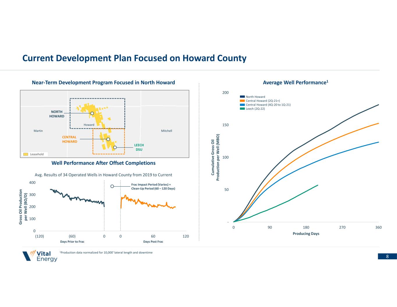 8 - 50 100 150 200 0 90 180 270 360 C u m u la ti ve G ro ss O il P ro d u ct io n p e r W e ll (M B O ) Producing Days 8 Current Development Plan Focused on Howard County 1Production data normalized for 10,000’ lateral length and downtime Near-Term Development Program Focused in North Howard Average Well Performance1 Well Performance After Offset Completions North Howard Central Howard (2Q-21+) Central Howard (4Q-20 to 1Q-21) Leech (2Q-22) Howard Leasehold NORTH HOWARD Martin Mitchell CENTRAL HOWARD LEECH DSU 0 100 200 300 400 (120) (60) 0 0 60 120 G ro ss O il P ro d u ct io n p e r W e ll (B O /D ) Avg. Results of 34 Operated Wells in Howard County from 2019 to Current Days Prior to Frac Days Post Frac Frac Impact Period (Varies) + Clean-Up Period (60 – 120 Days)
