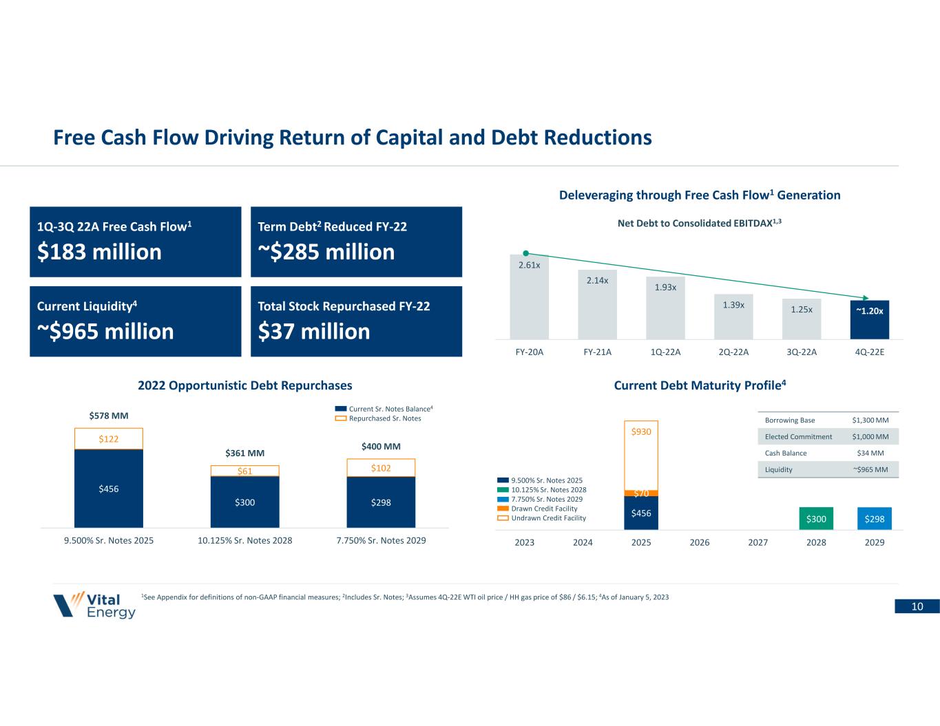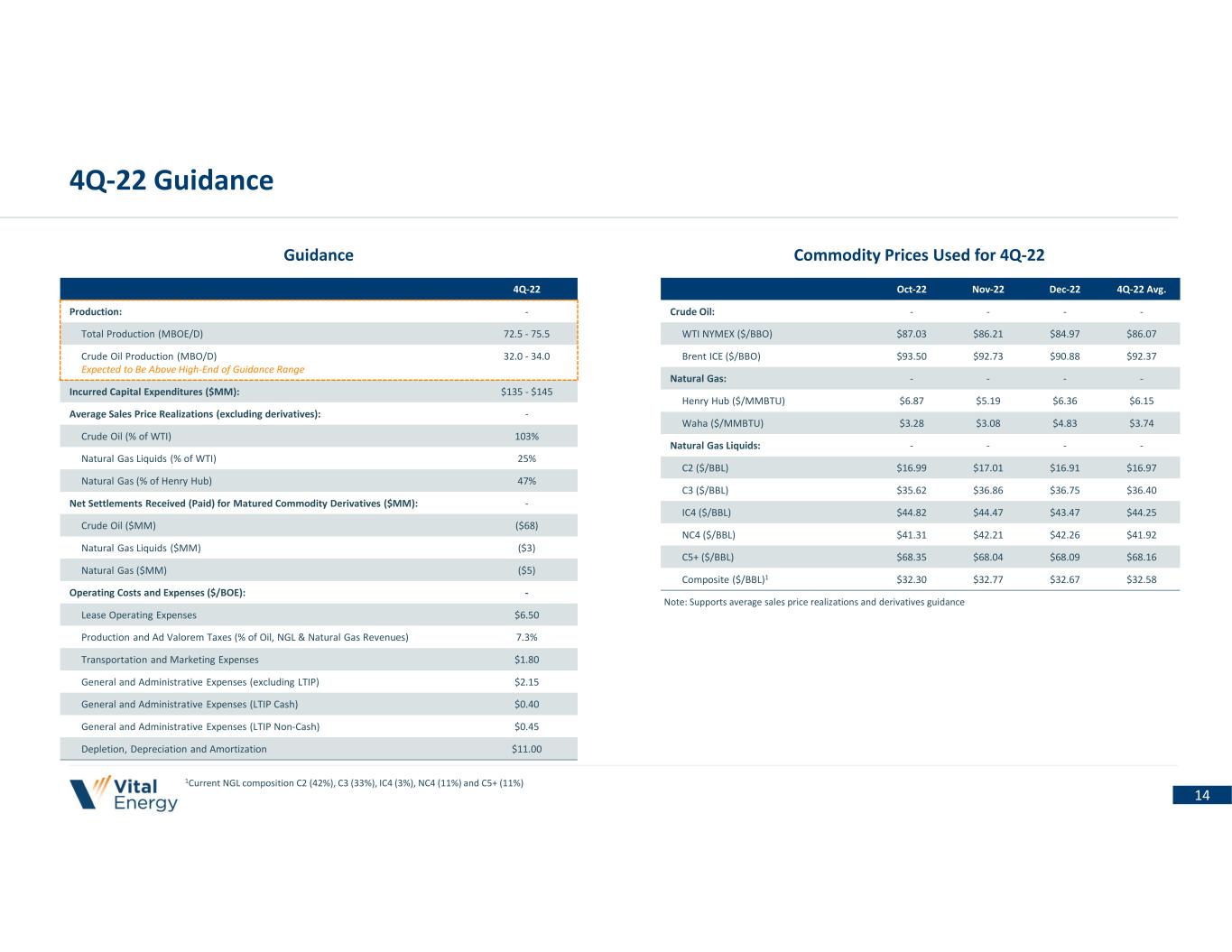 99 Disciplined, Capital Efficient Development Program 1Based on Howard County 10,000’ lateral length completions as of November 2, 2022; 2Based on current pace of development Continuous Improvement Drives Capital Efficient Drilling and Completion Program 1,117' 1,314' 1,439' 1,567' FY-19A FY-20A FY-21A 1Q-3QA Drilling Ft. Per Day Per RigGuidance Capital Expenditures ($MM) $135 - $145 Avg. Rig Count (Op) 2.0 Avg. Frac Crews (Op) 1.0 Completions 13 Gross (12.8 Net) Turn-in-Lines 11 Gross (10.8 Net) Production (MBOE/D) 72.5 – 75.5 Oil Production (MBO/D) 32.0 – 34.0 Expected to Be Above High-End of Guidance Range 4Q-22E Capital Program 83% 8% 9% 4Q-22E Capital Expenditures by Category DC&E (op) Facilities & Land Corporate 1,274' 1,408' 1,653' 1,612' FY-19A FY-20A FY-21A 1Q-3QA Fractured Ft. Per Day Per Crew 10,750' 9,950' 10,000' 12,012' FY-19A FY-20A FY-21A 1Q-3QA Avg. Completed Lateral Length Company Owned Sand Mind Reduces Well Costs and Protects Against Inflation • Located on Vital owned surface acreage • Operated by a third party • Reduces emissions by: – Elimination of truck traffic – Utilization of wet sand >$400K Per Well Savings1 ~4 Yrs. Current Sand Inventory2