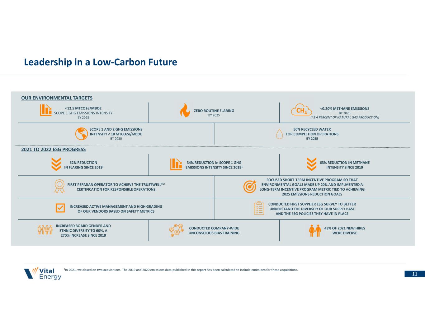 1111 Leadership in a Low-Carbon Future 1In 2021, we closed on two acquisitions. The 2019 and 2020 emissions data published in this report has been calculated to include emissions for these acquisitions. OUR ENVIRONMENTAL TARGETS <12.5 MTCO2e/MBOE SCOPE 1 GHG EMISSIONS INTENSITY BY 2025 ZERO ROUTINE FLARING BY 2025 <0.20% METHANE EMISSIONS BY 2025 (AS A PERCENT OF NATURAL GAS PRODUCTION) SCOPE 1 AND 2 GHG EMISSIONS INTENSITY < 10 MTCO2e/MBOE BY 2030 50% RECYCLED WATER FOR COMPLETION OPERATIONS BY 2025 2021 TO 2022 ESG PROGRESS 62% REDUCTION IN FLARING SINCE 2019 34% REDUCTION in SCOPE 1 GHG EMISSIONS INTENSITY SINCE 20191 63% REDUCTION IN METHANE INTENSITY SINCE 2019 FIRST PERMIAN OPERATOR TO ACHIEVE THE TRUSTWELLTM CERTIFICATION FOR RESPONSIBLE OPERATIONS FOCUSED SHORT-TERM INCENTIVE PROGRAM SO THAT ENVIRONMENTAL GOALS MAKE UP 20% AND IMPLMENTED A LONG-TERM INCENTIVE PROGRAM METRIC TIED TO ACHIEVING 2025 EMISSIONS REDUCTION GOALS INCREASED ACTIVE MANAGEMENT AND HIGH GRADING OF OUR VENDORS BASED ON SAFETY METRICS CONDUCTED FIRST SUPPLIER ESG SURVEY TO BETTER UNDERSTAND THE DIVERSITY OF OUR SUPPLY BASE AND THE ESG POLICIES THEY HAVE IN PLACE INCREASED BOARD GENDER AND ETHNIC DIVERSITY TO 60%, A 270% INCREASE SINCE 2019 CONDUCTED COMPANY-WIDE UNCONSCIOUS BIAS TRAINING 43% OF 2021 NEW HIRES WERE DIVERSE CH4