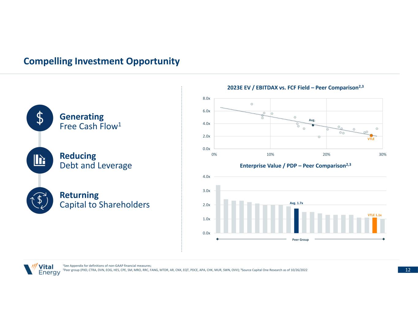 1212 Compelling Investment Opportunity 1See Appendix for definitions of non-GAAP financial measures; 2Peer group (PXD, CTRA, DVN, EOG, HES, CPE, SM, MRO, RRC, FANG, MTDR, AR, CNX, EQT, PDCE, APA, CHK, MUR, SWN, OVV); 3Source Capital One Research as of 10/26/2022 2023E EV / EBITDAX vs. FCF Field – Peer Comparison2,3 Generating Free Cash Flow1 Reducing Debt and Leverage Returning Capital to Shareholders 0.0x 2.0x 4.0x 6.0x 8.0x 0% 10% 20% 30% Avg. VTLE Enterprise Value / PDP – Peer Comparison2,3 Avg. 1.7x VTLE 1.1x 0.0x 1.0x 2.0x 3.0x 4.0x Peer Group