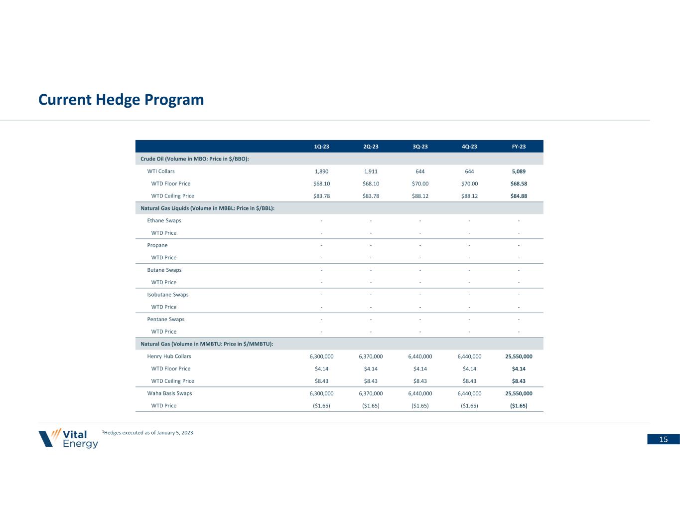 1515 Current Hedge Program 1Hedges executed as of January 5, 2023 1Q-23 2Q-23 3Q-23 4Q-23 FY-23 Crude Oil (Volume in MBO: Price in $/BBO): WTI Collars 1,890 1,911 644 644 5,089 WTD Floor Price $68.10 $68.10 $70.00 $70.00 $68.58 WTD Ceiling Price $83.78 $83.78 $88.12 $88.12 $84.88 Natural Gas Liquids (Volume in MBBL: Price in $/BBL): Ethane Swaps - - - - - WTD Price - - - - - Propane - - - - - WTD Price - - - - - Butane Swaps - - - - - WTD Price - - - - - Isobutane Swaps - - - - - WTD Price - - - - - Pentane Swaps - - - - - WTD Price - - - - - Natural Gas (Volume in MMBTU: Price in $/MMBTU): Henry Hub Collars 6,300,000 6,370,000 6,440,000 6,440,000 25,550,000 WTD Floor Price $4.14 $4.14 $4.14 $4.14 $4.14 WTD Ceiling Price $8.43 $8.43 $8.43 $8.43 $8.43 Waha Basis Swaps 6,300,000 6,370,000 6,440,000 6,440,000 25,550,000 WTD Price ($1.65) ($1.65) ($1.65) ($1.65) ($1.65)
