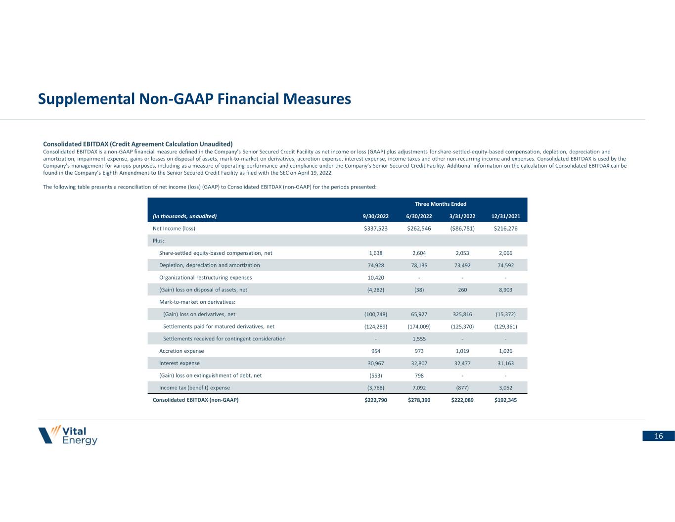 1616 Supplemental Non-GAAP Financial Measures Three Months Ended (in thousands, unaudited) 9/30/2022 6/30/2022 3/31/2022 12/31/2021 Net Income (loss) $337,523 $262,546 ($86,781) $216,276 Plus: Share-settled equity-based compensation, net 1,638 2,604 2,053 2,066 Depletion, depreciation and amortization 74,928 78,135 73,492 74,592 Organizational restructuring expenses 10,420 - - - (Gain) loss on disposal of assets, net (4,282) (38) 260 8,903 Mark-to-market on derivatives: (Gain) loss on derivatives, net (100,748) 65,927 325,816 (15,372) Settlements paid for matured derivatives, net (124,289) (174,009) (125,370) (129,361) Settlements received for contingent consideration - 1,555 - - Accretion expense 954 973 1,019 1,026 Interest expense 30,967 32,807 32,477 31,163 (Gain) loss on extinguishment of debt, net (553) 798 - - Income tax (benefit) expense (3,768) 7,092 (877) 3,052 Consolidated EBITDAX (non-GAAP) $222,790 $278,390 $222,089 $192,345 Consolidated EBITDAX (Credit Agreement Calculation Unaudited) Consolidated EBITDAX is a non-GAAP financial measure defined in the Company’s Senior Secured Credit Facility as net income or loss (GAAP) plus adjustments for share-settled-equity-based compensation, depletion, depreciation and amortization, impairment expense, gains or losses on disposal of assets, mark-to-market on derivatives, accretion expense, interest expense, income taxes and other non-recurring income and expenses. Consolidated EBITDAX is used by the Company’s management for various purposes, including as a measure of operating performance and compliance under the Company’s Senior Secured Credit Facility. Additional information on the calculation of Consolidated EBITDAX can be found in the Company’s Eighth Amendment to the Senior Secured Credit Facility as filed with the SEC on April 19, 2022. The following table presents a reconciliation of net income (loss) (GAAP) to Consolidated EBITDAX (non-GAAP) for the periods presented: