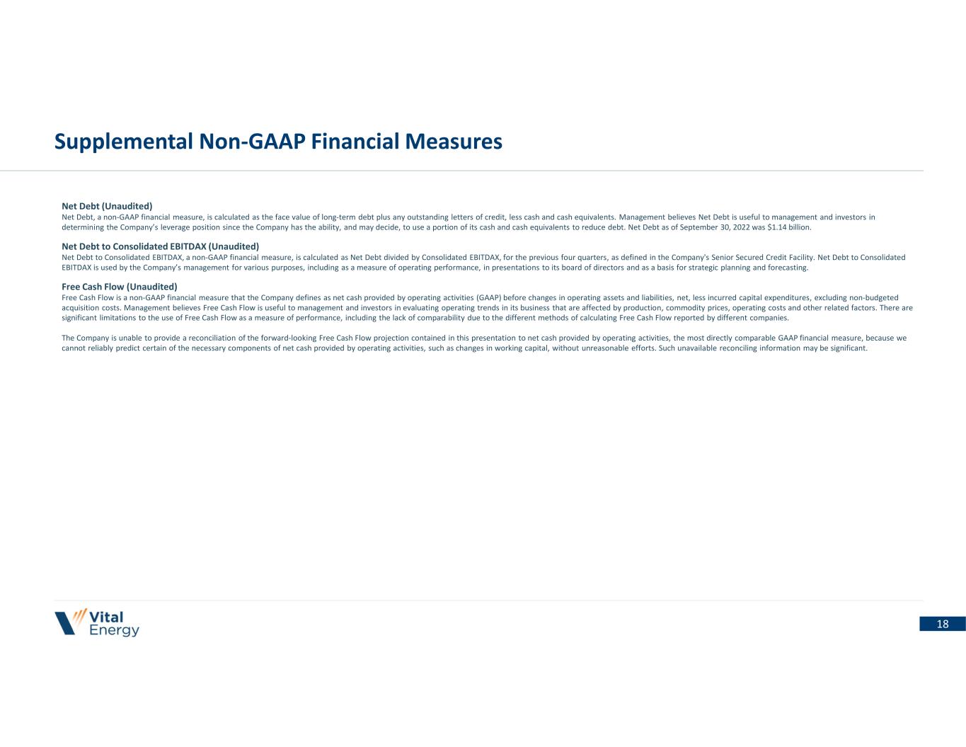 1818 Supplemental Non-GAAP Financial Measures Net Debt (Unaudited) Net Debt, a non-GAAP financial measure, is calculated as the face value of long-term debt plus any outstanding letters of credit, less cash and cash equivalents. Management believes Net Debt is useful to management and investors in determining the Company’s leverage position since the Company has the ability, and may decide, to use a portion of its cash and cash equivalents to reduce debt. Net Debt as of September 30, 2022 was $1.14 billion. Net Debt to Consolidated EBITDAX (Unaudited) Net Debt to Consolidated EBITDAX, a non-GAAP financial measure, is calculated as Net Debt divided by Consolidated EBITDAX, for the previous four quarters, as defined in the Company's Senior Secured Credit Facility. Net Debt to Consolidated EBITDAX is used by the Company’s management for various purposes, including as a measure of operating performance, in presentations to its board of directors and as a basis for strategic planning and forecasting. Free Cash Flow (Unaudited) Free Cash Flow is a non-GAAP financial measure that the Company defines as net cash provided by operating activities (GAAP) before changes in operating assets and liabilities, net, less incurred capital expenditures, excluding non-budgeted acquisition costs. Management believes Free Cash Flow is useful to management and investors in evaluating operating trends in its business that are affected by production, commodity prices, operating costs and other related factors. There are significant limitations to the use of Free Cash Flow as a measure of performance, including the lack of comparability due to the different methods of calculating Free Cash Flow reported by different companies. The Company is unable to provide a reconciliation of the forward-looking Free Cash Flow projection contained in this presentation to net cash provided by operating activities, the most directly comparable GAAP financial measure, because we cannot reliably predict certain of the necessary components of net cash provided by operating activities, such as changes in working capital, without unreasonable efforts. Such unavailable reconciling information may be significant.