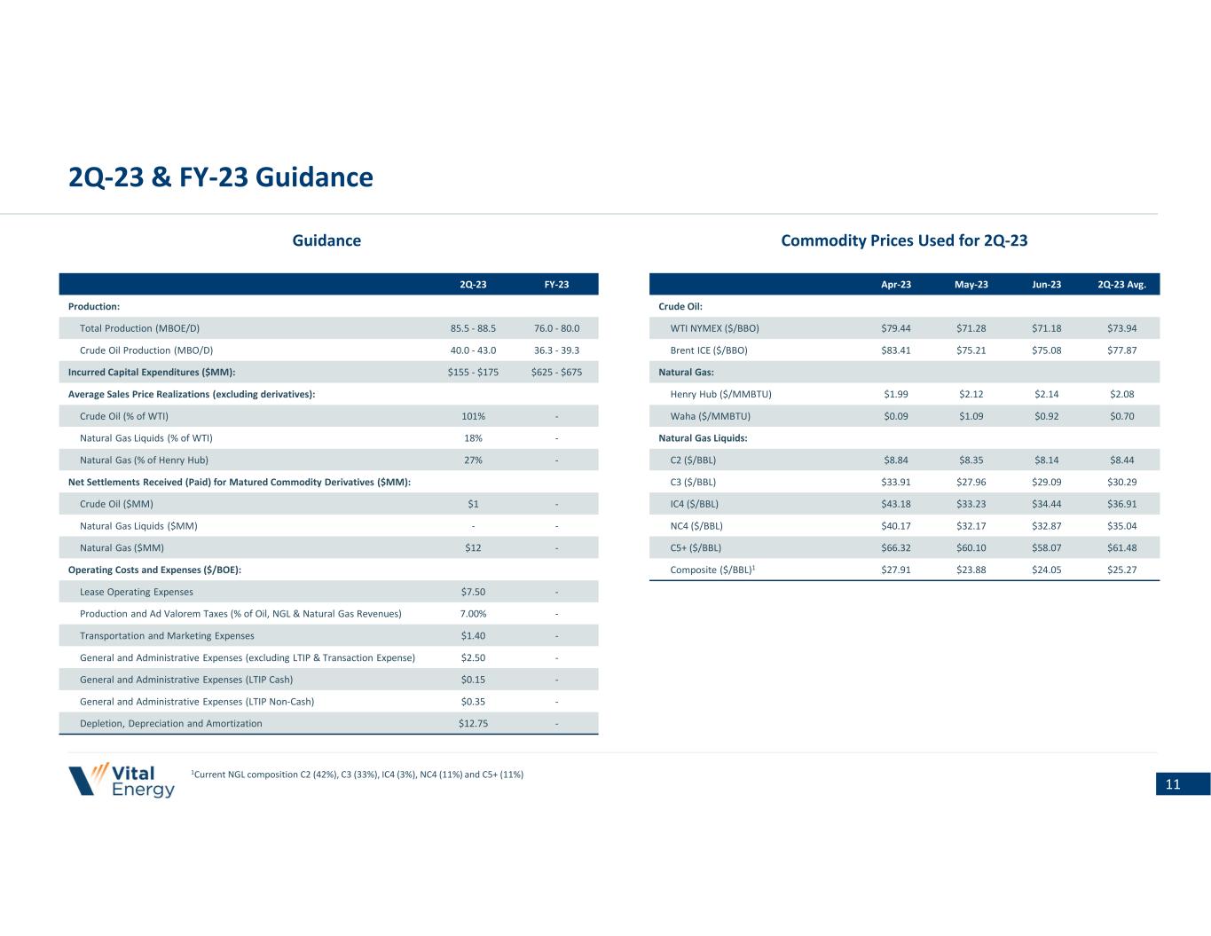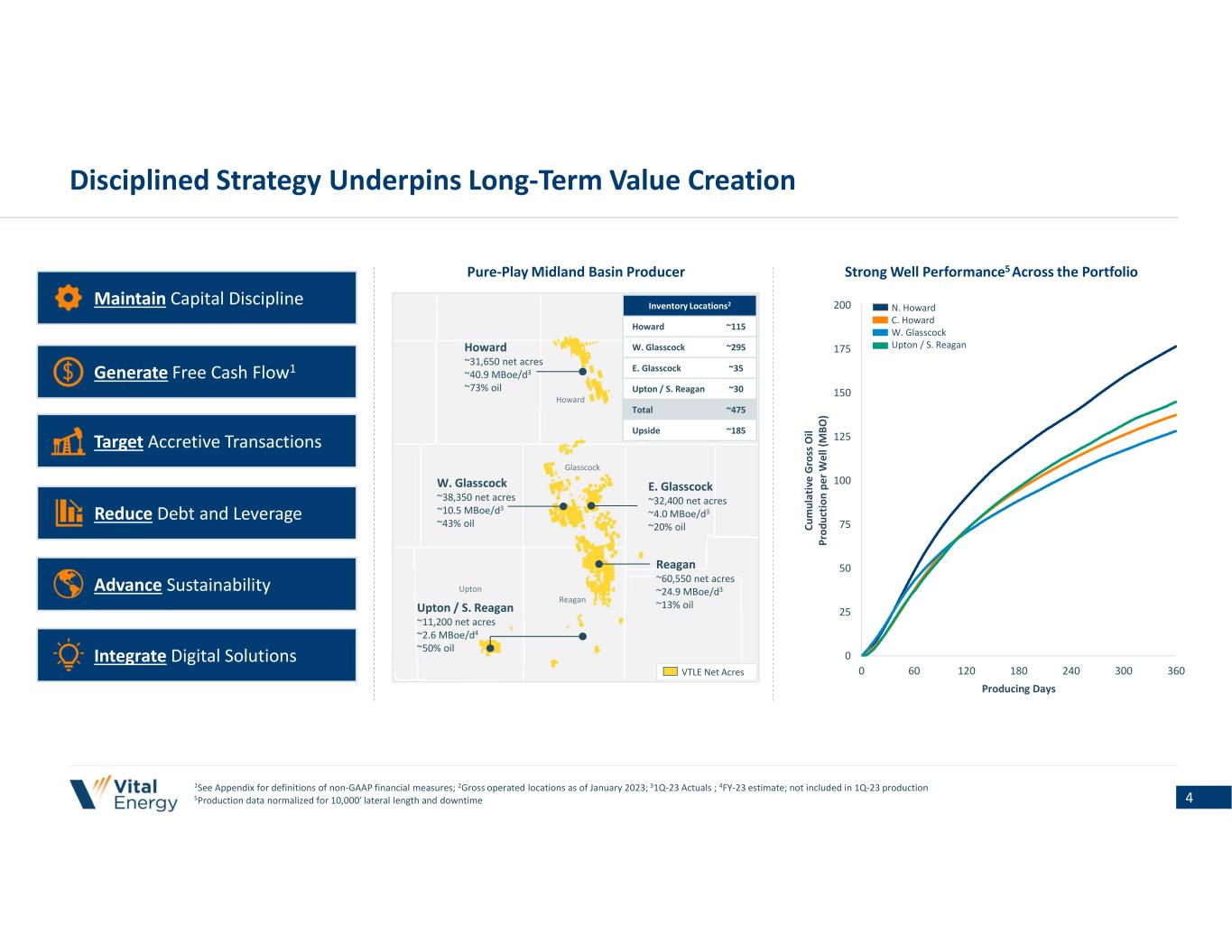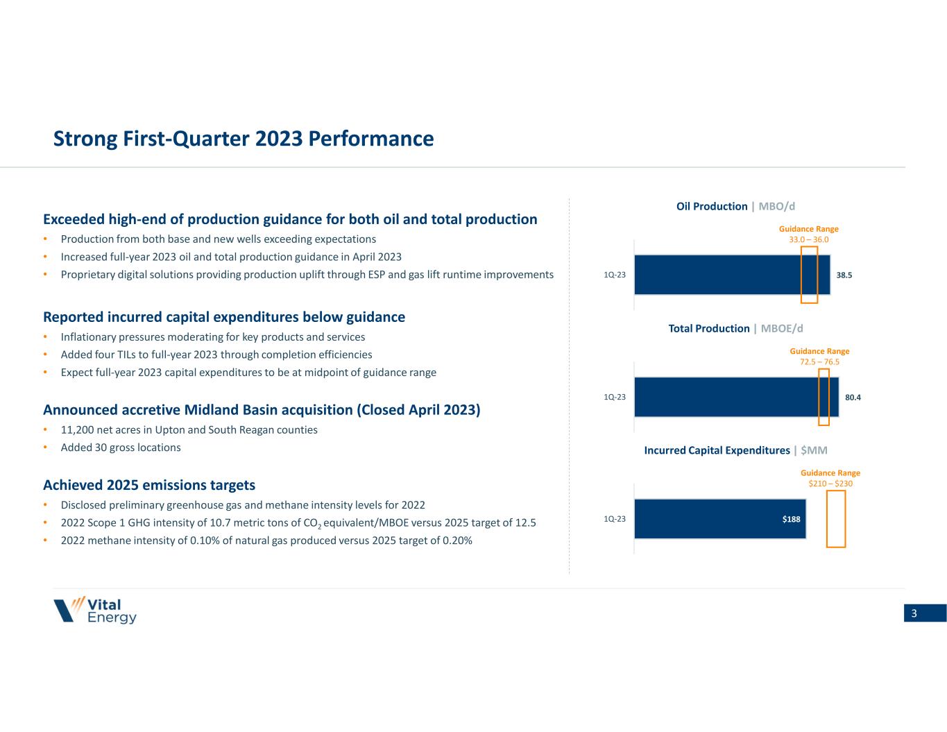 Forward-Looking / Cautionary Statements 2 This presentation, including any oral statements made regarding the contents of this presentation, contains forward-looking statements as defined under Section 27A of the Securities Act of 1933, as amended, and Section 21E of the Securities Exchange Act of 1934, as amended. All statements, other than statements of historical facts, that address activities that Vital Energy, Inc. (together with its subsidiaries, the “Company”, “Vital” or “VTLE”) assumes, plans, expects, believes, intends, projects, indicates, enables, transforms, estimates or anticipates (and other similar expressions) will, should or may occur in the future are forward-looking statements. The forward-looking statements are based on management’s current belief, based on currently available information, as to the outcome and timing of future events. Such statements are not guarantees of future performance and involve risks, assumptions and uncertainties. General risks relating to Vital Energy include, but are not limited to, continuing and worsening inflationary pressures and associated changes in monetary policy that may cause costs to rise; changes in domestic and global production, supply and demand for commodities, including as a result of the coronavirus ("COVID-19") pandemic, actions by the Organization of Petroleum Exporting Countries and other producing countries ("OPEC+") and the Russian-Ukrainian military conflict, the decline in prices of oil, natural gas liquids and natural gas and the related impact to financial statements as a result of asset impairments and revisions to reserve estimates, reduced demand due to shifting market perception towards the oil and gas industry; competition in the oil and gas industry; the ability of the Company to execute its strategies, including its ability to successfully identify and consummate strategic acquisitions at purchase prices that are accretive to its financial results and to successfully integrate acquired businesses, assets and properties, pipeline transportation and storage constraints in the Permian Basin, the effects and duration of the outbreak of disease, such as the COVID-19 pandemic, and any related government policies and actions, long-term performance of wells, drilling and operating risks, the possibility of production curtailment, the impact of new laws and regulations, including those regarding the use of hydraulic fracturing, the impact of legislation or regulatory initiatives intended to address induced seismicity on our ability to conduct our operations; hedging activities, tariffs on steel, the impacts of severe weather, including the freezing of wells and pipelines in the Permian Basin due to cold weather, possible impacts of litigation and regulations, the impact of the Company's transactions, if any, with its securities from time to time, the impact of new environmental, health and safety requirements applicable to the Company's business activities, the possibility of the elimination of federal income tax deductions for oil and gas exploration and development and other factors, including those and other risks described in its Annual Report on Form 10-K for the year ended December 31, 2022 and those set forth from time to time in other filings with the Securities and Exchange Commission ("SEC"). Any forward-looking statement speaks only as of the date on which such statement is made. Vital does not intend to, and disclaims any obligation to, correct, update or revise any forward-looking statement, whether as a result of new information, future events or otherwise, except as required by applicable law. The SEC generally permits oil and natural gas companies, in filings made with the SEC, to disclose proved reserves, which are reserve estimates that geological and engineering data demonstrate with reasonable certainty to be recoverable in future years from known reservoirs under existing economic and operating conditions, and certain probable and possible reserves that meet the SEC’s definitions for such terms. In this presentation, the Company may use the terms “resource potential,” “resource play,” “estimated ultimate recovery,” or “EURs,” “type curve” and “standardized measure,” each of which the SEC guidelines restrict from being included in filings with the SEC without strict compliance with SEC definitions. These terms refer to the Company’s internal estimates of unbooked hydrocarbon quantities that may be potentially discovered through exploratory drilling or recovered with additional drilling or recovery techniques. “Resource potential” is used by the Company to refer to the estimated quantities of hydrocarbons that may be added to proved reserves, largely from a specified resource play potentially supporting numerous drilling locations. A “resource play” is a term used by the Company to describe an accumulation of hydrocarbons known to exist over a large areal expanse and/or thick vertical section potentially supporting numerous drilling locations, which, when compared to a conventional play, typically has a lower geological and/or commercial development risk. “EURs” are based on the Company’s previous operating experience in a given area and publicly available information relating to the operations of producers who are conducting operations in these areas. Unbooked resource potential and “EURs” do not constitute reserves within the meaning of the Society of Petroleum Engineer’s Petroleum Resource Management System or SEC rules and do not include any proved reserves. Actual quantities of reserves that may be ultimately recovered from the Company’s interests may differ substantially from those presented herein. Factors affecting ultimate recovery include the scope of the Company’s ongoing drilling program, which will be directly affected by the availability of capital, decreases in oil, natural gas liquids and natural gas prices, well sp
