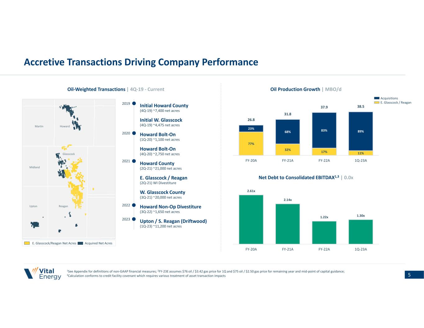 0 25 50 75 100 125 150 175 200 0 60 120 180 240 300 360 C u m u la ti ve G ro ss O il P ro d u ct io n p e r W e ll (M B O ) Producing Days Disciplined Strategy Underpins Long-Term Value Creation 1See Appendix for definitions of non-GAAP financial measures; 2Gross operated locations as of January 2023; 31Q-23 Actuals ; 4FY-23 estimate; not included in 1Q-23 production 5Production data normalized for 10,000’ lateral length and downtime 4 Maintain Capital Discipline Generate Free Cash Flow1 Reduce Debt and Leverage Target Accretive Transactions Advance Sustainability Integrate Digital Solutions Pure-Play Midland Basin Producer Howard Glasscock Reagan Upton Howard ~31,650 net acres ~40.9 MBoe/d3 ~73% oil W. Glasscock ~38,350 net acres ~10.5 MBoe/d3 ~43% oil E. Glasscock ~32,400 net acres ~4.0 MBoe/d3 ~20% oil Reagan ~60,550 net acres ~24.9 MBoe/d3 ~13% oilUpton / S. Reagan ~11,200 net acres ~2.6 MBoe/d4 ~50% oil VTLE Net Acres Inventory Locations2 ~115Howard ~295W. Glasscock ~35E. Glasscock ~30Upton / S. Reagan ~475Total ~185Upside Strong Well Performance5 Across the Portfolio N. Howard C. Howard W. Glasscock Upton / S. Reagan