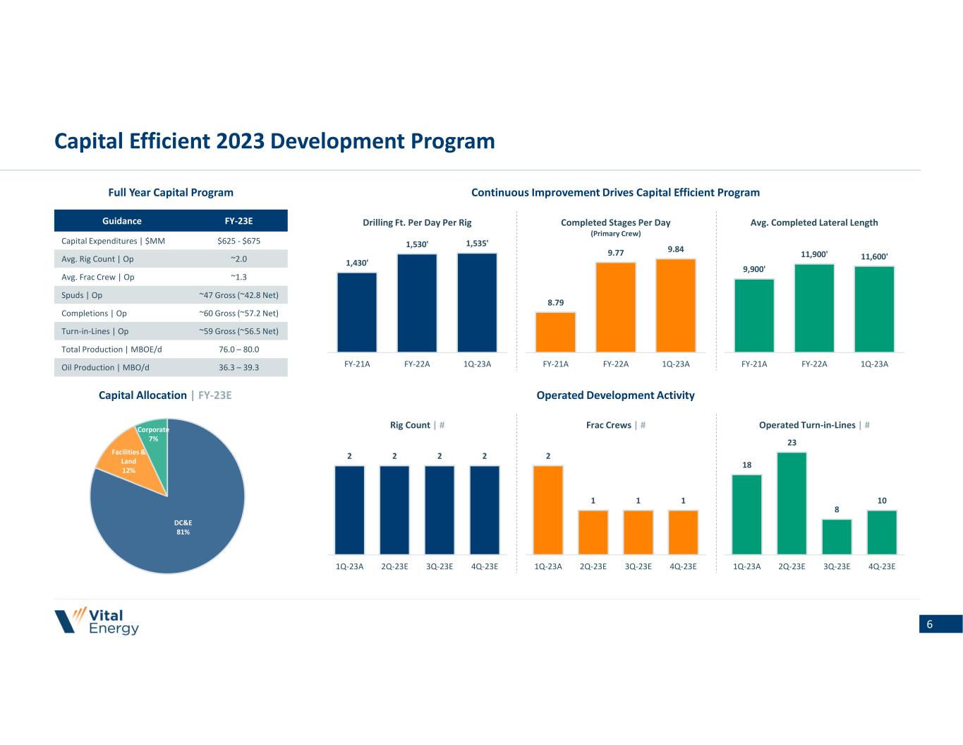  Initial Howard County (4Q-19) ~7,400 net acres  Initial W. Glasscock (4Q-19) ~4,475 net acres  Howard Bolt-On (1Q-20) ~1,100 net acres  Howard Bolt-On (4Q-20) ~2,750 net acres  Howard County (2Q-21) ~21,000 net acres  E. Glasscock / Reagan (2Q-21) WI Divestiture  W. Glasscock County (3Q-21) ~20,000 net acres  Howard Non-Op Divestiture (3Q-22) ~1,650 net acres  Upton / S. Reagan (Driftwood) (1Q-23) ~11,200 net acres Accretive Transactions Driving Company Performance 1See Appendix for definitions of non-GAAP financial measures; 2FY-23E assumes $76 oil / $3.42 gas price for 1Q and $75 oil / $2.50 gas price for remaining year and mid-point of capital guidance; 3Calculation conforms to credit facility covenant which requires various treatment of asset transaction impacts 5 Martin Howard Midland Glasscock Upton Reagan Oil Production Growth | MBO/d E. Glasscock/Reagan Net Acres Acquired Net Acres Oil-Weighted Transactions | 4Q-19 - Current Net Debt to Consolidated EBITDAX1,3 | 0.0x 77% 32% 17% 11% 23% 68% 83% 89% 26.8 31.8 37.9 38.5 FY-20A FY-21A FY-22A 1Q-23A Acquisitions E. Glasscock / Reagan 2.61x 2.14x 1.22x 1.30x FY-20A FY-21A FY-22A 1Q-23A 2019 2020 2021 2022 2023