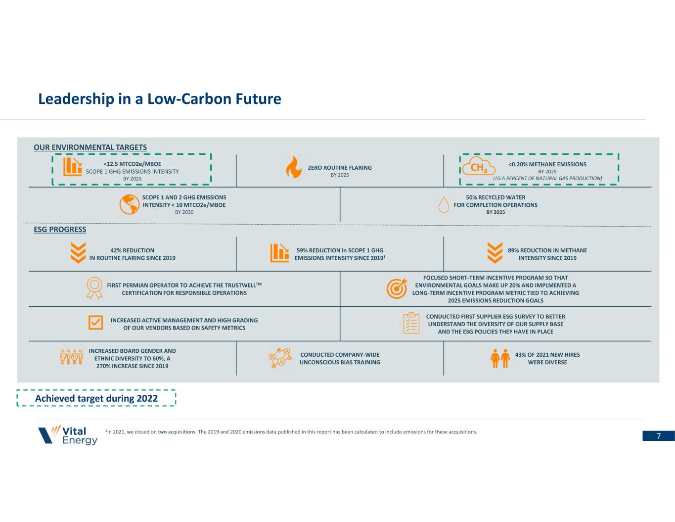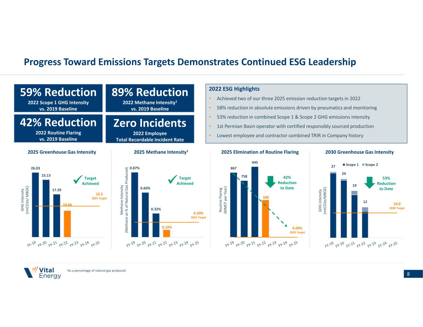 77 Leadership in a Low-Carbon Future OUR ENVIRONMENTAL TARGETS <0.20% METHANE EMISSIONS BY 2025 (AS A PERCENT OF NATURAL GAS PRODUCTION) ZERO ROUTINE FLARING BY 2025 <12.5 MTCO2e/MBOE SCOPE 1 GHG EMISSIONS INTENSITY BY 2025 50% RECYCLED WATER FOR COMPLETION OPERATIONS BY 2025 SCOPE 1 AND 2 GHG EMISSIONS INTENSITY < 10 MTCO2e/MBOE BY 2030 ESG PROGRESS 89% REDUCTION IN METHANE INTENSITY SINCE 2019 59% REDUCTION in SCOPE 1 GHG EMISSIONS INTENSITY SINCE 20191 42% REDUCTION IN ROUTINE FLARING SINCE 2019 FOCUSED SHORT-TERM INCENTIVE PROGRAM SO THAT ENVIRONMENTAL GOALS MAKE UP 20% AND IMPLMENTED A LONG-TERM INCENTIVE PROGRAM METRIC TIED TO ACHIEVING 2025 EMISSIONS REDUCTION GOALS FIRST PERMIAN OPERATOR TO ACHIEVE THE TRUSTWELLTM CERTIFICATION FOR RESPONSIBLE OPERATIONS CONDUCTED FIRST SUPPLIER ESG SURVEY TO BETTER UNDERSTAND THE DIVERSITY OF OUR SUPPLY BASE AND THE ESG POLICIES THEY HAVE IN PLACE INCREASED ACTIVE MANAGEMENT AND HIGH GRADING OF OUR VENDORS BASED ON SAFETY METRICS 43% OF 2021 NEW HIRES WERE DIVERSE CONDUCTED COMPANY-WIDE UNCONSCIOUS BIAS TRAINING INCREASED BOARD GENDER AND ETHNIC DIVERSITY TO 60%, A 270% INCREASE SINCE 2019 CH4 1In 2021, we closed on two acquisitions. The 2019 and 2020 emissions data published in this report has been calculated to include emissions for these acquisitions. Achieved target during 2022