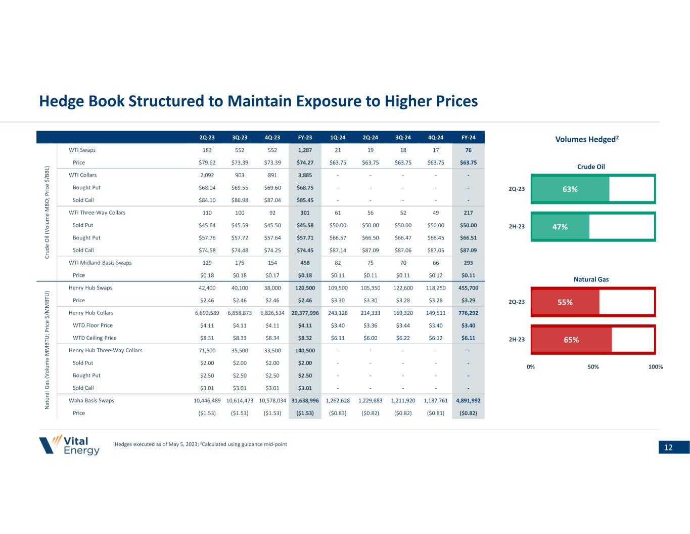 2Q-23 & FY-23 Guidance 1Current NGL composition C2 (42%), C3 (33%), IC4 (3%), NC4 (11%) and C5+ (11%) 11 Guidance Commodity Prices Used for 2Q-23 2Q-23 Avg.Jun-23May-23Apr-23 Crude Oil: $73.94$71.18$71.28$79.44WTI NYMEX ($/BBO) $77.87$75.08$75.21$83.41Brent ICE ($/BBO) Natural Gas: $2.08$2.14$2.12$1.99Henry Hub ($/MMBTU) $0.70$0.92$1.09$0.09Waha ($/MMBTU) Natural Gas Liquids: $8.44$8.14$8.35$8.84C2 ($/BBL) $30.29$29.09$27.96$33.91C3 ($/BBL) $36.91$34.44$33.23$43.18IC4 ($/BBL) $35.04$32.87$32.17$40.17NC4 ($/BBL) $61.48$58.07$60.10$66.32C5+ ($/BBL) $25.27$24.05$23.88$27.91Composite ($/BBL)1 FY-232Q-23 Production: 76.0 - 80.085.5 - 88.5Total Production (MBOE/D) 36.3 - 39.340.0 - 43.0Crude Oil Production (MBO/D) $625 - $675$155 - $175Incurred Capital Expenditures ($MM): Average Sales Price Realizations (excluding derivatives): -101%Crude Oil (% of WTI) -18%Natural Gas Liquids (% of WTI) -27%Natural Gas (% of Henry Hub) Net Settlements Received (Paid) for Matured Commodity Derivatives ($MM): -$1Crude Oil ($MM) --Natural Gas Liquids ($MM) -$12Natural Gas ($MM) Operating Costs and Expenses ($/BOE): -$7.50Lease Operating Expenses -7.00%Production and Ad Valorem Taxes (% of Oil, NGL & Natural Gas Revenues) -$1.40Transportation and Marketing Expenses -$2.50General and Administrative Expenses (excluding LTIP & Transaction Expense) -$0.15General and Administrative Expenses (LTIP Cash) -$0.35General and Administrative Expenses (LTIP Non-Cash) -$12.75Depletion, Depreciation and Amortization