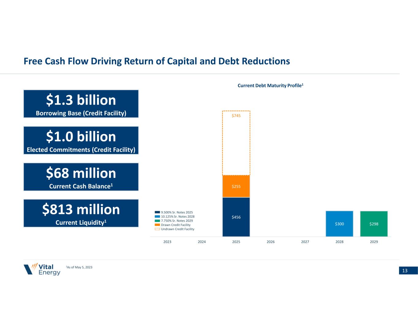 65% 55% 47% 63% 0% 50% 100% 2H-23 2Q-23 2H-23 2Q-23 Hedge Book Structured to Maintain Exposure to Higher Prices 1Hedges executed as of May 5, 2023; 2Calculated using guidance mid-point 12 FY-244Q-243Q-242Q-241Q-24FY-234Q-233Q-232Q-23 76171819211,287552552183WTI Swaps C ru d e O il (V o lu m e M B O ; P ri ce $ /B B L) $63.75$63.75$63.75$63.75$63.75$74.27$73.39$73.39$79.62Price -----3,8858919032,092WTI Collars -----$68.75 $69.60 $69.55$68.04 Bought Put -----$85.45 $87.04 $86.98 $84.10 Sold Call 2174952566130192100110WTI Three-Way Collars $50.00 $50.00 $50.00 $50.00$50.00$45.58$45.50$45.59$45.64 Sold Put $66.51$66.45$66.47$66.50$66.57$57.71$57.64$57.72$57.76Bought Put $87.09 $87.05 $87.06 $87.09 $87.14$74.45 $74.25 $74.48$74.58 Sold Call 29366707582458154175129WTI Midland Basis Swaps $0.11$0.12$0.11$0.11$0.11$0.18$0.17$0.18$0.18Price 455,700118,250122,600105,350109,500120,50038,00040,10042,400 Henry Hub Swaps N at u ra l G as ( V o lu m e M M B TU ; P ri ce $ /M M B TU ) $3.29$3.28$3.28$3.30$3.30$2.46$2.46$2.46$2.46Price 776,292149,511169,320214,333243,12820,377,996 6,826,5346,858,8736,692,589 Henry Hub Collars $3.40$3.40$3.44$3.36$3.40$4.11$4.11$4.11$4.11WTD Floor Price $6.11$6.12$6.22$6.00$6.11$8.32 $8.34 $8.33$8.31 WTD Ceiling Price -----140,50033,50035,50071,500Henry Hub Three-Way Collars -----$2.00$2.00$2.00$2.00Sold Put -----$2.50$2.50$2.50$2.50Bought Put -----$3.01$3.01$3.01$3.01Sold Call 4,891,9921,187,7611,211,9201,229,6831,262,62831,638,99610,578,03410,614,47310,446,489Waha Basis Swaps ($0.82)($0.81)($0.82)($0.82)($0.83)($1.53)($1.53)($1.53)($1.53)Price Volumes Hedged2 Crude Oil Natural Gas