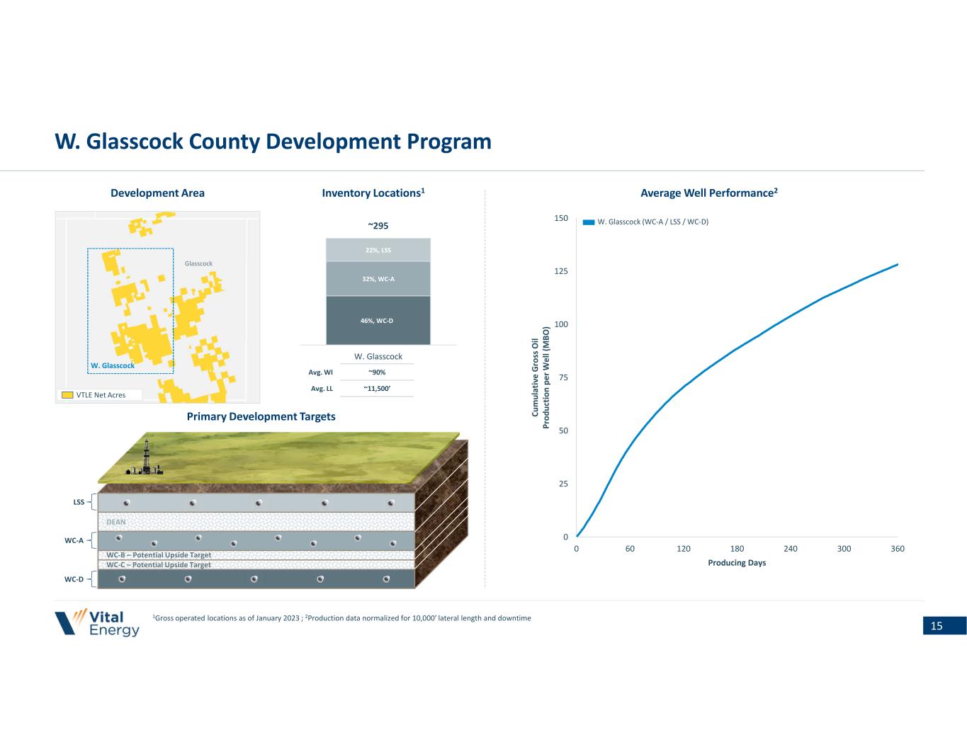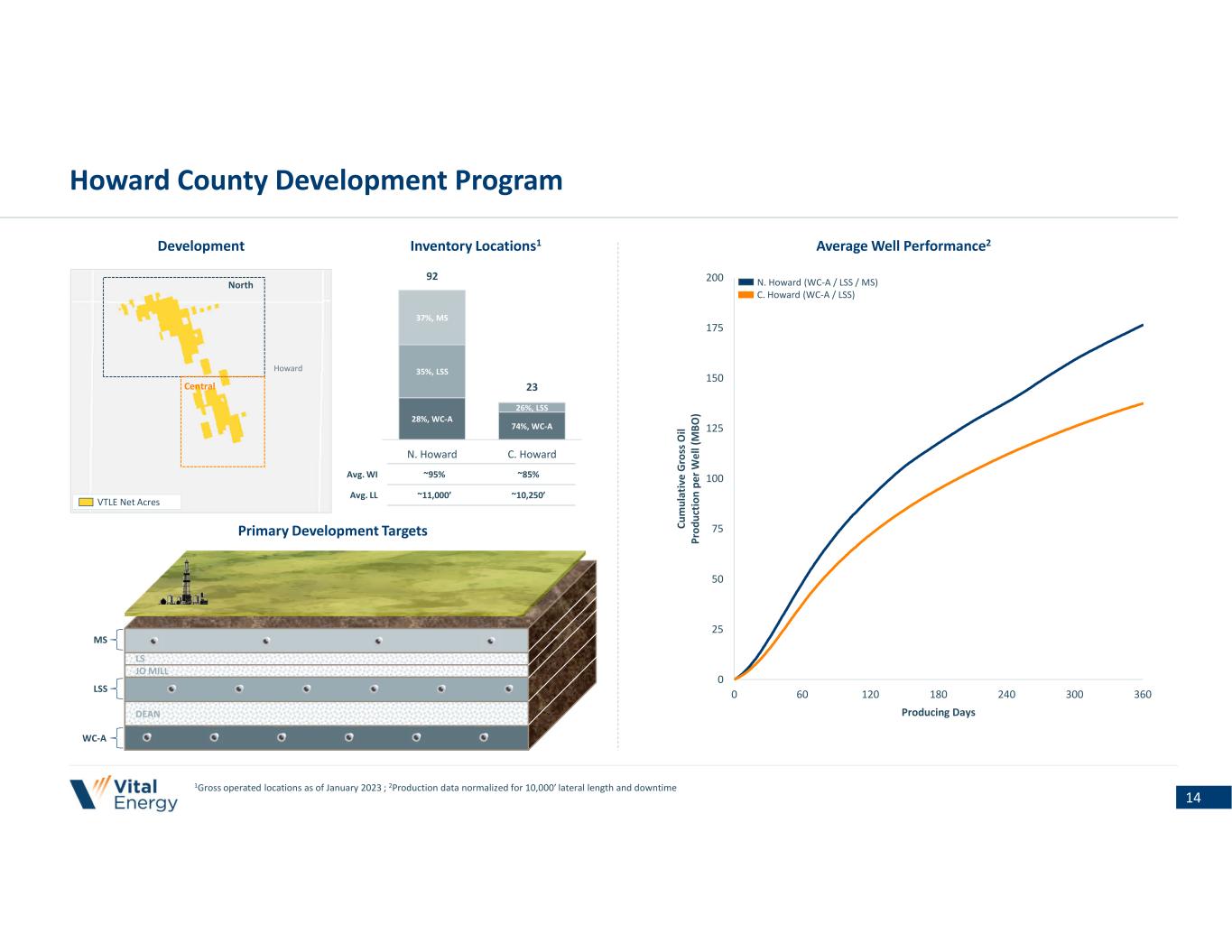 0 25 50 75 100 125 150 175 200 0 60 120 180 240 300 360 C u m u la ti ve G ro ss O il P ro d u ct io n p e r W e ll (M B O ) Producing Days 28%, WC-A 74%, WC-A 35%, LSS 26%, LSS 37%, MS 92 23 N. Howard C. Howard Howard County Development Program 1Gross operated locations as of January 2023 ; 2Production data normalized for 10,000’ lateral length and downtime 14 Development Average Well Performance2 Primary Development Targets VTLE Net Acres Howard North Central Inventory Locations1 LS DEAN MS LSS WC-A JO MILL N. Howard (WC-A / LSS / MS) C. Howard (WC-A / LSS) ~85%~95%Avg. WI ~10,250’~11,000’Avg. LL
