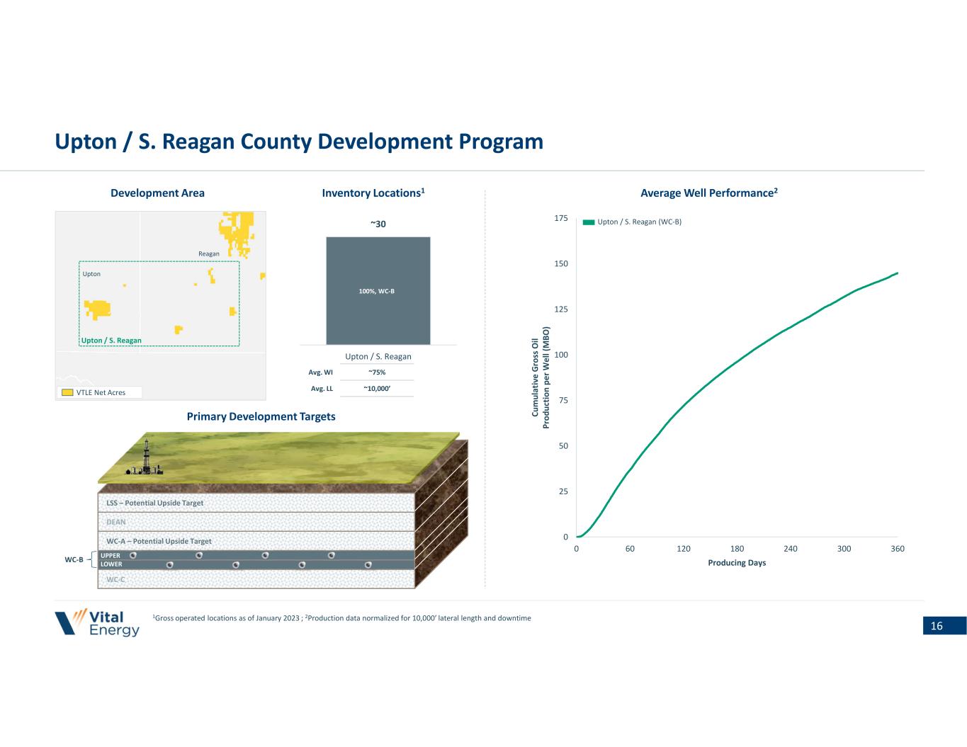 0 25 50 75 100 125 150 0 60 120 180 240 300 360 C u m u la ti ve G ro ss O il P ro d u ct io n p e r W e ll (M B O ) Producing Days W. Glasscock County Development Program 1Gross operated locations as of January 2023 ; 2Production data normalized for 10,000’ lateral length and downtime 15 Development Area Average Well Performance2 Primary Development Targets Glasscock Inventory Locations1 DEAN WC-B – Potential Upside Target LSS WC-A WC-D WC-C – Potential Upside Target 46%, WC-D 32%, WC-A 22%, LSS ~295 W. Glasscock ~90%Avg. WI ~11,500’Avg. LL W. Glasscock (WC-A / LSS / WC-D) W. Glasscock VTLE Net Acres