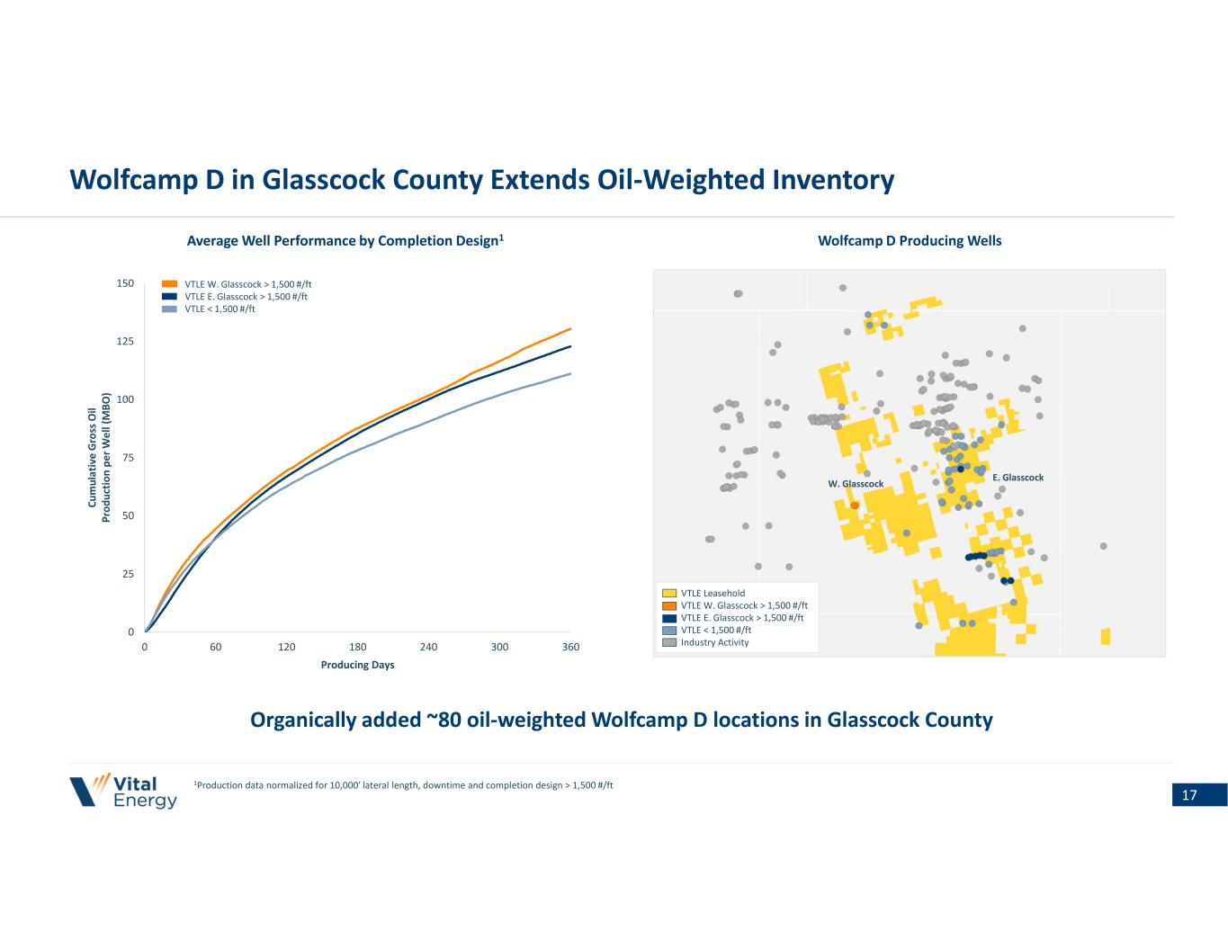 0 25 50 75 100 125 150 175 0 60 120 180 240 300 360 C u m u la ti ve G ro ss O il P ro d u ct io n p e r W e ll (M B O ) Producing Days Upton / S. Reagan County Development Program 1Gross operated locations as of January 2023 ; 2Production data normalized for 10,000’ lateral length and downtime 16 Development Area Average Well Performance2 Primary Development Targets Reagan Inventory Locations1 DEAN WC-B 100%, WC-B ~30 Upton / S. Reagan ~75%Avg. WI ~10,000’Avg. LL Upton / S. Reagan (WC-B) LSS – Potential Upside Target WC-A – Potential Upside Target WC-C UPPER LOWER Upton VTLE Net Acres Upton / S. Reagan