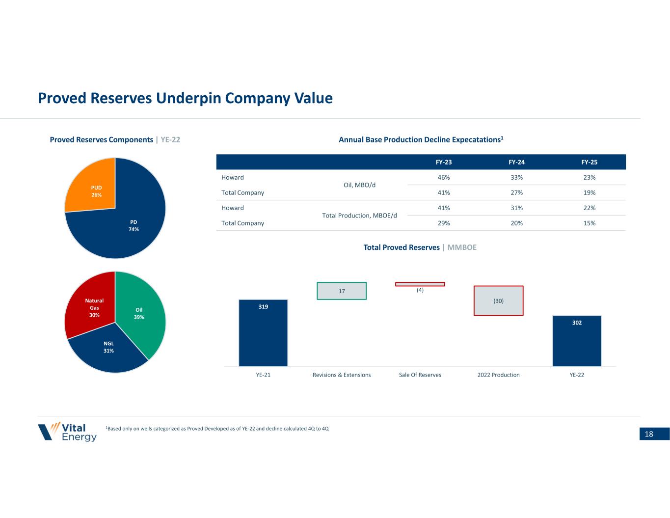 Proved Reserves Underpin Company Value 1Based only on wells categorized as Proved Developed as of YE-22 and decline calculated 4Q to 4Q 18 Proved Reserves Components | YE-22 Annual Base Production Decline Expecatations1 Total Proved Reserves | MMBOE PD 74% PUD 26% FY-25FY-24FY-23 23%33%46% Oil, MBO/d Howard 19%27%41%Total Company 22%31%41% Total Production, MBOE/d Howard 15%20%29%Total Company Oil 39% NGL 31% Natural Gas 30% 319 302 17 (4) (30) YE-21 Revisions & Extensions Sale Of Reserves 2022 Production YE-22