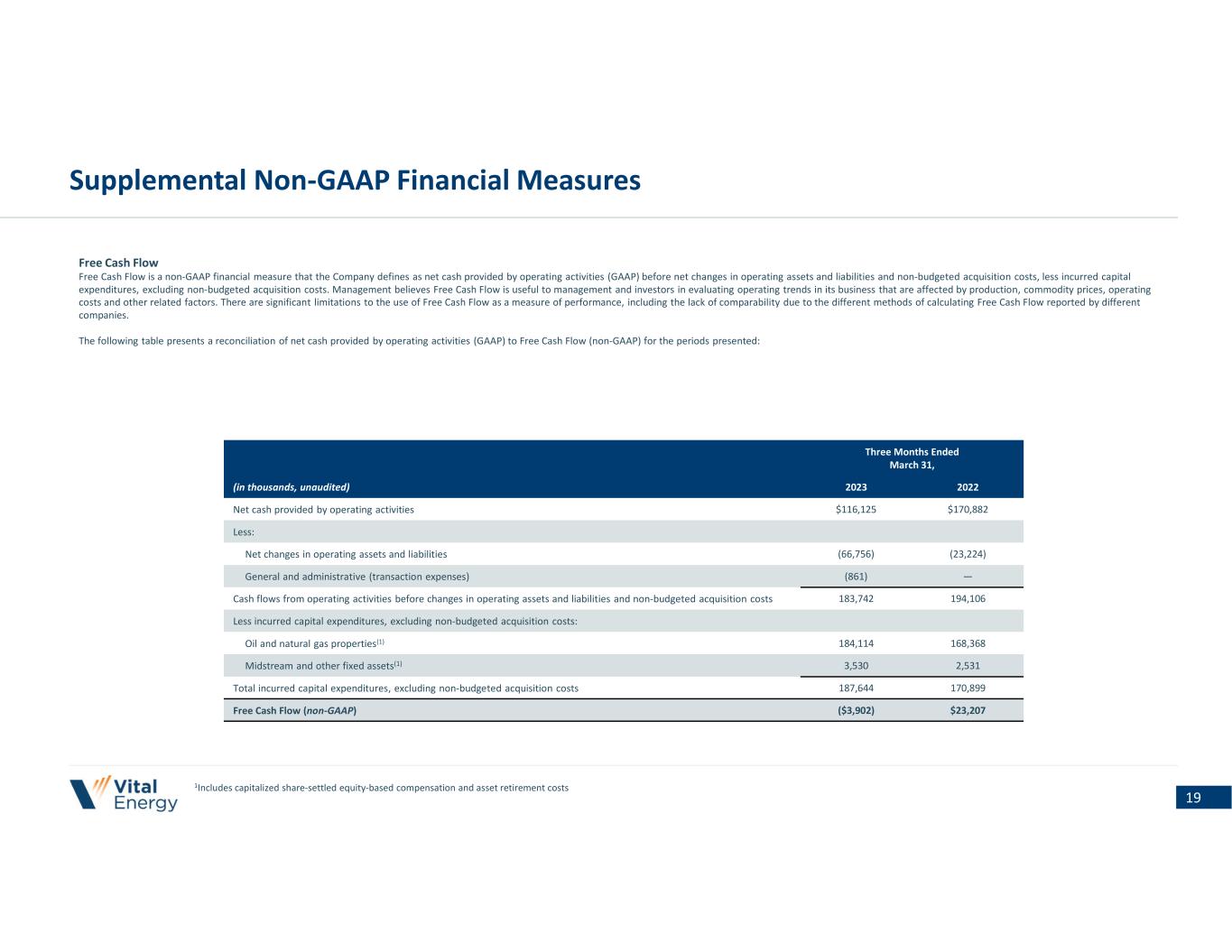 Supplemental Non-GAAP Financial Measures 1Includes capitalized share-settled equity-based compensation and asset retirement costs 19 Free Cash Flow Free Cash Flow is a non-GAAP financial measure that the Company defines as net cash provided by operating activities (GAAP) before net changes in operating assets and liabilities and non-budgeted acquisition costs, less incurred capital expenditures, excluding non-budgeted acquisition costs. Management believes Free Cash Flow is useful to management and investors in evaluating operating trends in its business that are affected by production, commodity prices, operating costs and other related factors. There are significant limitations to the use of Free Cash Flow as a measure of performance, including the lack of comparability due to the different methods of calculating Free Cash Flow reported by different companies. The following table presents a reconciliation of net cash provided by operating activities (GAAP) to Free Cash Flow (non-GAAP) for the periods presented: Three Months Ended March 31, 20222023(in thousands, unaudited) $170,882$116,125Net cash provided by operating activities Less: (23,224)(66,756)Net changes in operating assets and liabilities —(861)General and administrative (transaction expenses) 194,106183,742Cash flows from operating activities before changes in operating assets and liabilities and non-budgeted acquisition costs Less incurred capital expenditures, excluding non-budgeted acquisition costs: 168,368184,114Oil and natural gas properties(1) 2,5313,530Midstream and other fixed assets(1) 170,899187,644Total incurred capital expenditures, excluding non-budgeted acquisition costs $23,207($3,902) Free Cash Flow (non-GAAP)