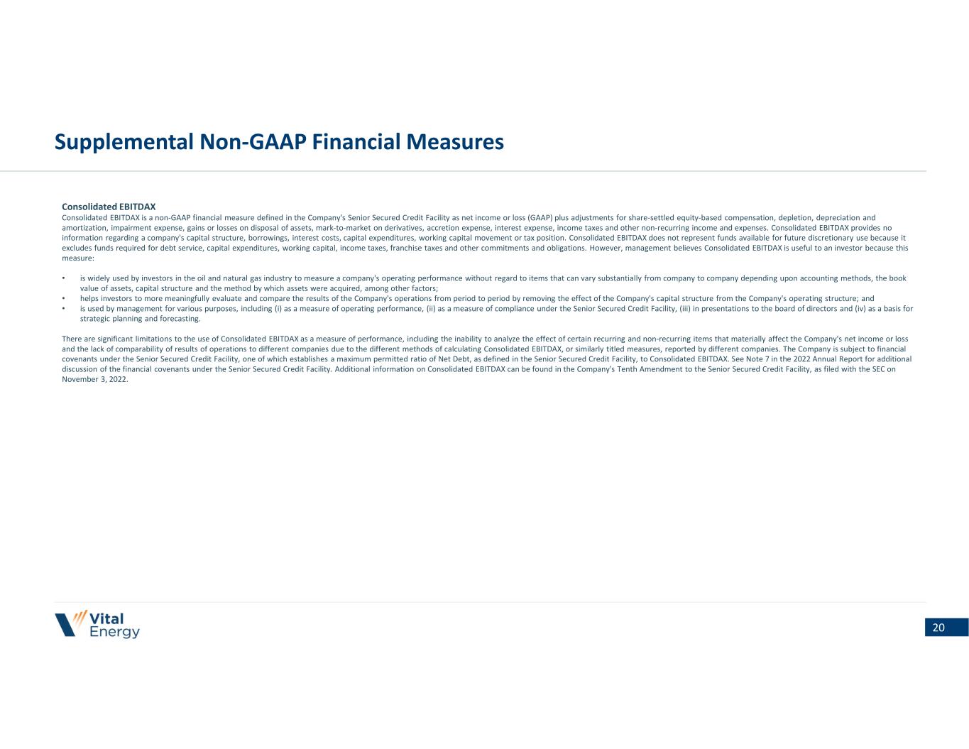 Supplemental Non-GAAP Financial Measures 20 Consolidated EBITDAX Consolidated EBITDAX is a non-GAAP financial measure defined in the Company's Senior Secured Credit Facility as net income or loss (GAAP) plus adjustments for share-settled equity-based compensation, depletion, depreciation and amortization, impairment expense, gains or losses on disposal of assets, mark-to-market on derivatives, accretion expense, interest expense, income taxes and other non-recurring income and expenses. Consolidated EBITDAX provides no information regarding a company's capital structure, borrowings, interest costs, capital expenditures, working capital movement or tax position. Consolidated EBITDAX does not represent funds available for future discretionary use because it excludes funds required for debt service, capital expenditures, working capital, income taxes, franchise taxes and other commitments and obligations. However, management believes Consolidated EBITDAX is useful to an investor because this measure: • is widely used by investors in the oil and natural gas industry to measure a company's operating performance without regard to items that can vary substantially from company to company depending upon accounting methods, the book value of assets, capital structure and the method by which assets were acquired, among other factors; • helps investors to more meaningfully evaluate and compare the results of the Company's operations from period to period by removing the effect of the Company's capital structure from the Company's operating structure; and • is used by management for various purposes, including (i) as a measure of operating performance, (ii) as a measure of compliance under the Senior Secured Credit Facility, (iii) in presentations to the board of directors and (iv) as a basis for strategic planning and forecasting. There are significant limitations to the use of Consolidated EBITDAX as a measure of performance, including the inability to analyze the effect of certain recurring and non-recurring items that materially affect the Company's net income or loss and the lack of comparability of results of operations to different companies due to the different methods of calculating Consolidated EBITDAX, or similarly titled measures, reported by different companies. The Company is subject to financial covenants under the Senior Secured Credit Facility, one of which establishes a maximum permitted ratio of Net Debt, as defined in the Senior Secured Credit Facility, to Consolidated EBITDAX. See Note 7 in the 2022 Annual Report for additional discussion of the financial covenants under the Senior Secured Credit Facility. Additional information on Consolidated EBITDAX can be found in the Company's Tenth Amendment to the Senior Secured Credit Facility, as filed with the SEC on November 3, 2022.