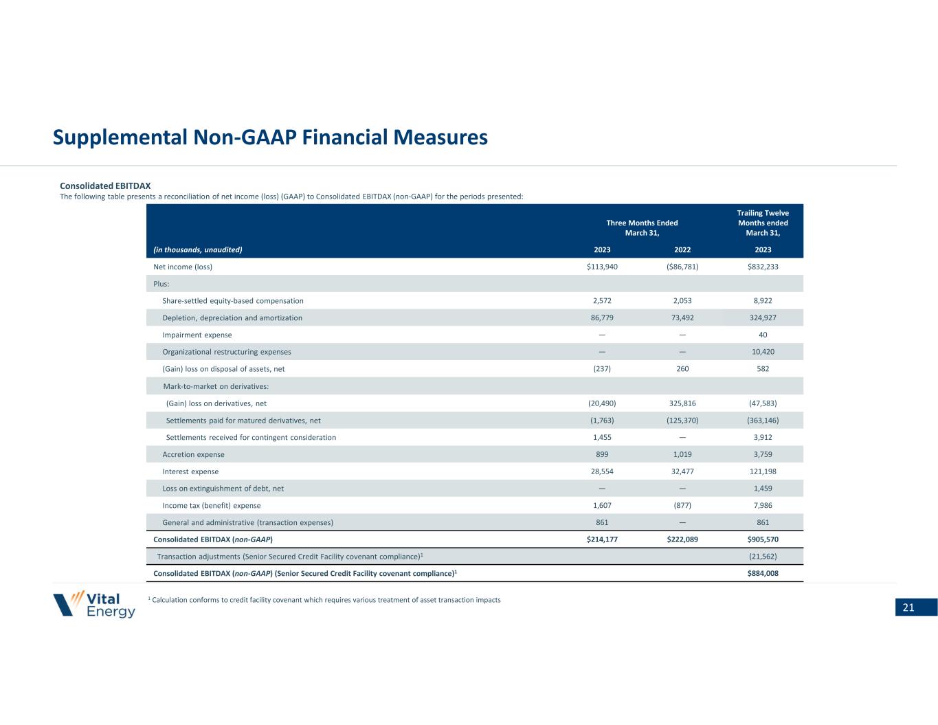 Supplemental Non-GAAP Financial Measures 1 Calculation conforms to credit facility covenant which requires various treatment of asset transaction impacts 21 Consolidated EBITDAX The following table presents a reconciliation of net income (loss) (GAAP) to Consolidated EBITDAX (non-GAAP) for the periods presented: Trailing Twelve Months ended March 31, Three Months Ended March 31, 202320222023(in thousands, unaudited) $832,233($86,781)$113,940Net income (loss) Plus: 8,9222,0532,572Share-settled equity-based compensation 324,92773,49286,779Depletion, depreciation and amortization 40——Impairment expense 10,420——Organizational restructuring expenses 582260(237)(Gain) loss on disposal of assets, net Mark-to-market on derivatives: (47,583)325,816(20,490)(Gain) loss on derivatives, net (363,146)(125,370)(1,763)Settlements paid for matured derivatives, net 3,912—1,455Settlements received for contingent consideration 3,7591,019899Accretion expense 121,19832,47728,554Interest expense 1,459——Loss on extinguishment of debt, net 7,986(877)1,607Income tax (benefit) expense 861—861General and administrative (transaction expenses) $905,570$222,089$214,177Consolidated EBITDAX (non-GAAP) (21,562)Transaction adjustments (Senior Secured Credit Facility covenant compliance)1 $884,008Consolidated EBITDAX (non-GAAP) (Senior Secured Credit Facility covenant compliance)1
