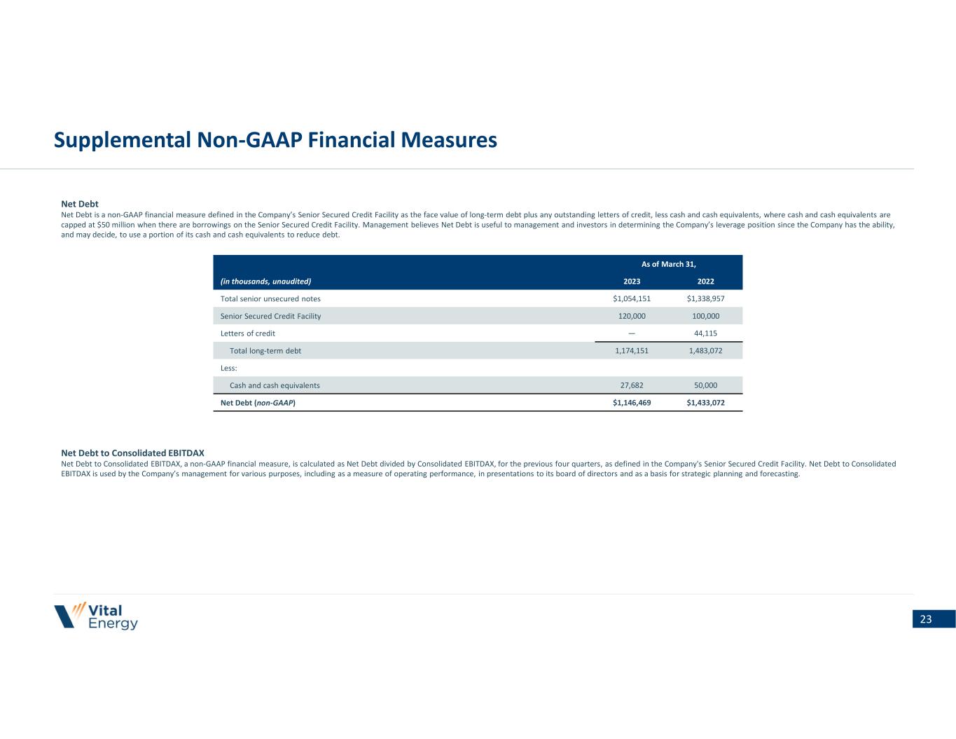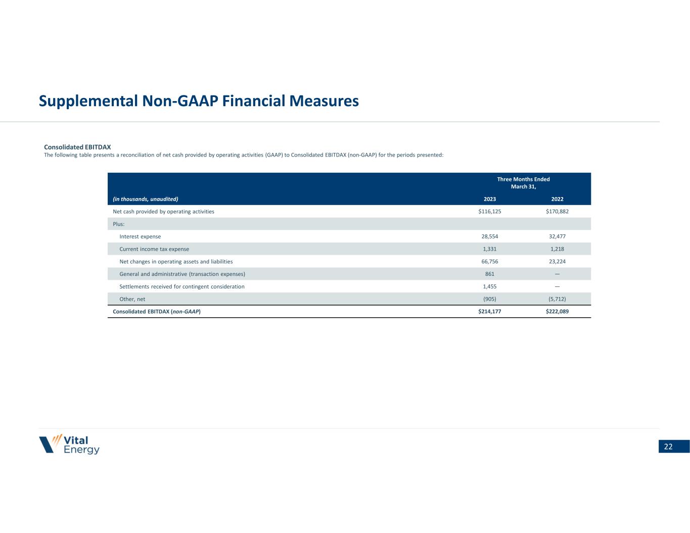 Supplemental Non-GAAP Financial Measures 22 Consolidated EBITDAX The following table presents a reconciliation of net cash provided by operating activities (GAAP) to Consolidated EBITDAX (non-GAAP) for the periods presented: Three Months Ended March 31, 20222023(in thousands, unaudited) $170,882$116,125Net cash provided by operating activities Plus: 32,47728,554Interest expense 1,2181,331Current income tax expense 23,22466,756Net changes in operating assets and liabilities —861General and administrative (transaction expenses) —1,455Settlements received for contingent consideration (5,712)(905)Other, net $222,089$214,177Consolidated EBITDAX (non-GAAP)