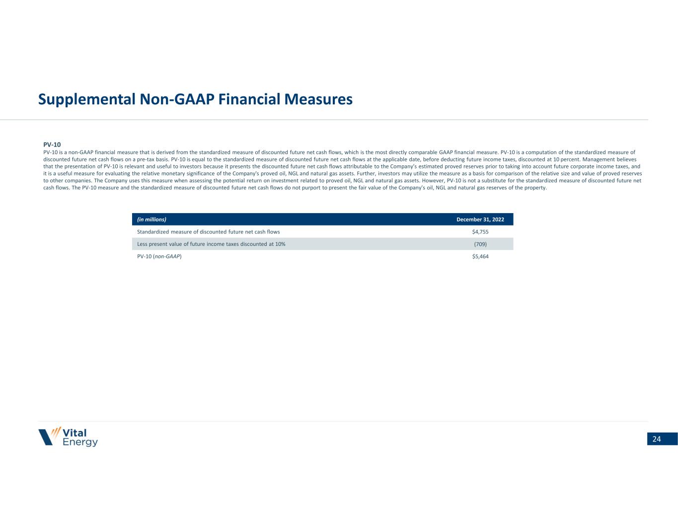 Supplemental Non-GAAP Financial Measures 24 PV-10 PV-10 is a non-GAAP financial measure that is derived from the standardized measure of discounted future net cash flows, which is the most directly comparable GAAP financial measure. PV-10 is a computation of the standardized measure of discounted future net cash flows on a pre-tax basis. PV-10 is equal to the standardized measure of discounted future net cash flows at the applicable date, before deducting future income taxes, discounted at 10 percent. Management believes that the presentation of PV-10 is relevant and useful to investors because it presents the discounted future net cash flows attributable to the Company’s estimated proved reserves prior to taking into account future corporate income taxes, and it is a useful measure for evaluating the relative monetary significance of the Company's proved oil, NGL and natural gas assets. Further, investors may utilize the measure as a basis for comparison of the relative size and value of proved reserves to other companies. The Company uses this measure when assessing the potential return on investment related to proved oil, NGL and natural gas assets. However, PV-10 is not a substitute for the standardized measure of discounted future net cash flows. The PV-10 measure and the standardized measure of discounted future net cash flows do not purport to present the fair value of the Company’s oil, NGL and natural gas reserves of the property. December 31, 2022(in millions) $4,755Standardized measure of discounted future net cash flows (709) Less present value of future income taxes discounted at 10% $5,464 PV-10 (non-GAAP)