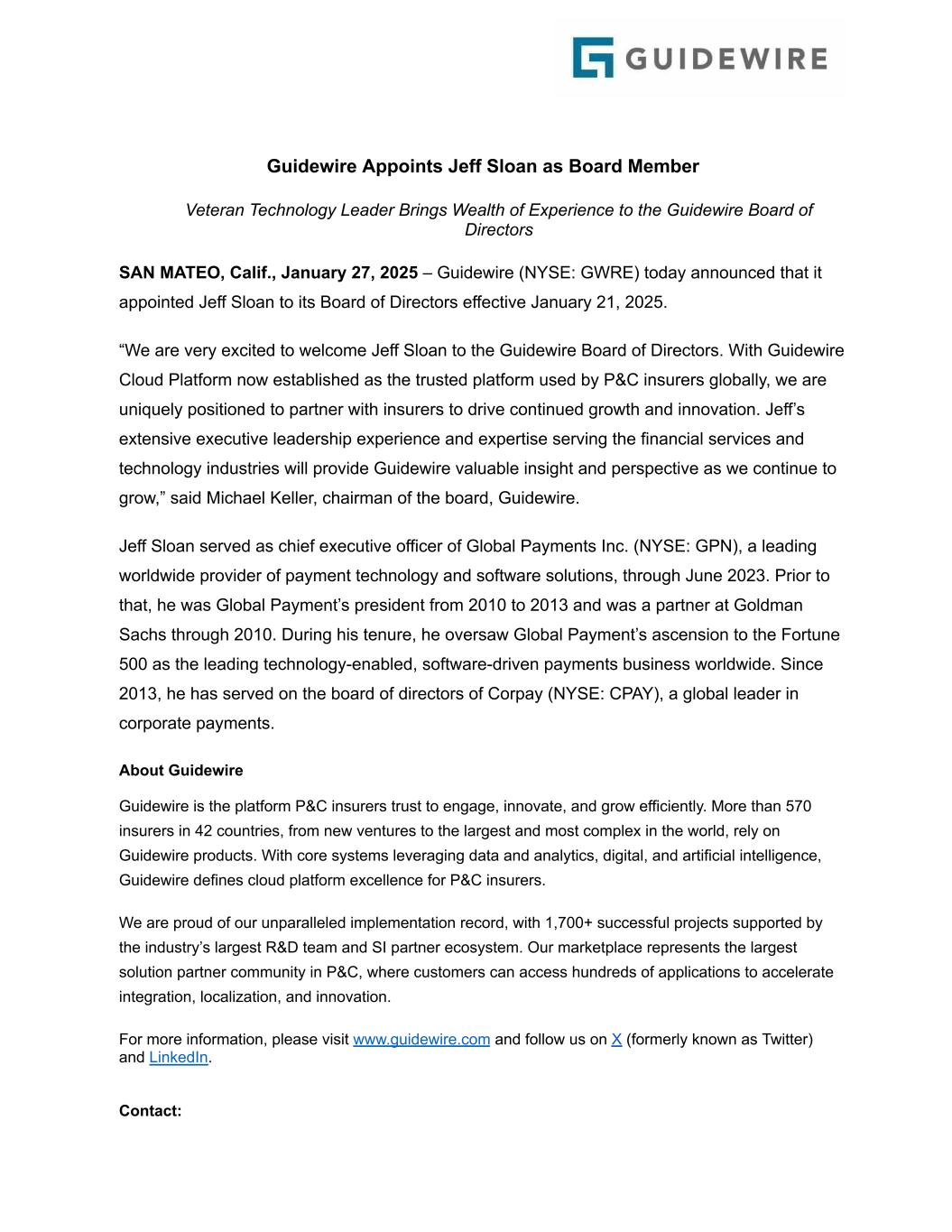 Guidewire Appoints Jeff Sloan as Board Member Veteran Technology Leader Brings Wealth of Experience to the Guidewire Board of Directors SAN MATEO, Calif., January 27, 2025 – Guidewire (NYSE: GWRE) today announced that it appointed Jeff Sloan to its Board of Directors effective January 21, 2025. “We are very excited to welcome Jeff Sloan to the Guidewire Board of Directors. With Guidewire Cloud Platform now established as the trusted platform used by P&C insurers globally, we are uniquely positioned to partner with insurers to drive continued growth and innovation. Jeff’s extensive executive leadership experience and expertise serving the financial services and technology industries will provide Guidewire valuable insight and perspective as we continue to grow,” said Michael Keller, chairman of the board, Guidewire. Jeff Sloan served as chief executive officer of Global Payments Inc. (NYSE: GPN), a leading worldwide provider of payment technology and software solutions, through June 2023. Prior to that, he was Global Payment’s president from 2010 to 2013 and was a partner at Goldman Sachs through 2010. During his tenure, he oversaw Global Payment’s ascension to the Fortune 500 as the leading technology-enabled, software-driven payments business worldwide. Since 2013, he has served on the board of directors of Corpay (NYSE: CPAY), a global leader in corporate payments. About Guidewire Guidewire is the platform P&C insurers trust to engage, innovate, and grow efficiently. More than 570 insurers in 42 countries, from new ventures to the largest and most complex in the world, rely on Guidewire products. With core systems leveraging data and analytics, digital, and artificial intelligence, Guidewire defines cloud platform excellence for P&C insurers. We are proud of our unparalleled implementation record, with 1,700+ successful projects supported by the industry’s largest R&D team and SI partner ecosystem. Our marketplace represents the largest solution partner community in P&C, where customers can access hundreds of applications to accelerate integration, localization, and innovation. For more information, please visit www.guidewire.com and follow us on X (formerly known as Twitter) and LinkedIn. Contact: