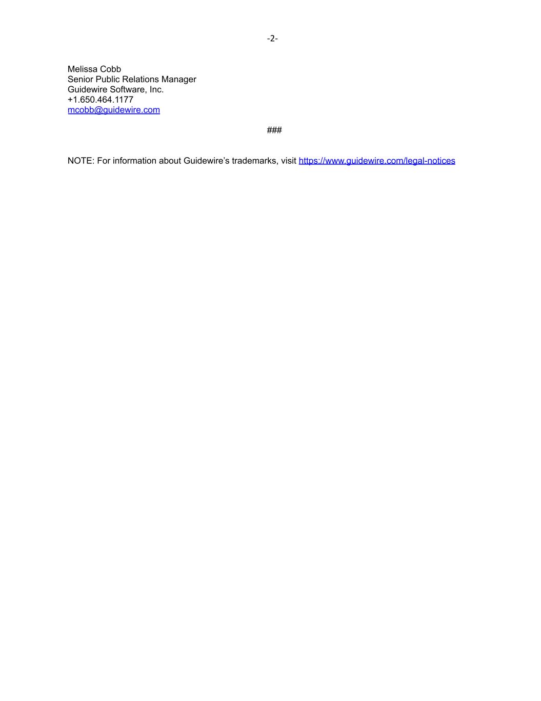 -2- Melissa Cobb Senior Public Relations Manager Guidewire Software, Inc. +1.650.464.1177 mcobb@guidewire.com ### NOTE: For information about Guidewire’s trademarks, visit https://www.guidewire.com/legal-notices