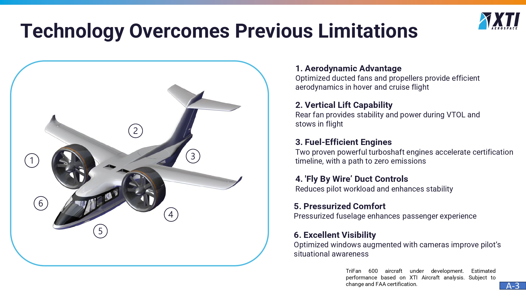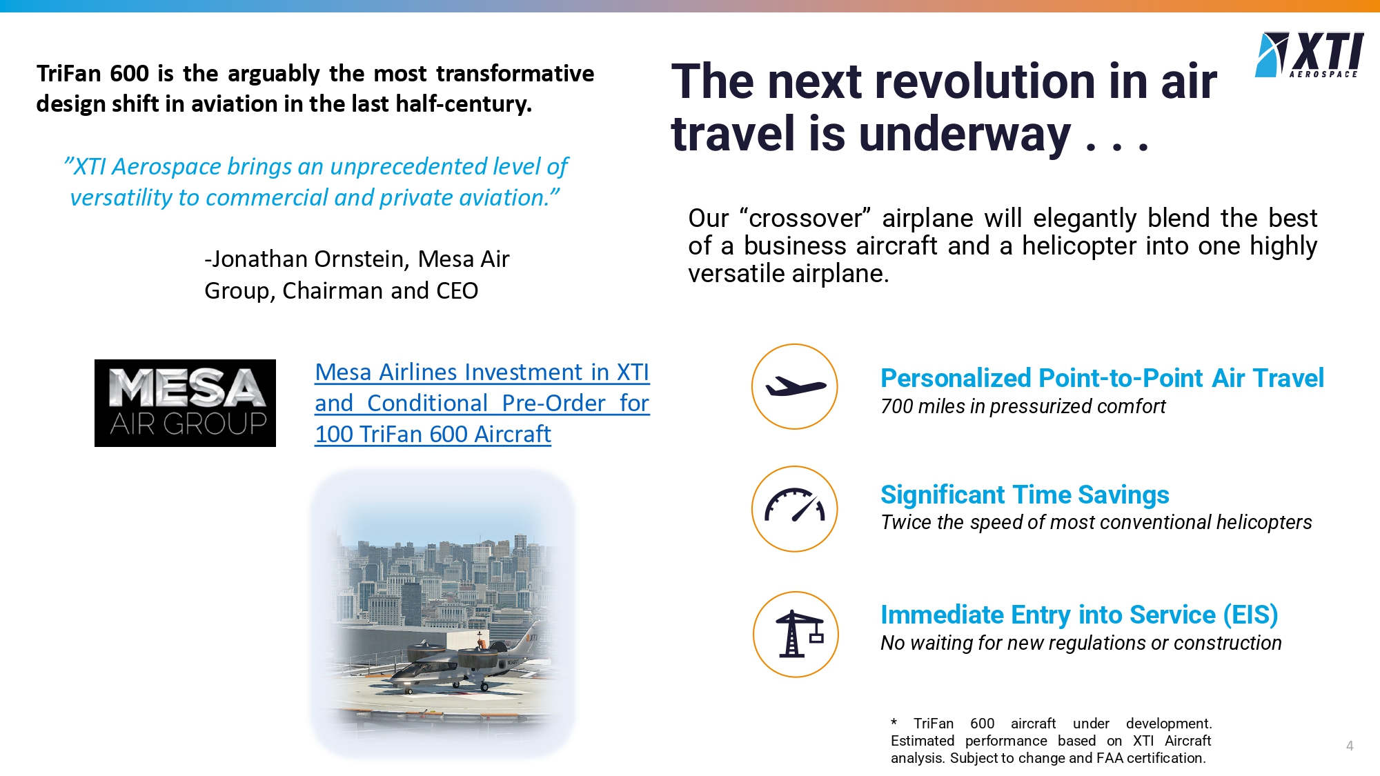 4 ľkc ⭲ cxt íc:olutio ⭲ i ⭲ aií tía:cl is u ⭲ dcíwaQ . . . O"í “cíosso:cí” aiípla ⭲ c will clcga ⭲ tlQ blc ⭲ d tkc bcst or a b"si ⭲ css aiícíart a ⭲ d a kclicoptcí i ⭲ to o ⭲ c kigklQ :císatilc aiípla ⭲ c. Pcíso ⭲ alizcd Poi ⭲ t - to - Poi ⭲ t Aií ľía:cl 700 ½iles i ⭲ píessuíized co½roíť Sig ⭲ ifica ⭲ t ľimc Sa:i ⭲ gs ľ ice ť”e speed or ½osť co ⭲ »e ⭲ ťio ⭲ al ”elicopťeís Immcdiatc E ⭲ tíQ i ⭲ to Scí:icc (EIS) No aiťi ⭲ g roí ⭲ e íegulaťio ⭲ s oí co ⭲ sťíucťio ⭲ * ľíiIa ⭲ 600 aiícíart " ⭲ dcí dc : clopmc ⭲ t . Estimatcd pcíroíma ⭲ cc bascd o ⭲ XľI Aiícíart a ⭲ alQsis . S"bjcct to cka ⭲ gc a ⭲ d IAA ccítiricatio ⭲ . TriFan 600 is the arguably the most transformative design shift in aviation in the last half - century. ”XTI Aerospace brings an unprecedented level of versatility to commercial and private aviation.” - Jonathan Ornstein, Mesa Air Group, Chairman and CEO Mesa Airlines Investment in XTI and Conditional Pre - Order for 100 TriFan 600 Aircraft
