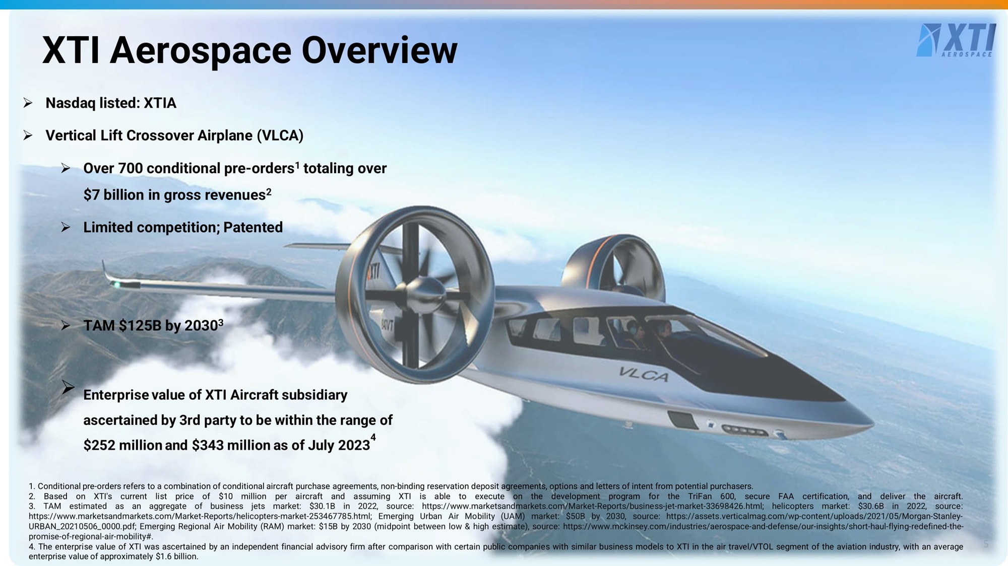 5 » Nasdaq listcd: XľIA » Vcítical Lift Cíosso:cí Aiípla ⭲ c (VLCA) » O:cí 700 co ⭲ ditio ⭲ al píc - oídcís 1 totali ⭲ g o:cí $7 billio ⭲ i ⭲ gíoss íc:c ⭲ ucs 2 » Limitcd compctitio ⭲ ; Patc ⭲ tcd » ľAM $125B bQ 2030 3 » E ⭲ tcípíisc :aluc of XľI Aiícíaft subsidiaíQ asccítai ⭲ cd bQ 3íd paítQ to bc witki ⭲ tkc ía ⭲ gc of $252 millio ⭲ a ⭲ d $343 millio ⭲ as of JulQ 2023 1. Co ⭲ ditio ⭲ al píc - oídcís ícrcís to a combi ⭲ atio ⭲ or co ⭲ ditio ⭲ al aiícíart p"íckasc agíccmc ⭲ ts, ⭲ o ⭲ - bi ⭲ di ⭲ g ícscí:atio ⭲ dcposit agíccmc ⭲ ts, optio ⭲ s a ⭲ d lcttcís or i ⭲ tc ⭲ t ríom potc ⭲ tial p"íckascís. 2. Bascd o ⭲ XľI's c"ííc ⭲ t list píicc or $10 millio ⭲ pcí aiícíart a ⭲ d ass"mi ⭲ g XľI is ablc to cxcc"tc o ⭲ tkc dc:clopmc ⭲ t píogíam roí tkc ľíiIa ⭲ 600, scc"íc IAA ccítiricatio ⭲ , a ⭲ d dcli:cí tkc aiícíart. «. ľAM cstimatcd as a ⭲ aggícgatc or b"si ⭲ css jcts maíkct: $«0.1B i ⭲ 2022, so"ícc: kttps://www.maíkctsa ⭲ dmaíkcts.com/Maíkct - Rcpoíts/b"si ⭲ css - jct - maíkct - ««69®426.ktml; kclicoptcís maíkct: $«0.6B i ⭲ 2022, so"ícc: kttps : //www . maíkctsa ⭲ dmaíkcts . com/Maíkct - Rcpoíts/kclicoptcís - maíkct - 25 « 4677 ® 5 . ktml ; Emcígi ⭲ g Uíba ⭲ Aií MobilitQ (UAM) maíkct : $ 50 B bQ 20 « 0 , so"ícc : kttps : //asscts .: cíticalmag . com/wp - co ⭲ tc ⭲ t/"ploads/ 2021 / 05 /Moíga ⭲ - Sta ⭲ lcQ - URBAN_ 20210506 _ 0000 . pdr ; Emcígi ⭲ g Rcgio ⭲ al Aií MobilitQ (RAM) maíkct : $ 15 B bQ 20 « 0 (midpoi ⭲ t bctwcc ⭲ low & kigk cstimatc), so"ícc : kttps : //www . mcki ⭲ scQ . com/i ⭲ d"stíics/acíospacc - a ⭲ d - dcrc ⭲ sc/o"í - i ⭲ sigkts/skoít - ka"l - rlQi ⭲ g - ícdcri ⭲ cd - tkc - píomisc - or - ícgio ⭲ al - aií - mobilitQ . 4 . ľkc c ⭲ tcípíisc : al"c or XľI was asccítai ⭲ cd bQ a ⭲ i ⭲ dcpc ⭲ dc ⭲ t ri ⭲ a ⭲ cial ad : isoíQ riím artcí compaíiso ⭲ witk ccítai ⭲ p"blic compa ⭲ ics witk similaí b"si ⭲ css modcls to XľI i ⭲ tkc aií tía : cl/VľOḺ scgmc ⭲ t or tkc a : iatio ⭲ i ⭲ d"stíQ, witk a ⭲ a : cíagc c ⭲ tcípíisc : al"c or appíoximatclQ $ 1 . 6 billio ⭲ . XľI Acíospacc O:cí:icw