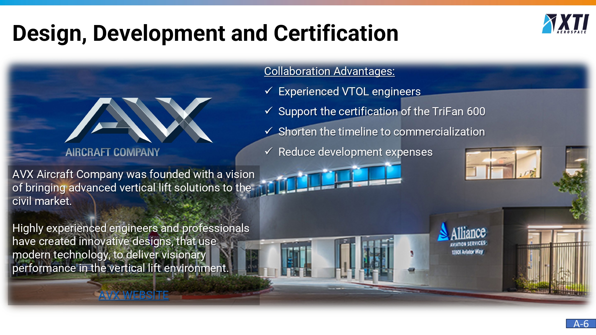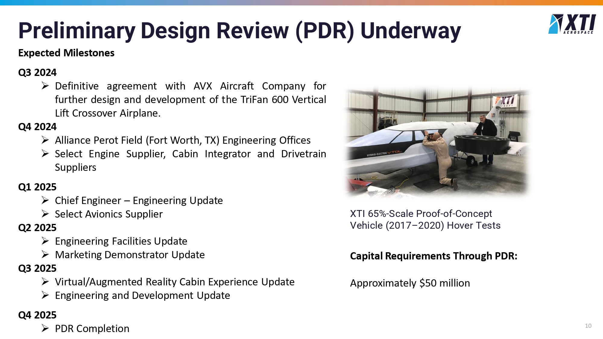 10 Píclimi ⭲ aíQ Dcsig ⭲ Rc:icw (PDR) U ⭲ dcíwaQ Expected Milestones Q3 2024 » Definitive agreement with AVX Aircraft Company for further design and development of the TriFan 600 Vertical Lift Crossover Airplane. Q4 2024 » Alliance Perot Field (Fort Worth, TX) Engineering Offices » Select Engine Supplier, Cabin Integrator and Drivetrain Suppliers Q1 2025 » Chief Engineer – Engineering Update » Select Avionics Supplier Q2 2025 » Engineering Facilities Update » Marketing Demonstrator Update Q3 2025 » Virtual/Augmented Reality Cabin Experience Update » Engineering and Development Update Q4 2025 » PDR Completion Capital Requirements Through PDR: Approximately $50 million XľI 65% - Scalc Píoor - or - Co ⭲ ccpt Vckiclc (2017 – 2020) Ho:cí ľcsts