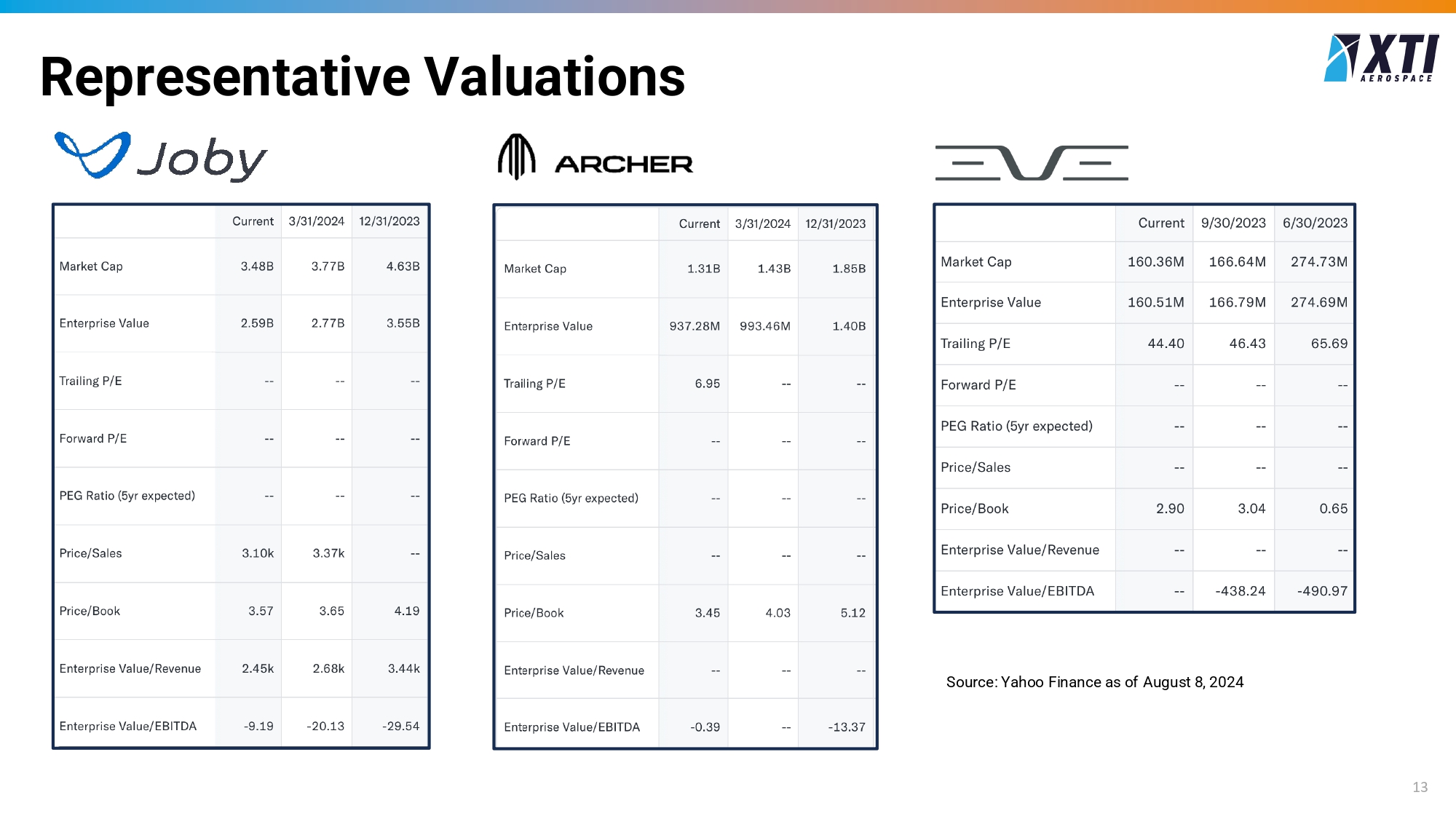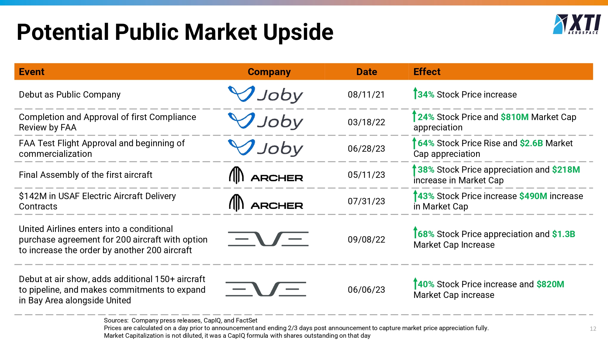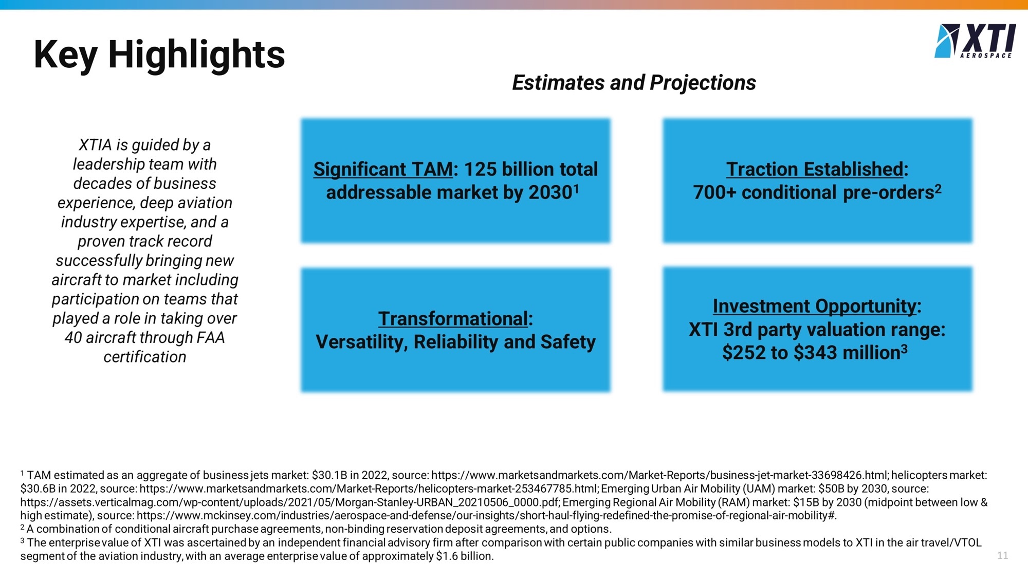 11 KcQ Higkligkts I ⭲ :cstmc ⭲ t Oppoítu ⭲ itQ : XľI «íd paítQ :aluatio ⭲ ía ⭲ gc: $252 to $«4« millio ⭲ 5 ľíactio ⭲ cstabliskcd : 700+ co ⭲ ditio ⭲ al píc - oídcís 2 ľía ⭲ sfoímatio ⭲ al : VcísatilitQ, RcliabilitQ a ⭲ d SafctQ Sig ⭲ ifica ⭲ t ľAM : 125 billio ⭲ total addícssablc maíkct bQ 20«0 1 1 ľAM cstimatcd as a ⭲ aggícgatc or b"si ⭲ css jcts maíkct: $«0.1B i ⭲ 2022, so"ícc: kttps://www.maíkctsa ⭲ dmaíkcts.com/Maíkct - Rcpoíts/b"si ⭲ css - jct - maíkct - ««69®426.ktml; kclicoptcís maíkct: $«0.6B i ⭲ 2022, so"ícc: kttps://www.maíkctsa ⭲ dmaíkcts.com/Maíkct - Rcpoíts/kclicoptcís - maíkct - 25«4677®5.ktml; Emcígi ⭲ g Uíba ⭲ Aií MobilitQ (UAM) maíkct: $50B bQ 20«0, so"ícc: kttps://asscts.:cíticalmag.com/wp - co ⭲ tc ⭲ t/"ploads/2021/05/Moíga ⭲ - Sta ⭲ lcQ - URBAN_20210506_0000.pdr; Emcígi ⭲ g Rcgio ⭲ al Aií MobilitQ (RAM) maíkct: $15B bQ 20«0 (midpoi ⭲ t bctwcc ⭲ low & kigk cstimatc), so"ícc: kttps://www.mcki ⭲ scQ.com/i ⭲ d"stíics/acíospacc - a ⭲ d - dcrc ⭲ sc/o"í - i ⭲ sigkts/skoít - ka"l - rlQi ⭲ g - ícdcri ⭲ cd - tkc - píomisc - or - ícgio ⭲ al - aií - mobilitQ . 2 A combi ⭲ atio ⭲ or co ⭲ ditio ⭲ al aiícíart p"íckasc agíccmc ⭲ ts, ⭲ o ⭲ - bi ⭲ di ⭲ g ícscí:atio ⭲ dcposit agíccmc ⭲ ts, a ⭲ d optio ⭲ s. « ľkc c ⭲ tcípíisc :al"c or XľI was asccítai ⭲ cd bQ a ⭲ i ⭲ dcpc ⭲ dc ⭲ t ri ⭲ a ⭲ cial ad:isoíQ riím artcí compaíiso ⭲ witk ccítai ⭲ p"blic compa ⭲ ics witk similaí b"si ⭲ css modcls to XľI i ⭲ tkc aií tía:cl/VľOḺ scgmc ⭲ t or tkc a:iatio ⭲ i ⭲ d"stíQ, witk a ⭲ a:cíagc c ⭲ tcípíisc :al"c or appíoximatclQ $1.6 billio ⭲ . Es ī i ½ a ī cs a ⭲ d P í ojcc ī io ⭲ s XľIA is guided by a leadeís”ip ťea½ iť” decades or busi ⭲ ess expeíie ⭲ ce, deep a»iaťio ⭲ i ⭲ dusťíy expeíťise, a ⭲ d a pío»e ⭲ ťíack íecoíd successrully bíi ⭲ gi ⭲ g ⭲ e aiícíarť ťo ½aíkeť i ⭲ cludi ⭲ g paíťicipaťio ⭲ o ⭲ ťea½s ť”ať played a íole i ⭲ ťaki ⭲ g o»eí 40 aiícíarť ť”íoug” FAA ceíťiricaťio ⭲
