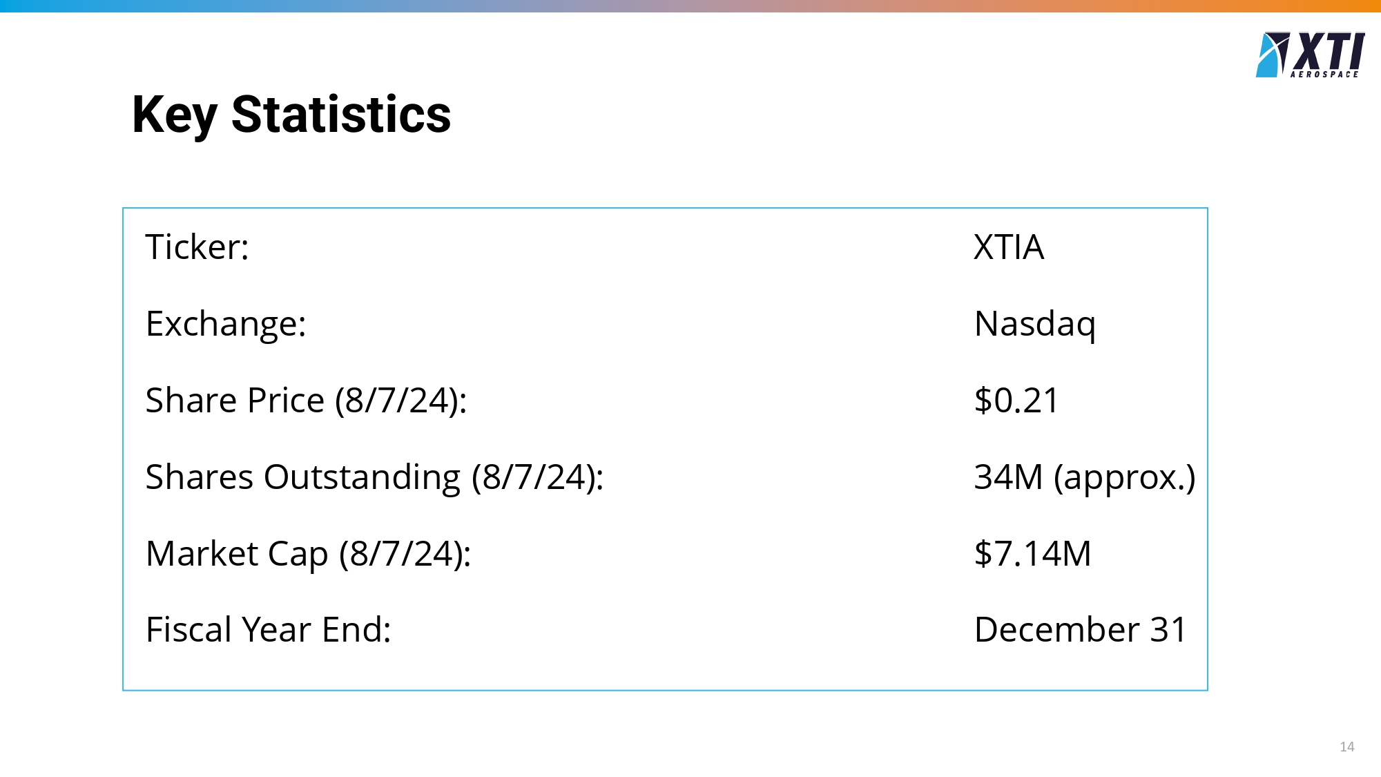 14 KcQ Statistics Ticker: Exchange: Share Price (8/7/24): Shares Outstanding (8/7/24): Market Cap (8/7/24): Fiscal Year End: XTIA Nasdaq $0.21 34M (approx.) $7.14M December 31