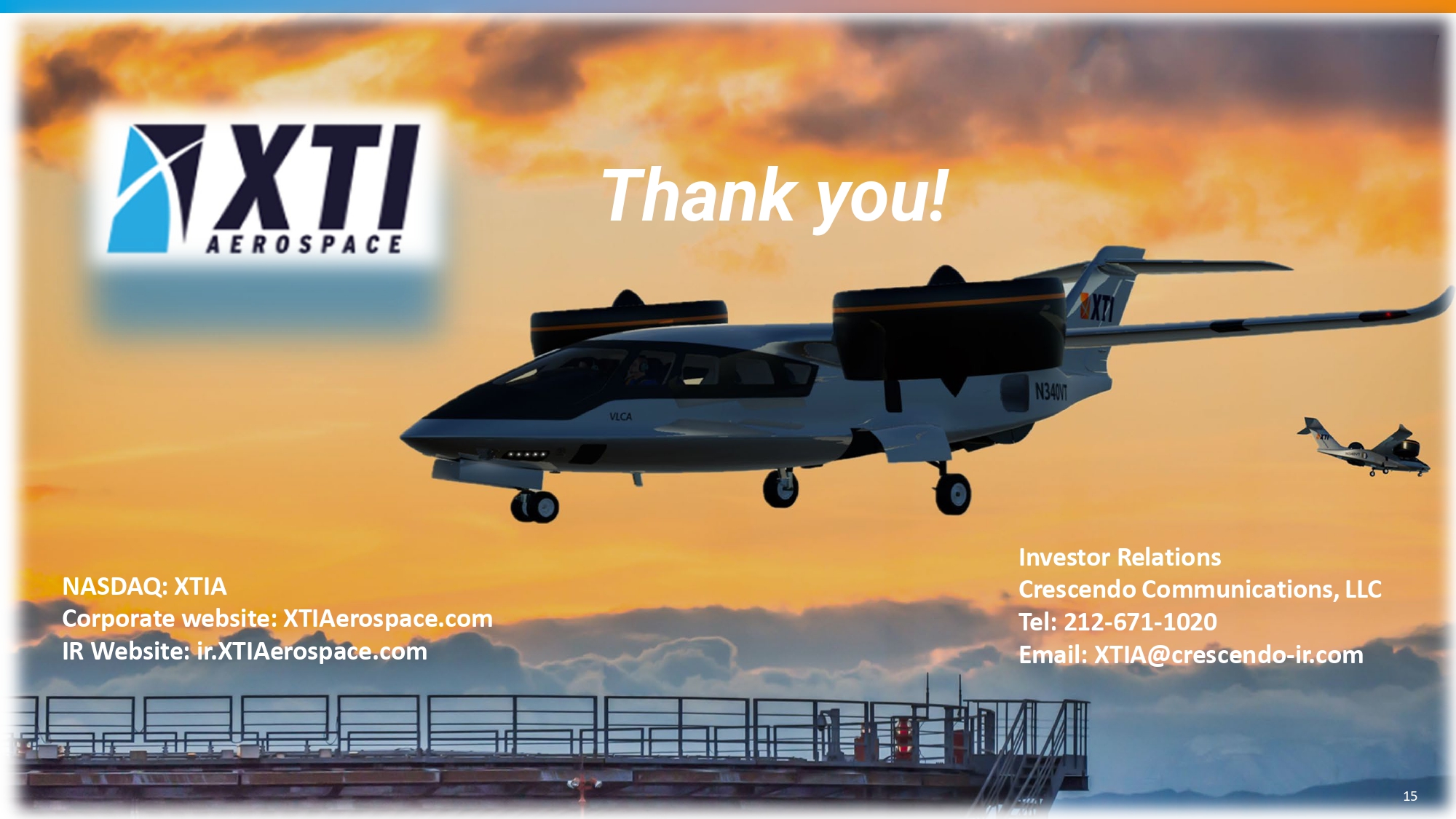 15 ľ ka ⭲½ Qou! Investor Relations Crescendo Communications, LLC Tel: 212 - 671 - 1020 Email: XTIA@crescendo - ir.com NASDAQ: XTIA Corporate website: XTIAerospace.com IR Website: ir.XTIAerospace.com 15