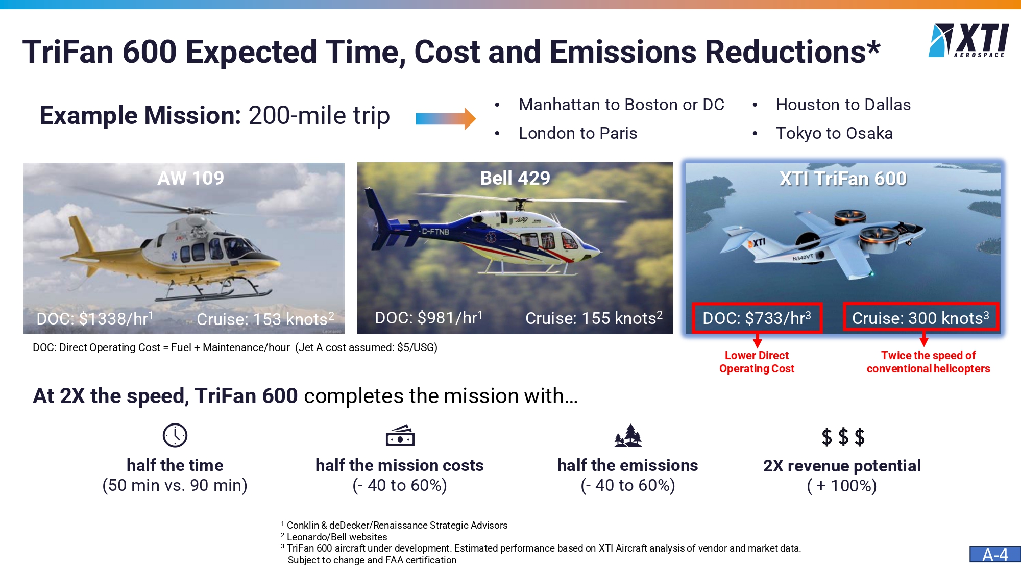 20 ľíiÏa ⭲ G00 Expcctcd ľimc, Cost a ⭲ d Emissio ⭲ s Rcductio ⭲ s* • Ma ⭲ katta ⭲ to Bosto ⭲ oí KC • Ḻo ⭲ do ⭲ to Paíis Examplc Missio ⭲ : 200 - milc tíip • Ho"sto ⭲ to Kallas • ľokQo to Osaka XľI ľíiÏa ⭲ G00 KOC: $7««/kí « Cí"isc: «00 k ⭲ ots « Bcll 429 Cí"isc: 155 k ⭲ ots 2 At 2X tkc spccd, ľíiÏa ⭲ G00 complctcs tkc missio ⭲ witk… kalf tkc missio ⭲ costs ( - 40 to 60%) kalf tkc timc (50 mi ⭲ :s. 90 mi ⭲ ) kalf tkc cmissio ⭲ s ( - 40 to 60%) 2X íc:c ⭲ uc potc ⭲ tial ( : 100%) Lowcí Diícct Opcíati ⭲ g Cost ľwicc tkc spccd of co ⭲ :c ⭲ tio ⭲ al kclicoptcís AW 109 KOC: $1««®/kí 1 Cí"isc: 15« k ⭲ ots 2 KOC: $9®1/kí 1 KOC: Kiícct Opcíati ⭲ g Cost = I"cl : Mai ⭲ tc ⭲ a ⭲ cc/ko"í (Jct A cost ass"mcd: $5/USG) 1 Co ⭲ kli ⭲ & dcKcckcí/Rc ⭲ aissa ⭲ cc Stíatcgic Ad:isoís 2 Ḻco ⭲ aído/Bcll wcbsitcs « ľíiIa ⭲ 600 aiícíart " ⭲ dcí dc:clopmc ⭲ t. Estimatcd pcíroíma ⭲ cc bascd o ⭲ XľI Aiícíart a ⭲ alQsis or :c ⭲ doí a ⭲ d maíkct data. S"bjcct to cka ⭲ gc a ⭲ d IAA ccítiricatio ⭲ A - 4