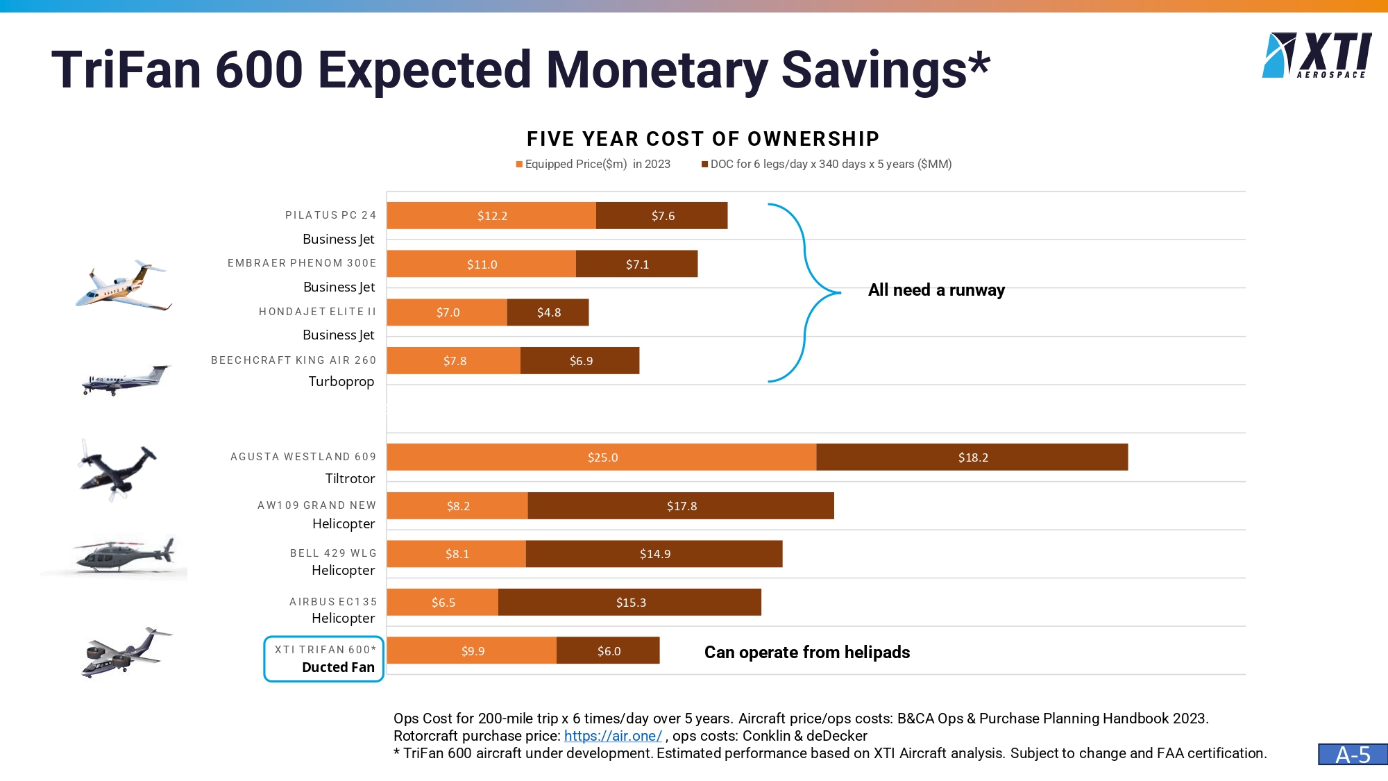 21 ľíiÏa ⭲ G00 Expcctcd Mo ⭲ ctaíQ Sa:i ⭲ gs* Ops Cost roí 200 - milc tíip x 6 timcs/daQ o:cí 5 Qcaís. Aiícíart píicc/ops costs: B&CA Ops & P"íckasc Pla ⭲⭲ i ⭲ g Ha ⭲ dbook 202«. Rotoícíart p"íckasc píicc: kttps://aií.o ⭲ c/ , ops costs: Co ⭲ kli ⭲ & dcKcckcí * ľíiIa ⭲ 600 aiícíart " ⭲ dcí dc:clopmc ⭲ t. Estimatcd pcíroíma ⭲ cc bascd o ⭲ XľI Aiícíart a ⭲ alQsis. S"bjcct to cka ⭲ gc a ⭲ d IAA ccítiricatio ⭲ . $9.9 $6.5 $8.1 $8.2 $25.0 $7.8 $7.0 $11.0 $12.2 $6.0 $15.3 $14.9 $17.8 $18.2 $ $6.9 $4.8 $7.1 $7.6 ÏIVE YEAR COSľ OÏ OWNERSHIP Eq"ippcd Píicc($m) i ⭲ 202« KOC roí 6 lcgs/daQ x «40 daQs x 5 Qcaís ($MM) AG U S ľ A W E S ľ Ḻ AN K 6 0 9 Tiltrotor A W 109 G R A N K N E W Helicopter B E Ḻ Ḻ 4 2 9 W Ḻ G Helicopter X ľ I ľ R I I A N 600* Ducted Fan All ⭲ ccd a íu ⭲ waQ Ca ⭲ opcíatc fíom kclipads P I Ḻ A ľ U S PC 2 4 Business Jet EM B R A ER P H EN O M « 0 0 E Business Jet H O N K A J Eľ EḺ I ľ E I I Business Jet B E E C H C R A I ľ K I N G A I R 2 6 0 Turboprop A I R B U S E C 1«5 Helicopter A - 5