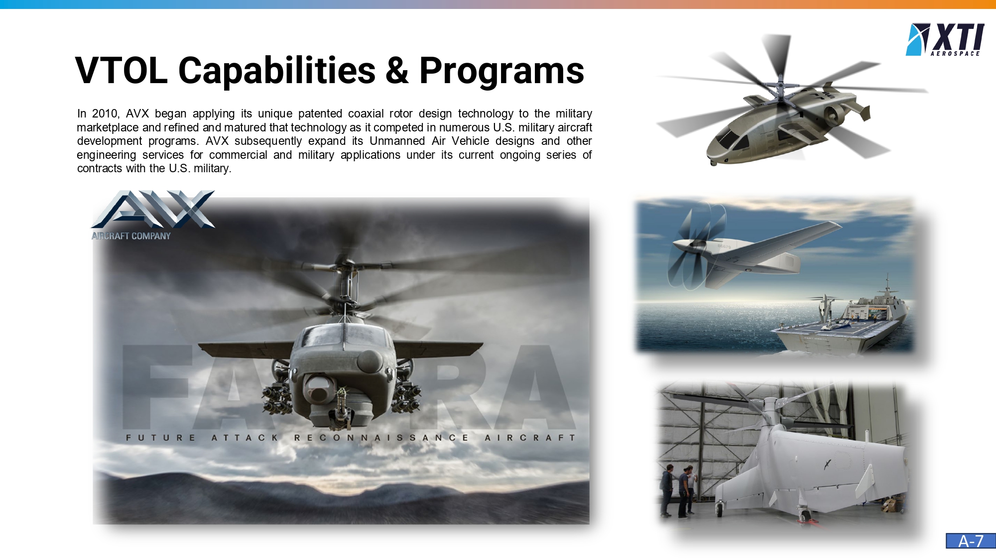 23 VľOL Capabilitics & Píogíams In 2010 , AVX began applying its unique patented coaxial rotor design technology to the military marketplace and refined and matured that technology as it competed in numerous U . S . military aircraft development programs . AVX subsequently expand its Unmanned Air Vehicle designs and other engineering services for commercial and military applications under its current ongoing series of contracts with the U . S . military . A - 7