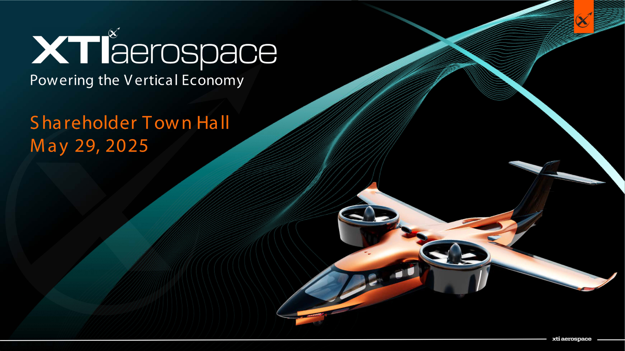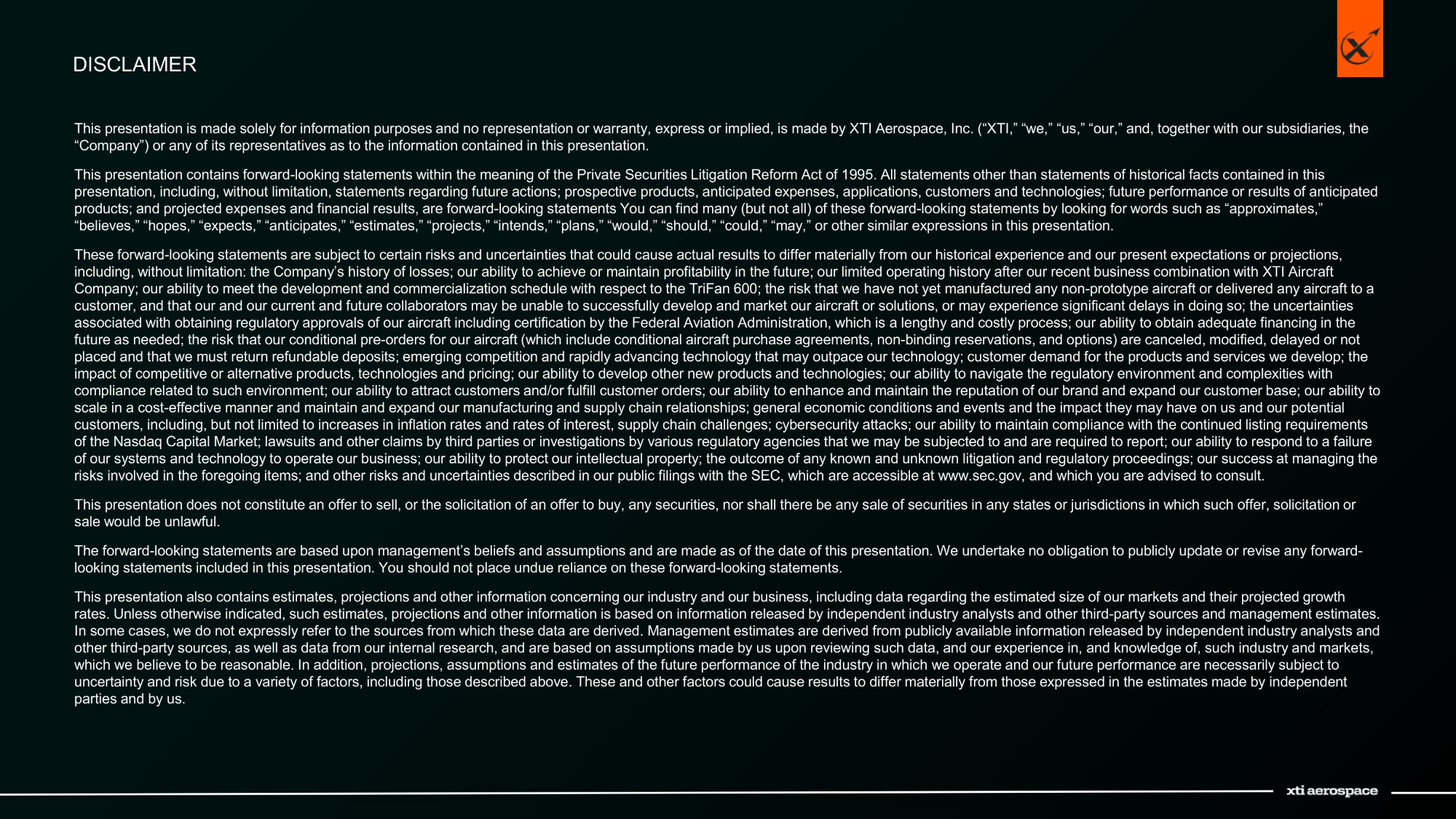 DISCLAIMER This presentation is made solely for information purposes and no representation or warranty, express or implied, is made by X TI Aerospace, Inc. (“XTI,” “we,” “us,” “our,” and, together with our subsidiaries, the “Company”) or any of its representatives as to the information contained in this presentation. This presentation contains forward - looking statements within the meaning of the Private Securities Litigation Reform Act of 1995 . All statements other than statements of historical facts contained in this presentation, including, without limitation, statements regarding future actions; prospective products, anticipated expenses, ap plications, customers and technologies; future performance or results of anticipated products; and projected expenses and financial results, are forward - looking statements You can find many (but not all) of these forward - looking statements by looking for words such as “approximates,” “believes,” “hopes,” “expects,” “anticipates,” “estimates,” “projects,” “intends,” “plans,” “would,” “should,” “could,” “may, ” o r other similar expressions in this presentation. These forward - looking statements are subject to certain risks and uncertainties that could cause actual results to differ materi ally from our historical experience and our present expectations or projections, including, without limitation: the Company’s history of losses; our ability to achieve or maintain profitability in the futur e; our limited operating history after our recent business combination with XTI Aircraft Company; our ability to meet the development and commercialization schedule with respect to the TriFan 600; the risk that we hav e not yet manufactured any non - prototype aircraft or delivered any aircraft to a customer, and that our and our current and future collaborators may be unable to successfully develop and market our aircraft or solutions, or may experience significant delays in doing so; the uncertainties associated with obtaining regulatory approvals of our aircraft including certification by the Federal Aviation Administration , w hich is a lengthy and costly process; our ability to obtain adequate financing in the future as needed; the risk that our conditional pre - orders for our aircraft (which include conditional aircraft purchase agreeme nts, non - binding reservations, and options) are canceled, modified, delayed or not placed and that we must return refundable deposits; emerging competition and rapidly advancing technology that may outpace ou r t echnology; customer demand for the products and services we develop; the impact of competitive or alternative products, technologies and pricing; our ability to develop other new products and techno log ies; our ability to navigate the regulatory environment and complexities with compliance related to such environment; our ability to attract customers and/or fulfill customer orders; our ability to enhan ce and maintain the reputation of our brand and expand our customer base; our ability to scale in a cost - effective manner and maintain and expand our manufacturing and supply chain relationships; general economic cond itions and events and the impact they may have on us and our potential customers, including, but not limited to increases in inflation rates and rates of interest, supply chain challenges; cyberse cur ity attacks; our ability to maintain compliance with the continued listing requirements of the Nasdaq Capital Market; lawsuits and other claims by third parties or investigations by various regulatory agencies tha t w e may be subjected to and are required to report; our ability to respond to a failure of our systems and technology to operate our business; our ability to protect our intellectual property; the outcome of any k now n and unknown litigation and regulatory proceedings; our success at managing the risks involved in the foregoing items; and other risks and uncertainties described in our public filings with the SEC, which are accessible at www.sec.gov , and which you are advised to consult. This presentation does not constitute an offer to sell, or the solicitation of an offer to buy, any securities, nor shall the re be any sale of securities in any states or jurisdictions in which such offer, solicitation or sale would be unlawful. The forward - looking statements are based upon management’s beliefs and assumptions and are made as of the date of this presentat ion. We undertake no obligation to publicly update or revise any forward - looking statements included in this presentation. You should not place undue reliance on these forward - looking statements. This presentation also contains estimates, projections and other information concerning our industry and our business, includ ing data regarding the estimated size of our markets and their projected growth rates. Unless otherwise indicated, such estimates, projections and other information is based on information released by inde pen dent industry analysts and other third - party sources and management estimates. In some cases, we do not expressly refer to the sources from which these data are derived. Management estimates are derived f rom publicly available information released by independent industry analysts and other third - party sources, as well as data from our internal research, and are based on assumptions made by us upon reviewing su ch data, and our experience in, and knowledge of, such industry and markets, which we believe to be reasonable. In addition, projections, assumptions and estimates of the future performance of the indus try in which we operate and our future performance are necessarily subject to uncertainty and risk due to a variety of factors, including those described above. These and other factors could cause result s t o differ materially from those expressed in the estimates made by independent parties and by us.
