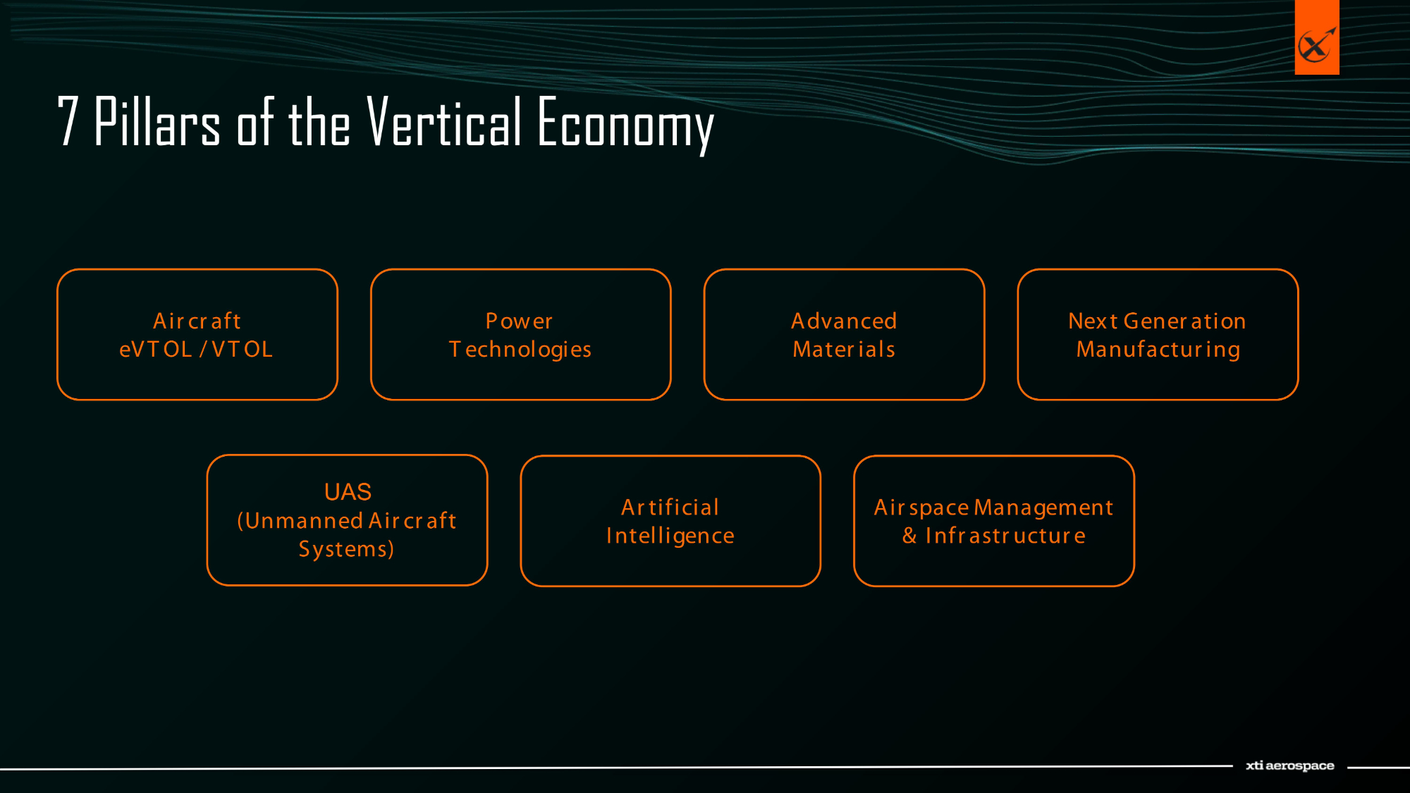 7 Pillars of the Vertical Economy UAS (Unmanned Aircraft Systems) Advanced Materials Next Generation Manufacturing Power Technologies Aircraft eVTOL / VTOL Artificial Intelligence Airspace Management & Infrastructure