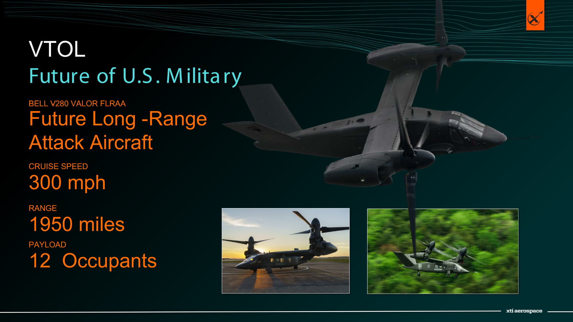 VTOL Future of U.S. Military CRUISE SPEED 300 mph RANGE 1950 miles PAYLOAD 12 Occupants Future Long - Range Attack Aircraft BELL V - 280 VALOR FLRAA