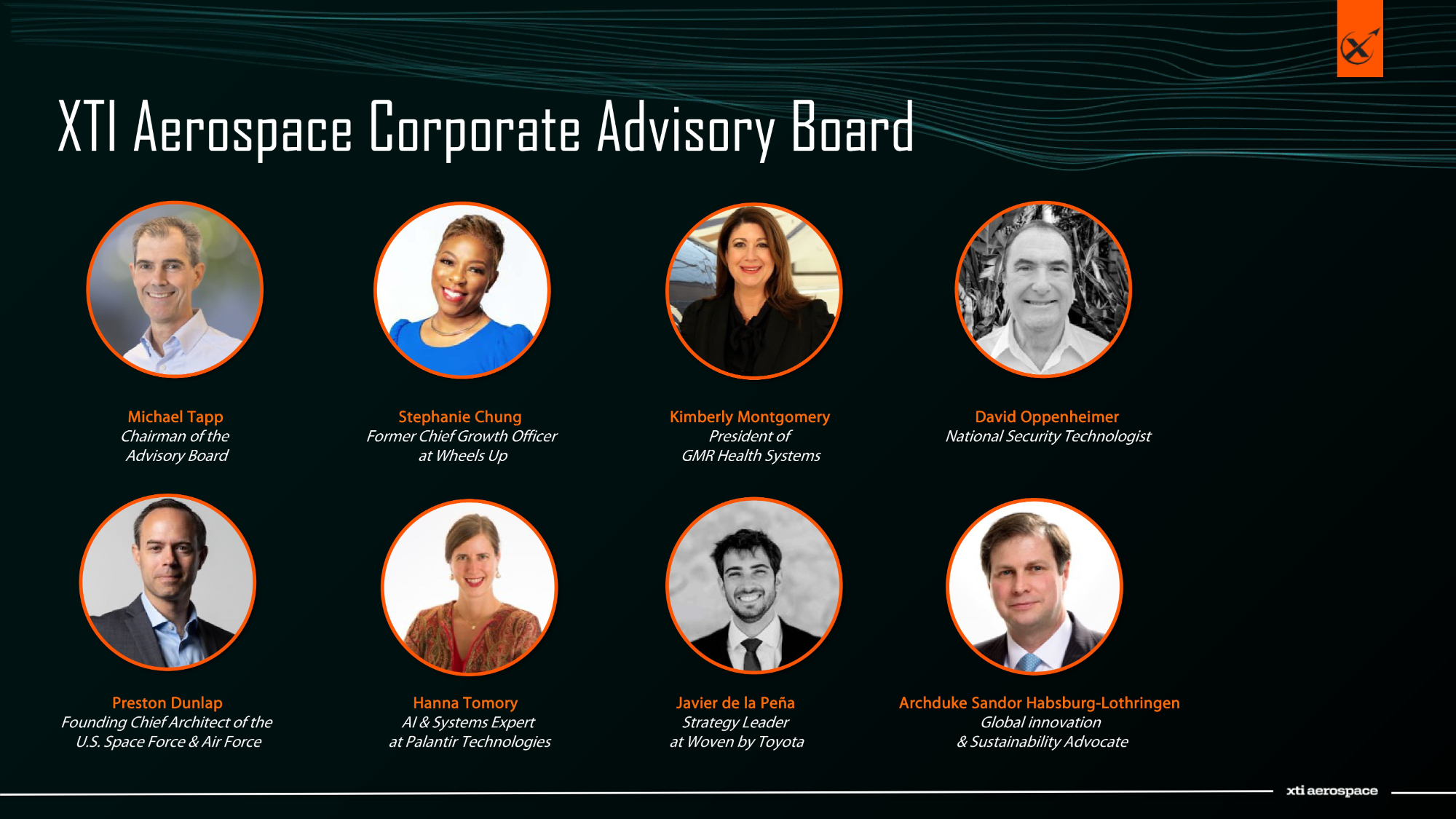 XTI Aerospace Corporate Advisory Board Michael Tapp Chairman of the Advisory Board Stephanie Chung Former Chief Growth Officer at Wheels Up Kimberly Montgomery President of GMR Health Systems David Oppenheimer National S ecurity Technologist Preston Dunlap Founding Chief Architect of the U.S. Space Force & Air Force Hanna Tomory AI & Systems E xpert at Palantir Technologies Javier de la Peña Strategy Leader at Woven by Toyota Archduke Sandor Habsburg - Lothringen Global innovation & S ustainability Advocate