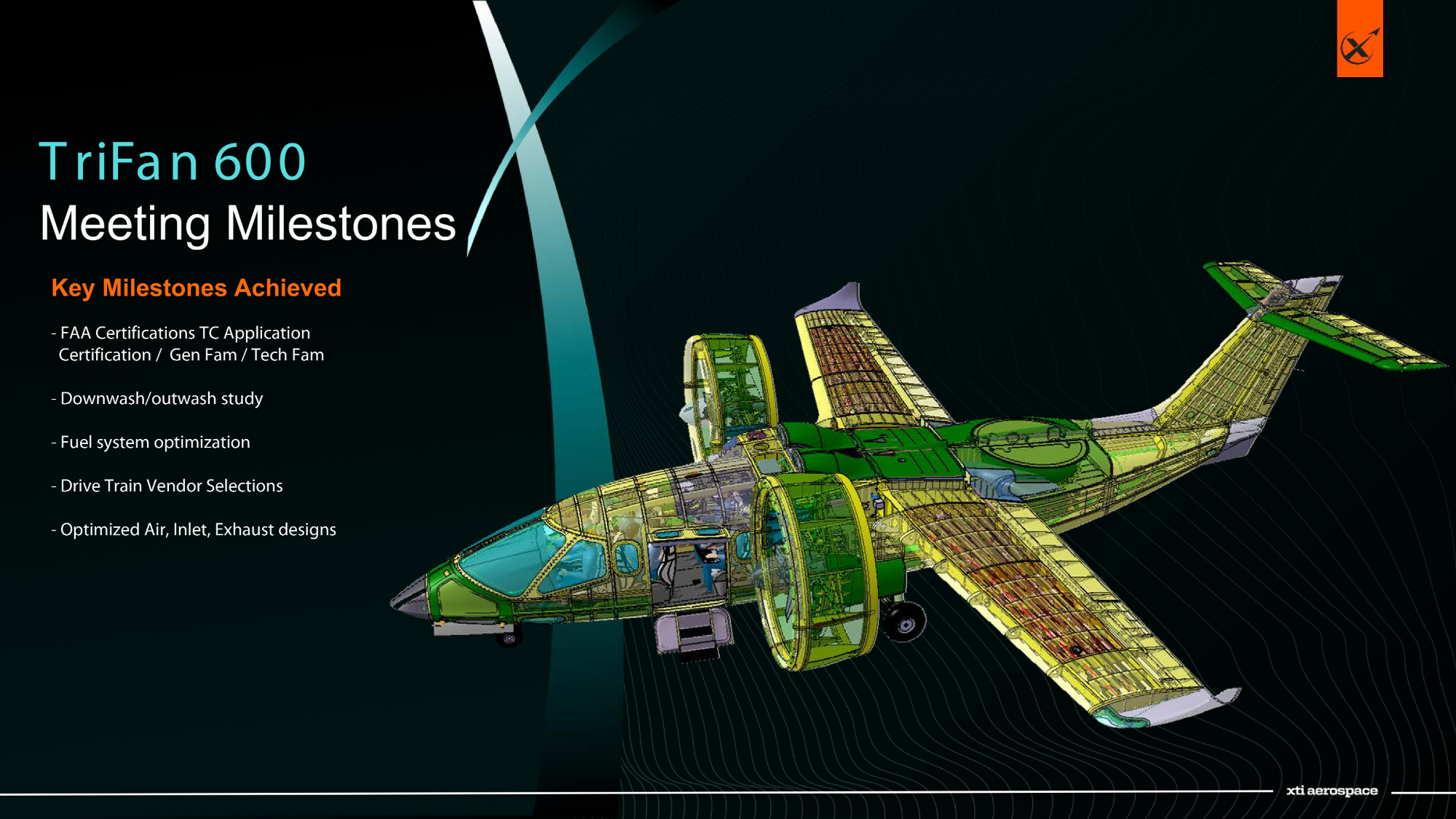 TriFan 600 Meeting Milestones Key Milestones Achieved - FAA Certifications TC Application Certification / Gen Fam / Tech Fam - Downwash/outwash study - Fuel system optimization - Drive Train Vendor Selections - Optimized Air, Inlet, Exhaust designs