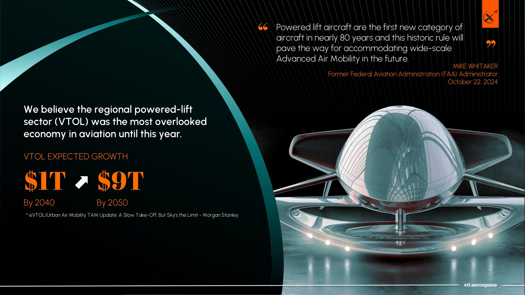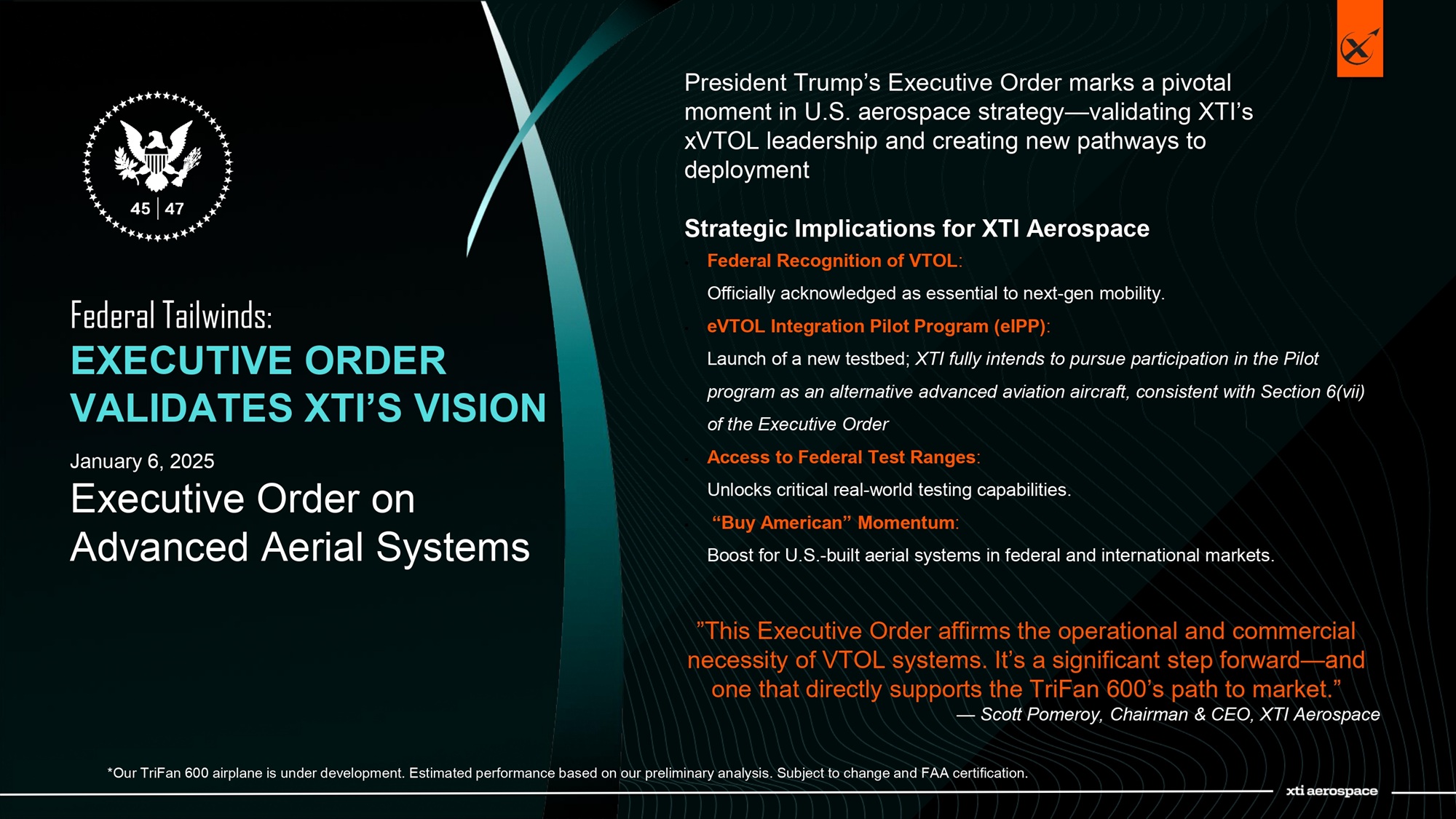 Federal Tailwinds: EXECUTIVE ORDER VALIDATES XTI’S VISION January 6, 2025 Executive Order on Advanced Aerial Systems Strategic Implications for XTI Aerospace ▪ Federal Recognition of VTOL : Officially acknowledged as essential to next - gen mobility. ▪ eVTOL Integration Pilot Program ( eIPP ) : Launch of a new testbed; XTI fully intends to pursue participation in the Pilot program as an alternative advanced aviation aircraft, consistent with Section 6(vii) of the Executive Order ▪ Access to Federal Test Ranges : Unlocks critical real - world testing capabilities. ▪ “Buy American” Momentum : Boost for U.S. - built aerial systems in federal and international markets. President Trump’s Executive Order marks a pivotal moment in U.S. aerospace strategy — validating XTI’s xVTOL leadership and creating new pathways to deployment ”This Executive Order affirms the operational and commercial necessity of VTOL systems. It’s a significant step forward — and one that directly supports the TriFan 600’s path to market.” — Scott Pomeroy, Chairman & CEO, XTI Aerospace *Our TriFan 600 airplane is under development. Estimated performance based on our preliminary analysis. Subject to change and FA A certification.