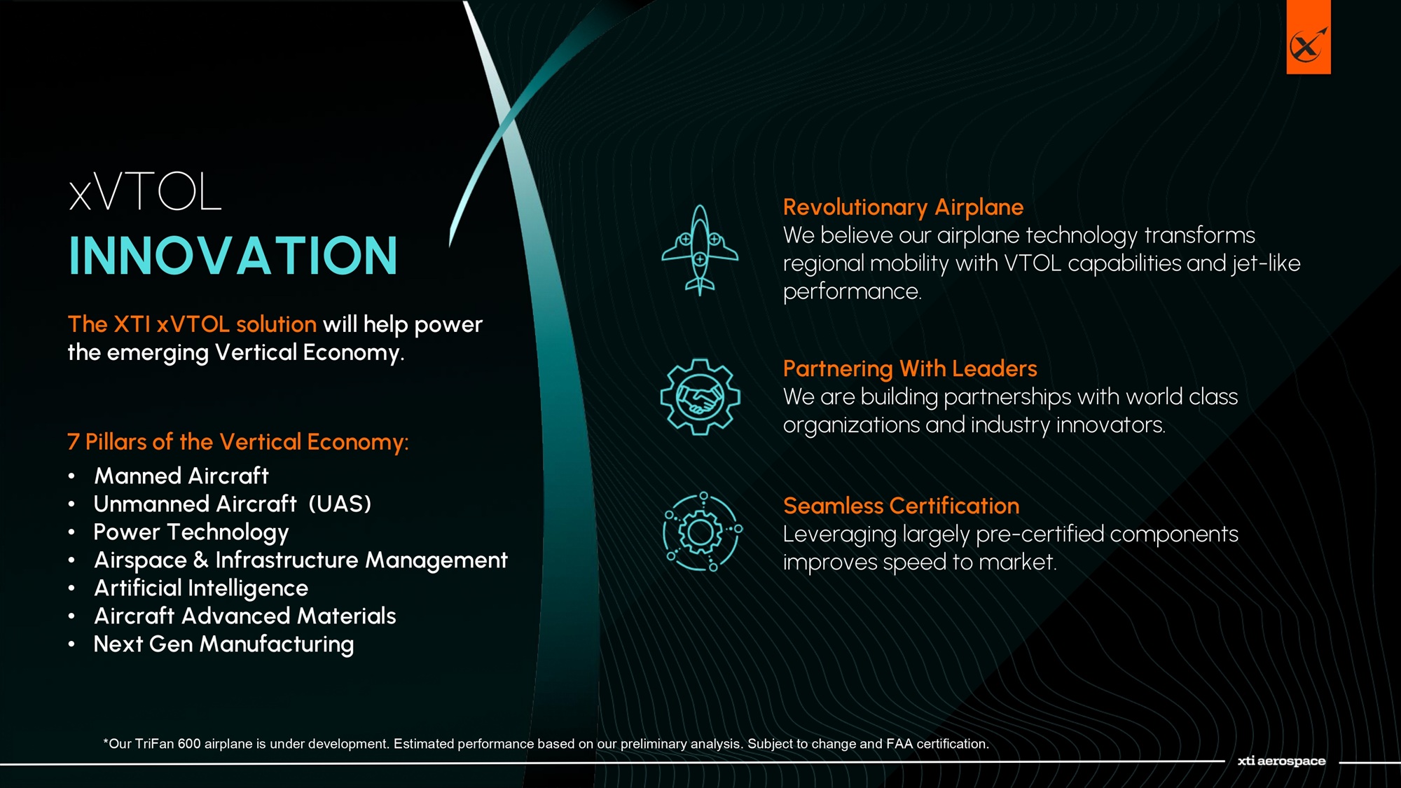 xVTOL INNOVATION The XTI xVTOL solution will help power the emerging Vertical Economy. 7 Pillars of the Vertical Economy: • Manned Aircraft • Unmanned Aircraft (UAS) • Power Technology • Airspace & Infrastructure Management • Artificial Intelligence • Aircraft Advanced Materials • Next Gen Manufacturing Partnering With Leaders We are building partnerships with world class organizations and industry innovators. Revolutionary Airplane We believe our airplane technology transforms regional mobility with VTOL capabilities and jet - like performance. Seamless Certification Leveraging largely pre - certified components improves speed to market. *Our TriFan 600 airplane is under development. Estimated performance based on our preliminary analysis. Subject to change and FA A certification.