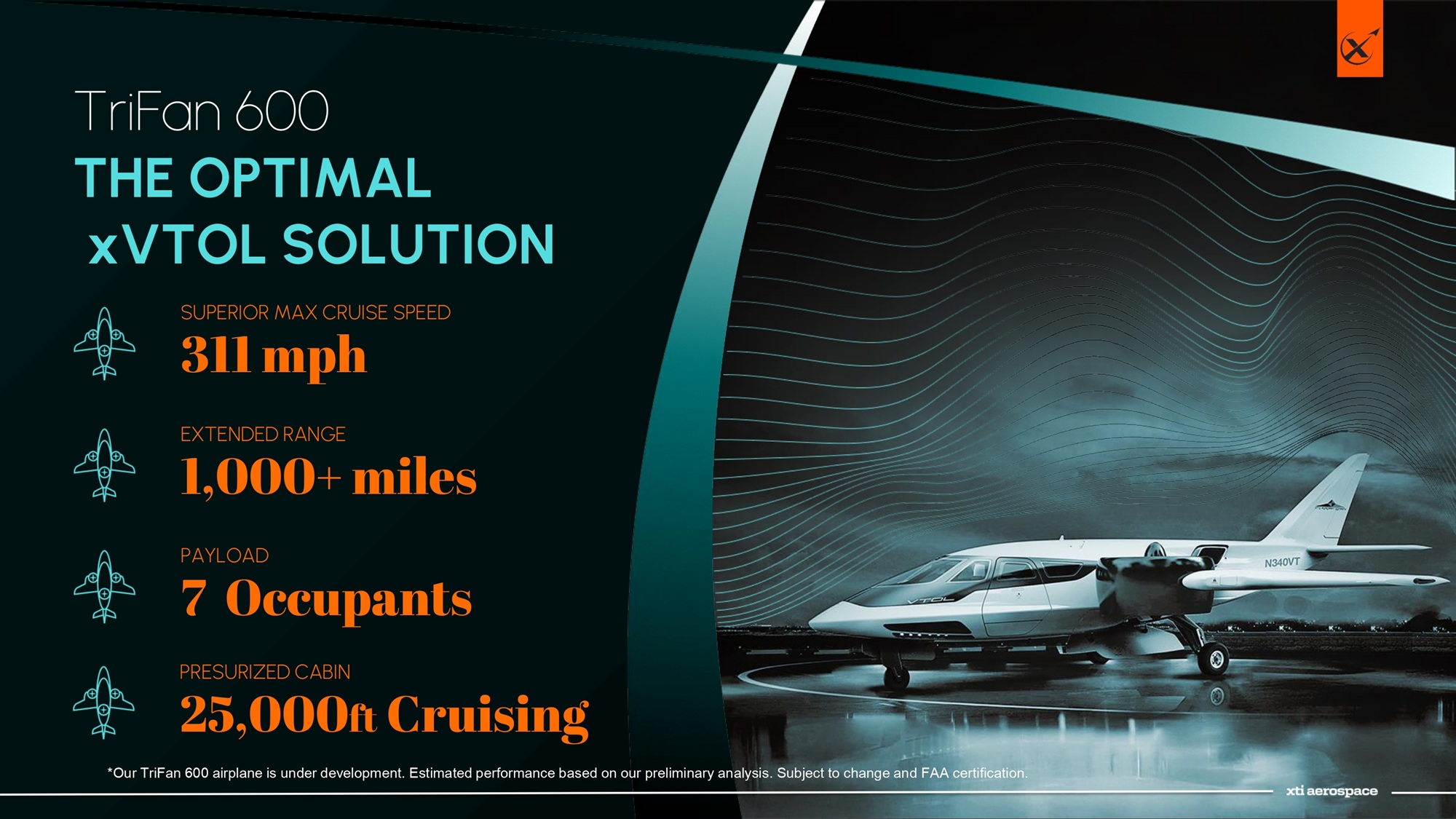 XTI xVTOL FUTURE PRODUCT FAMILY Autonomous / Cargo 2 - 4 Seat Payload All Electric Hybrid - electric Military / Government 8 - 12 Seat Payload Cargo *Our TriFan 600 airplane is under development. Estimated performance based on our preliminary analysis. Subject to change and FA A certification.
