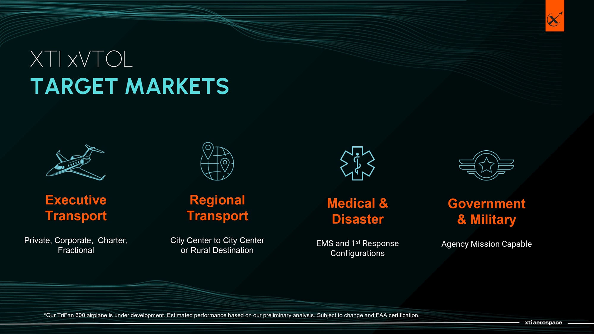 XTI xVTOL TARGET MARKETS Executive Transport Private, Corporate, Charter, Fractional *Our TriFan 600 airplane is under development. Estimated performance based on our preliminary analysis. Subject to change and FA A certification. Regional Transport City Center to City Center or Rural Destination Medical & Disaster EMS and 1 st Response Configurations Government & Military Agency Mission Capable