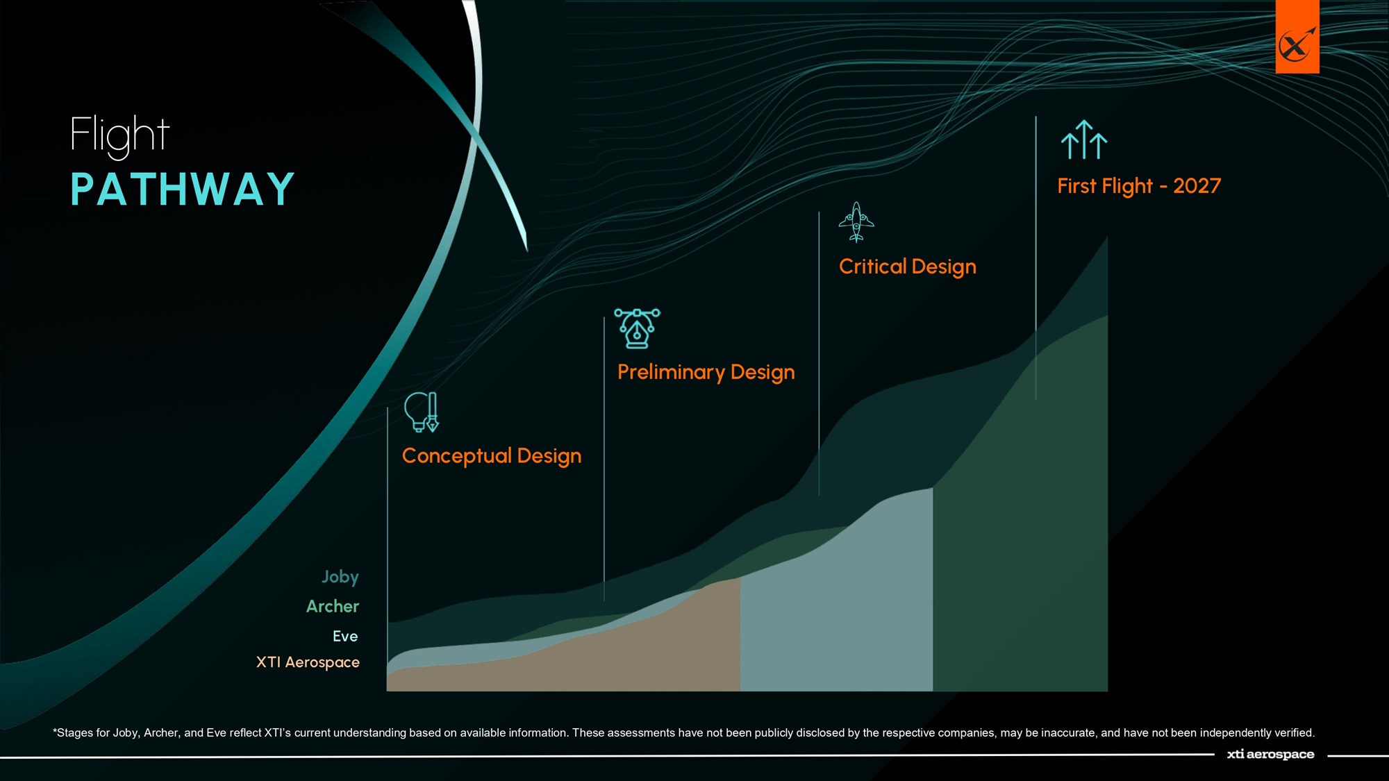 Flight PATHWAY Conceptual Design Preliminary Design Critical Design First Flight - 2027 Joby Archer XTI Aerospace Eve *Stages for Joby, Archer, and Eve reflect XTI’s current understanding based on available information. These assessments have not been publicly disclosed by the respective companies, may be inaccurate, and have not been independently verified.