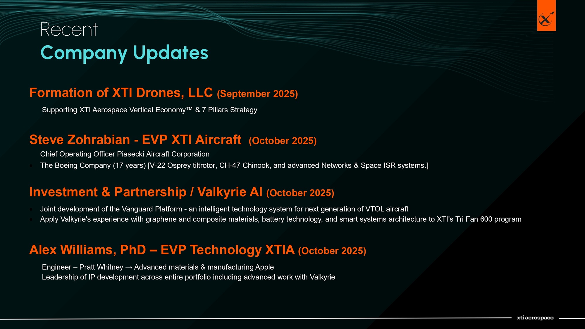 Formation of XTI Drones, LLC ( September 20 25) Supporting XTI Aerospace Vertical Economy & 7 Pillars Strategy Steve Zohrabian - EVP XTI Aircraft ( October 2025 ) Chief Operating Officer Piasecki Aircraft Corporation  The Boeing Company (17 years) [V - 22 Osprey tiltrotor, CH - 47 Chinook, and advanced Networks & Space ISR systems.] Investment & Partnership / Valkyrie AI ( October 2025 )  J oint development of the Vanguard Platform - an intelligent technology system for next generation of VTOL aircraft  A pply Valkyrie's experience with graphene and composite materials, battery technology, and smart systems architecture to XTI's Tr i Fan 600 program Alex Williams, PhD – EVP Technology XTIA (October 2025) Engineer – Pratt Whitney → Advanced materials & manufacturing Apple Leadership of IP development across entire portfolio including advanced work with Valkyrie Recent Company Updates